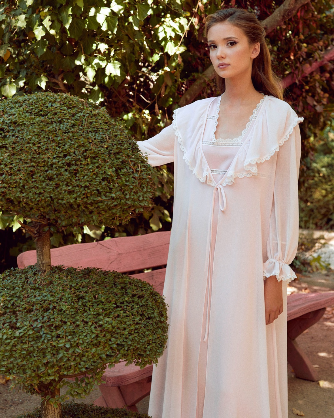 Camisón largo en rosa empolvado con encajes y volantes delicados. Suave, fantasioso y