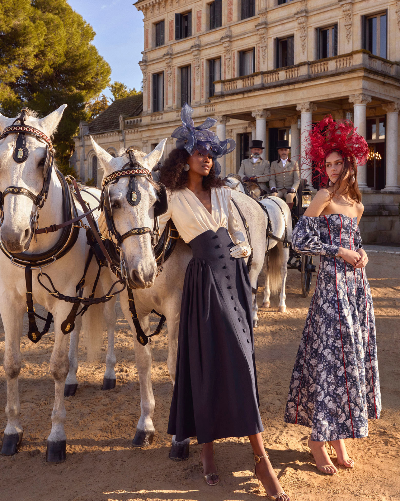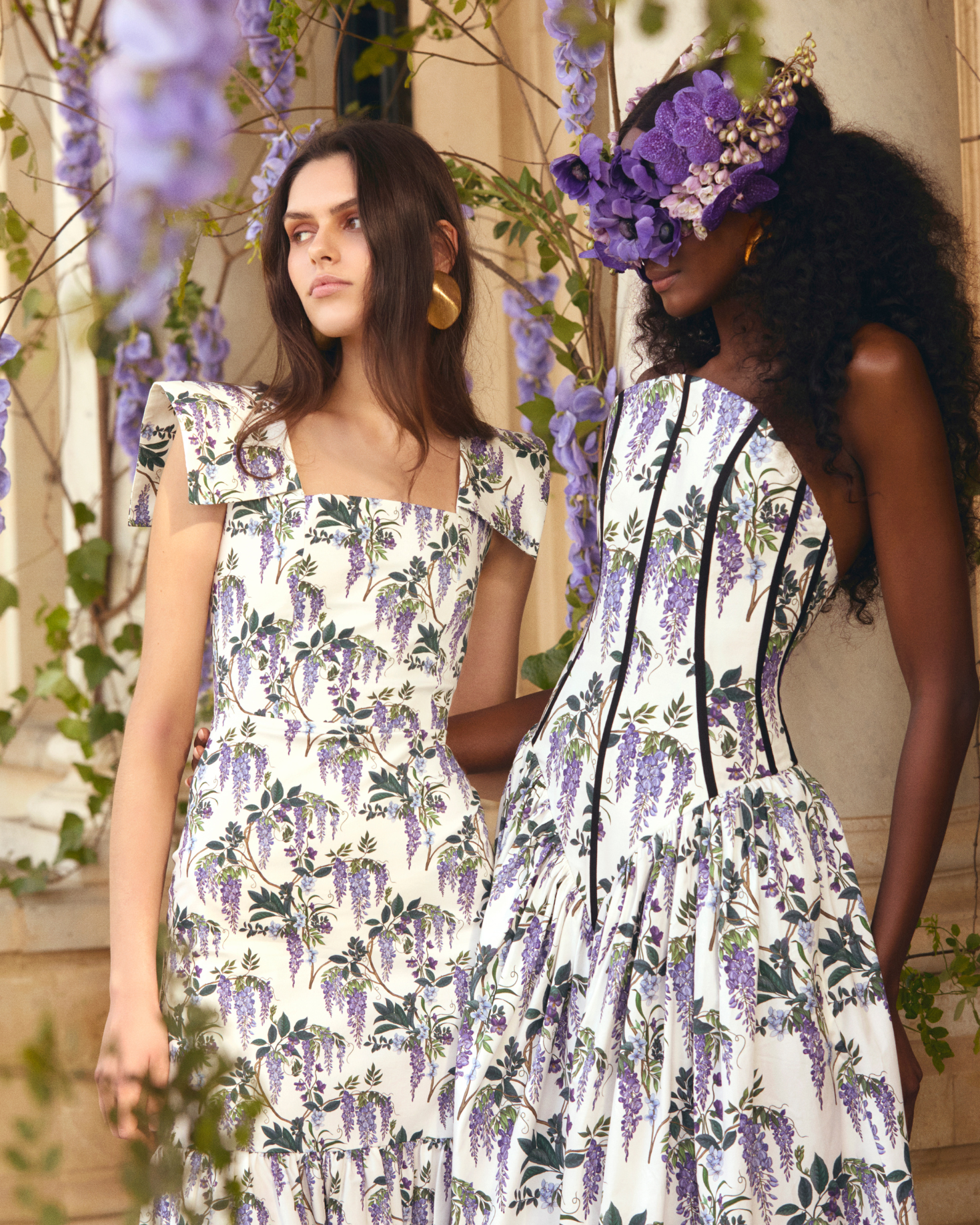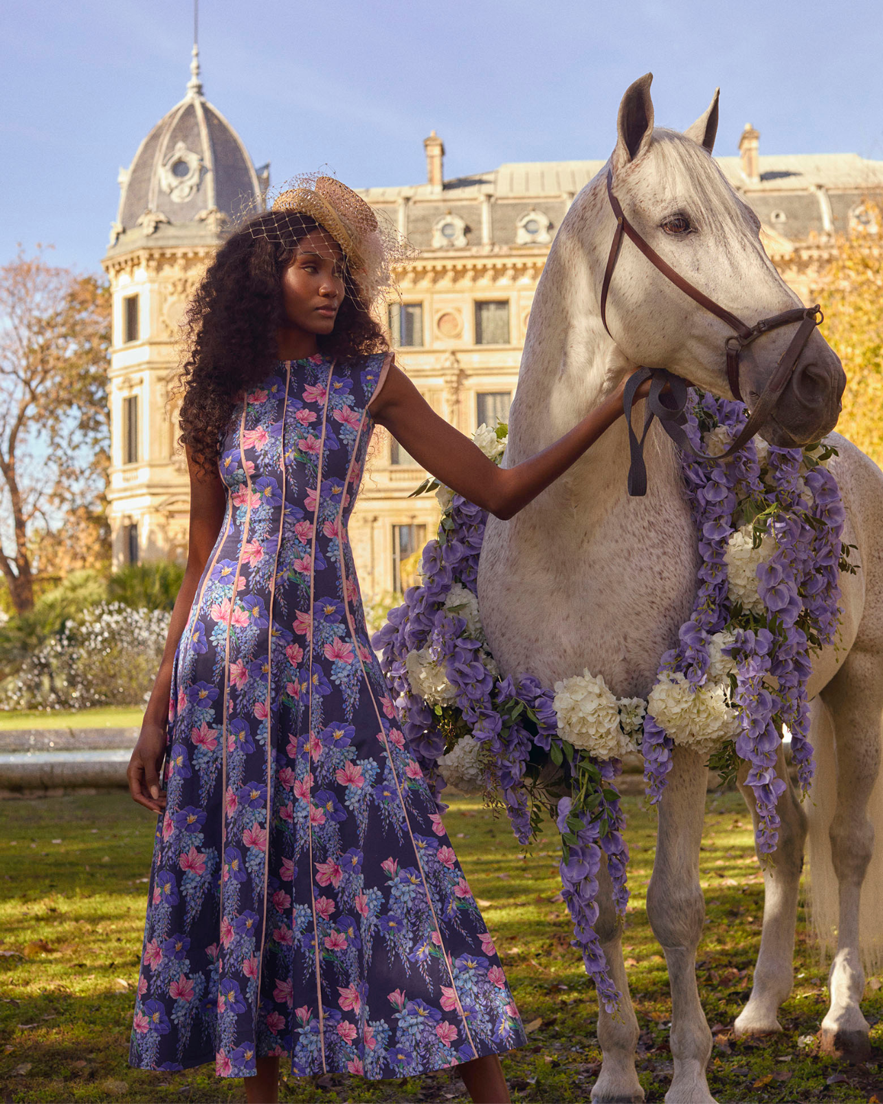 Estampados florales creados en exclusiva, delicados toile de jouy, vivos a contraste y una paleta cromática que transita entre azules empolvados, verdes profundos, rosados suaves y tonos joya dan forma a una propuesta que respira lujo sereno y romanticismo moderno.