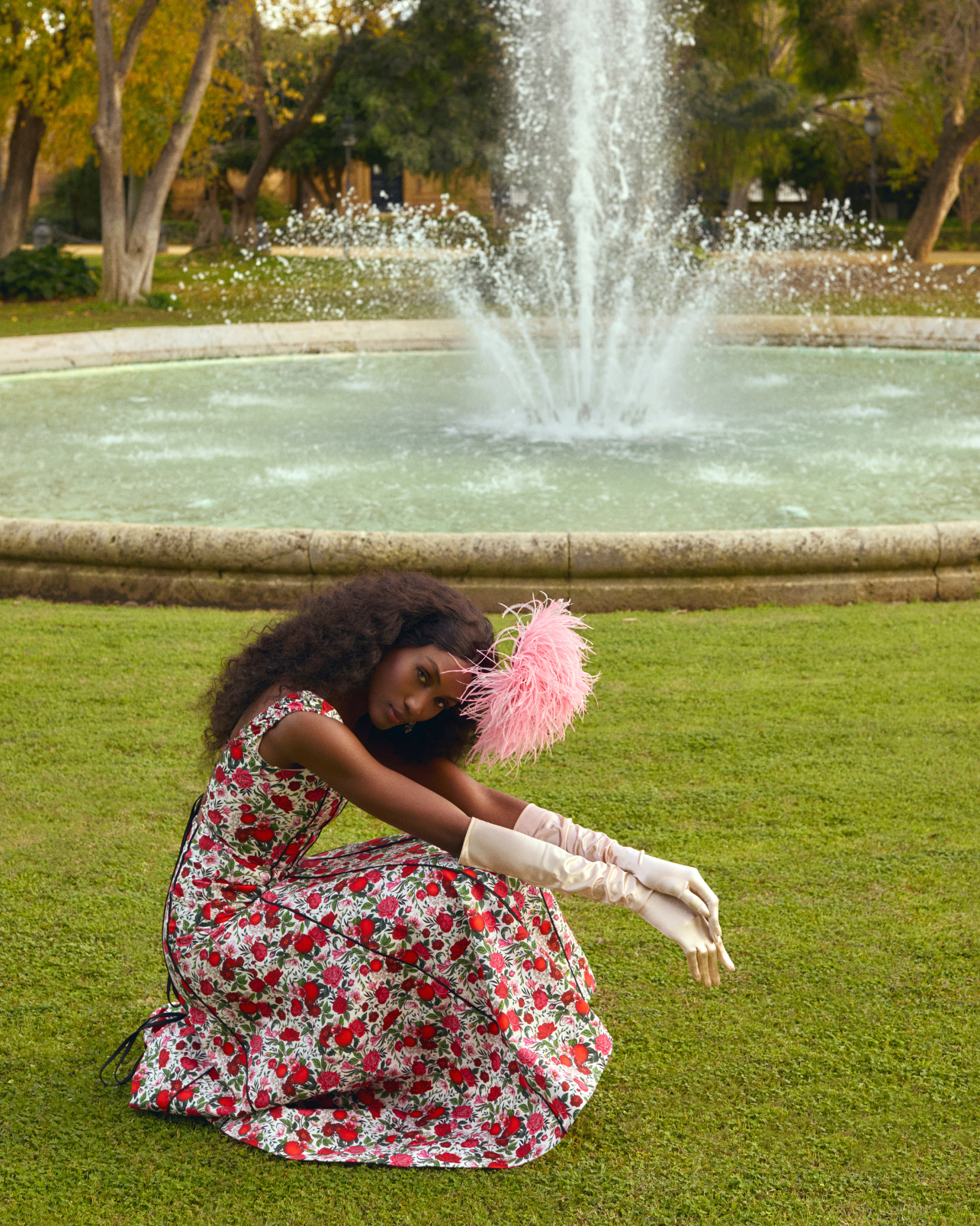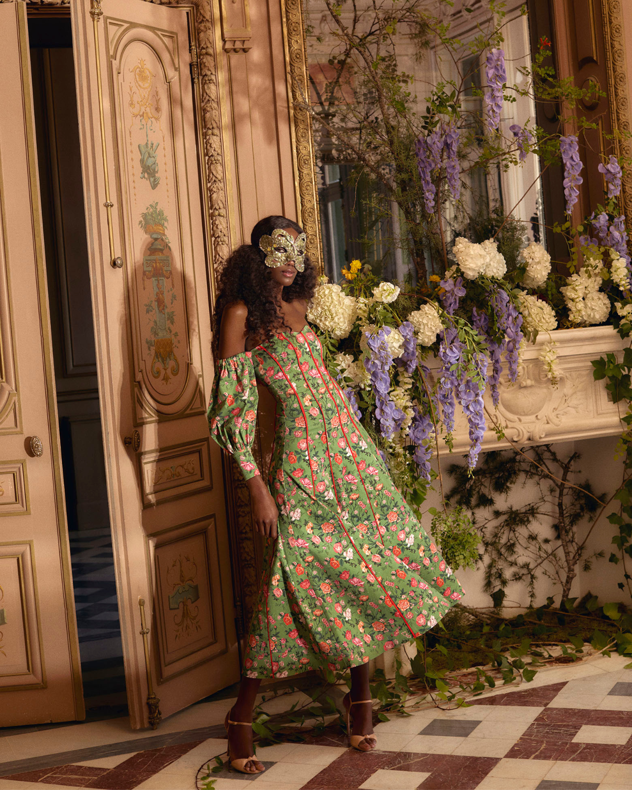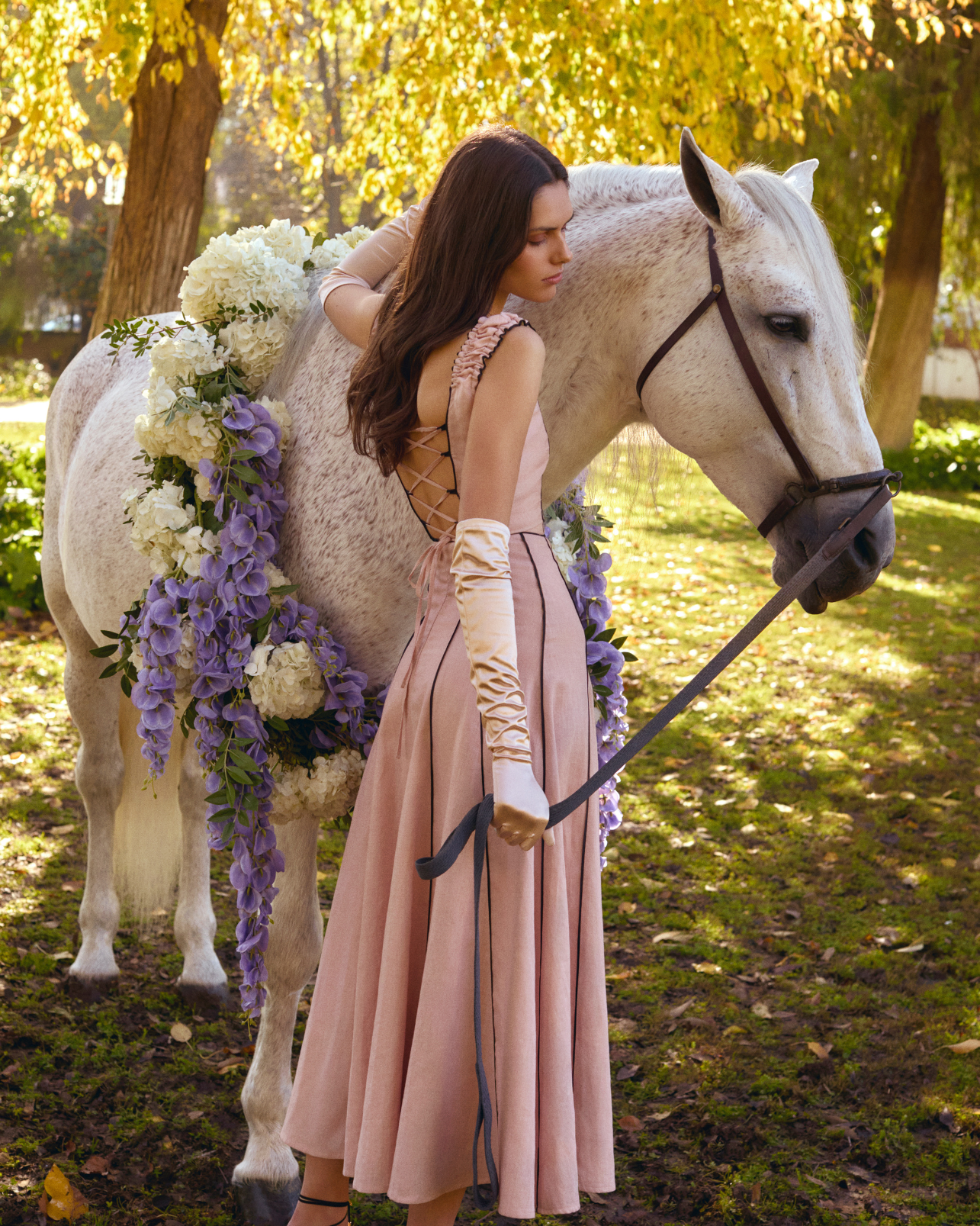 Estampados florales creados en exclusiva, delicados toile de jouy, vivos a contraste y una paleta cromática que transita entre azules empolvados, verdes profundos, rosados suaves y tonos joya dan forma a una propuesta que respira lujo sereno y romanticismo moderno.