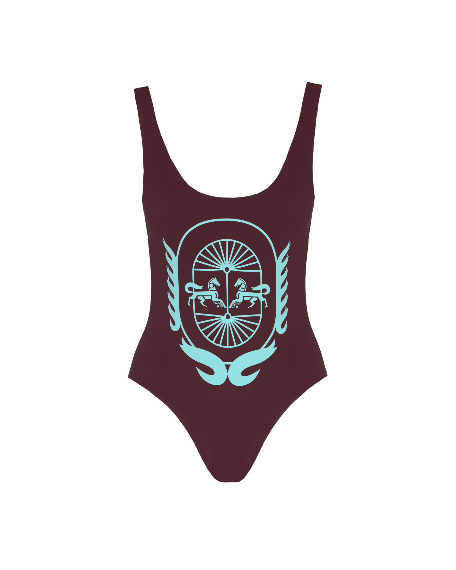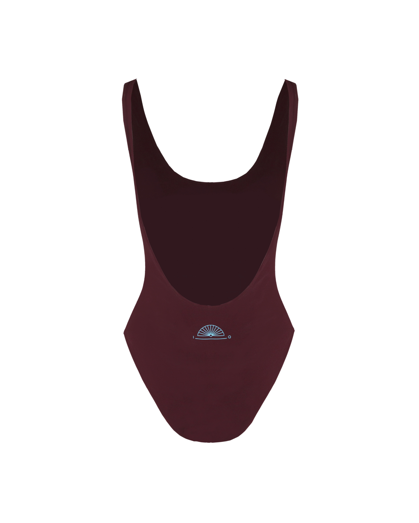 Burgundy one-piece swimsuit with IQ graphic print in turquoise. Designed with open back and round front neckline With a high-leg silhouette. Logo detail on the back. The double-knit construction offers fit, comfort, and durability for continued wear.
