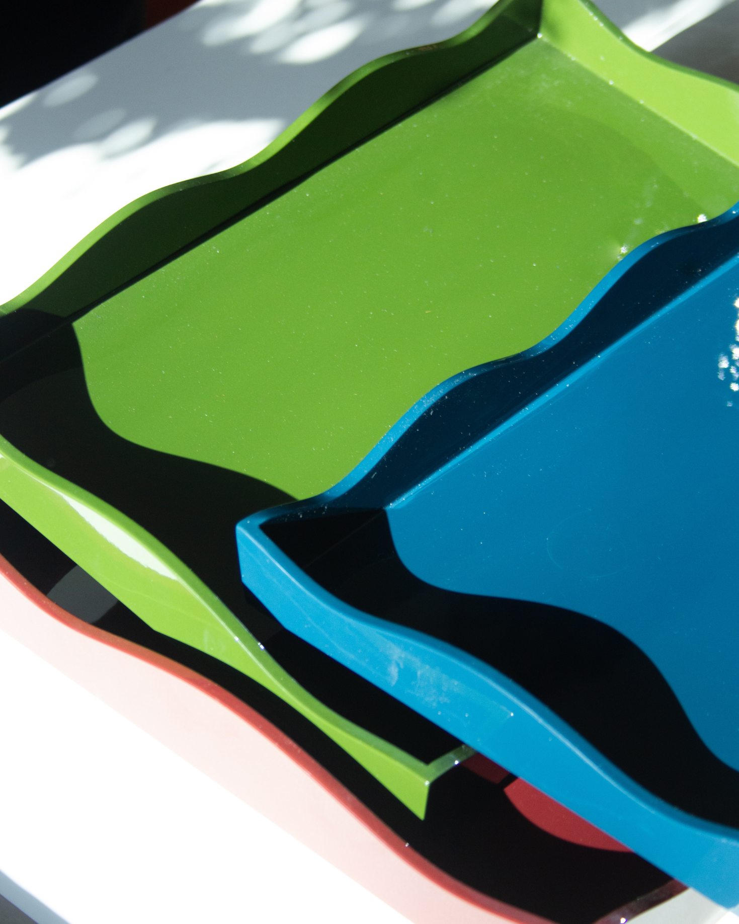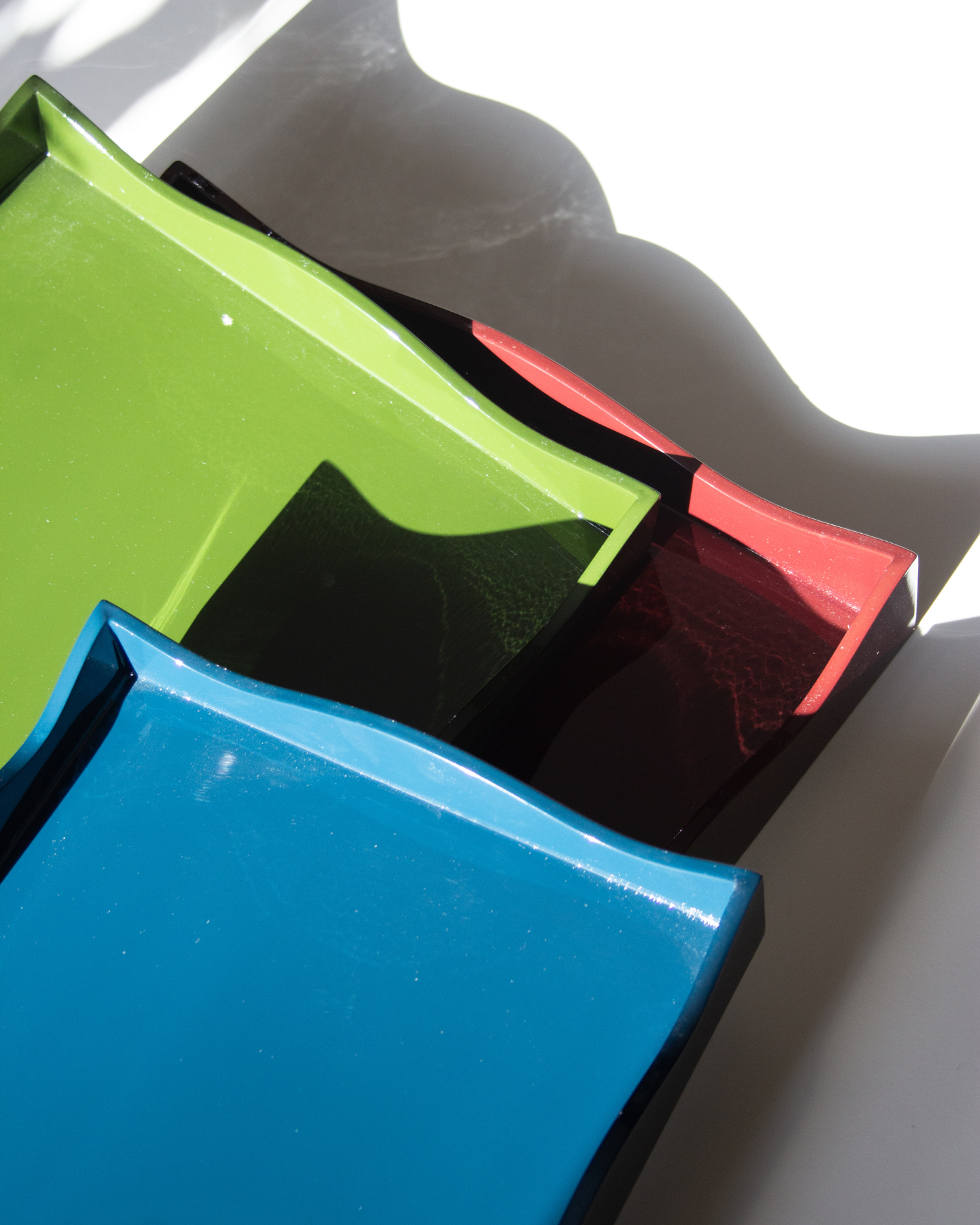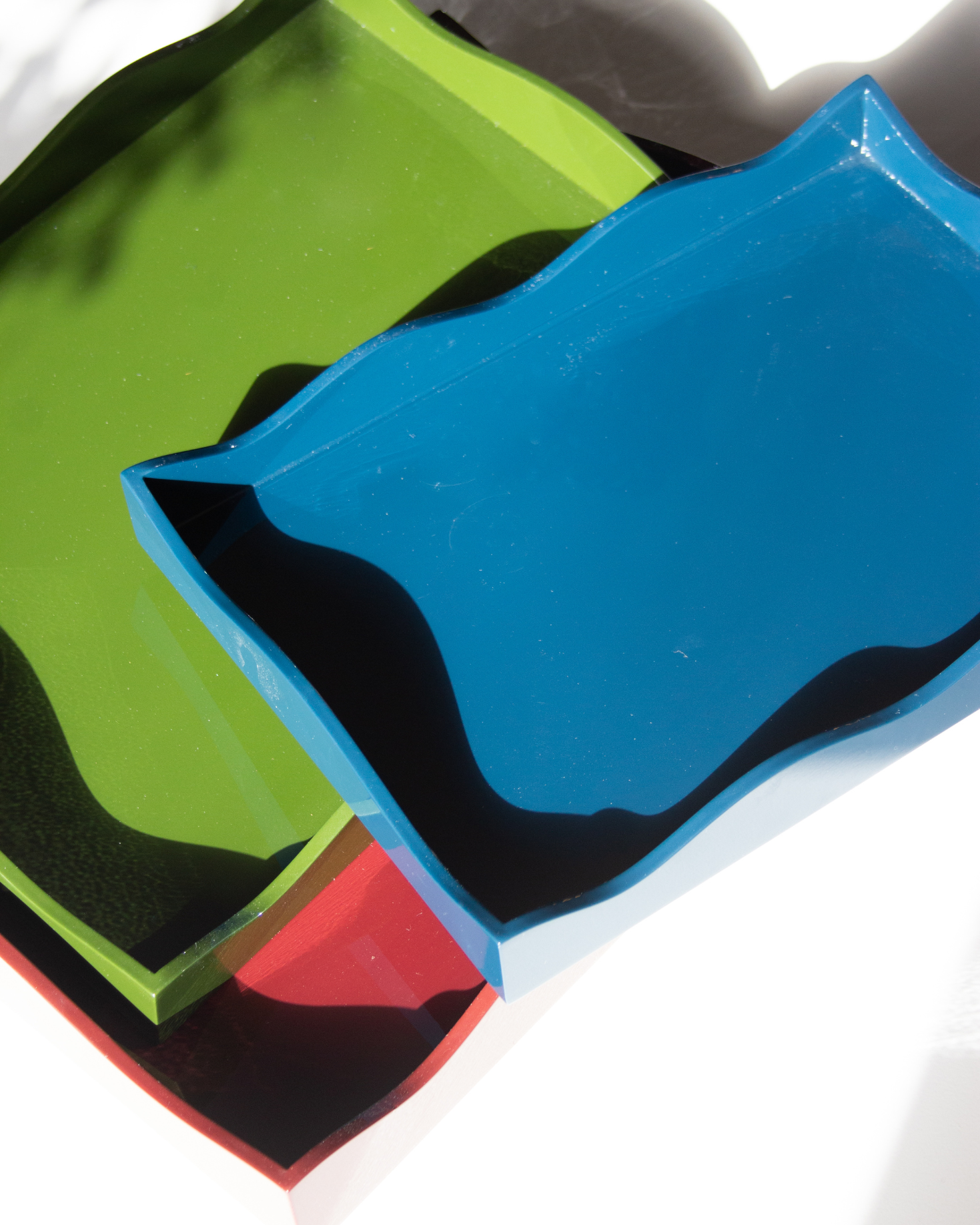 Small rectangular tray made of blue lacquered bamboo with decorative wavy edge. Available in other sizes and colours.