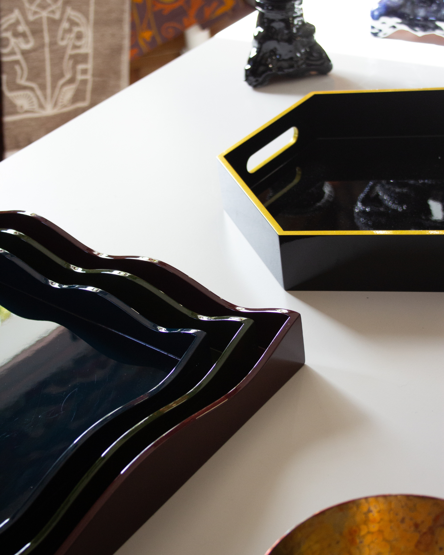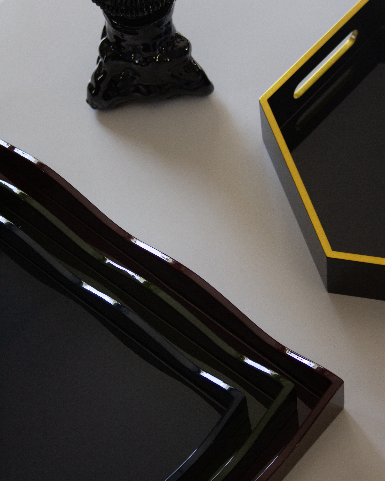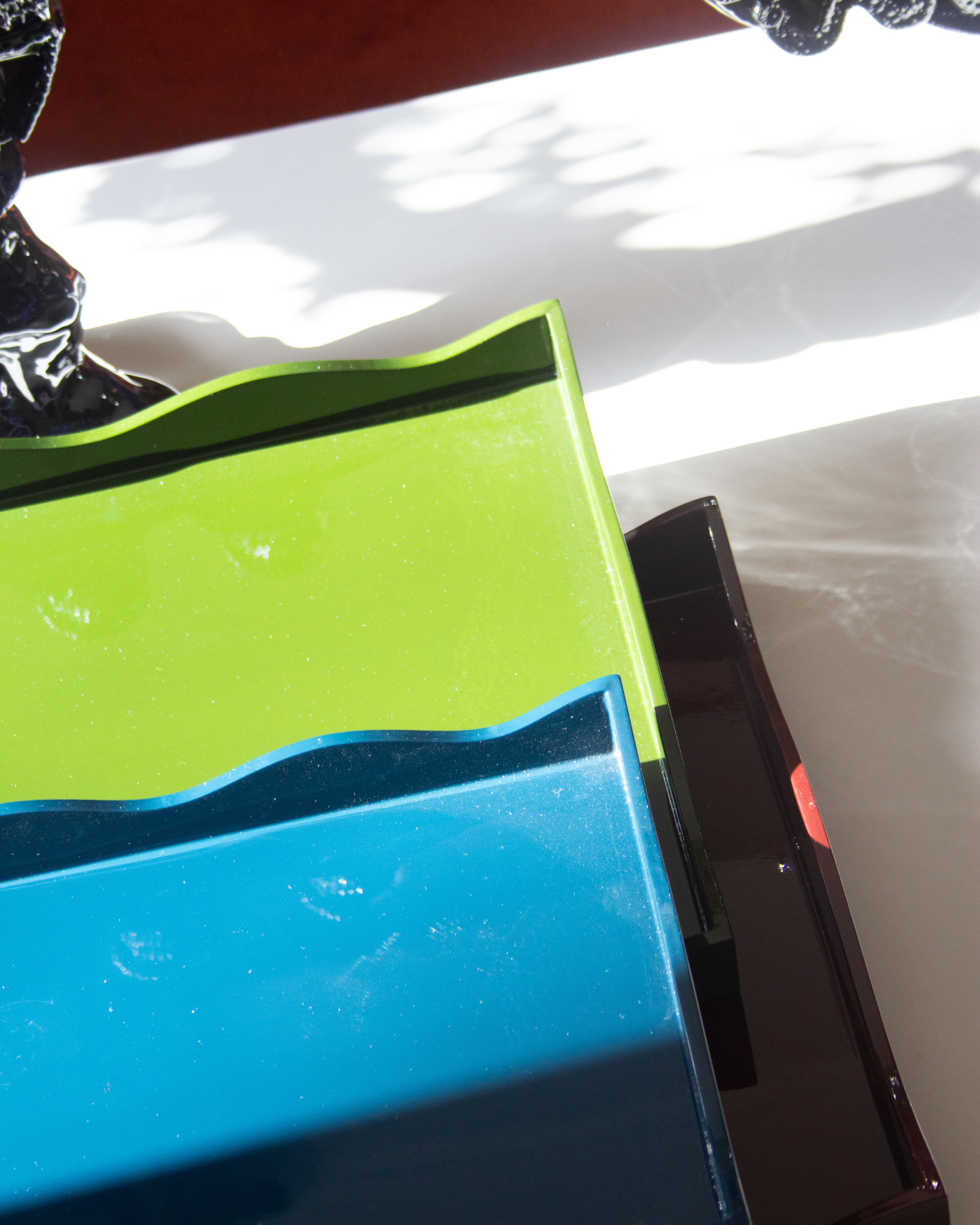 Small rectangular tray made of blue lacquered bamboo with decorative wavy edge. Available in other sizes and colours.