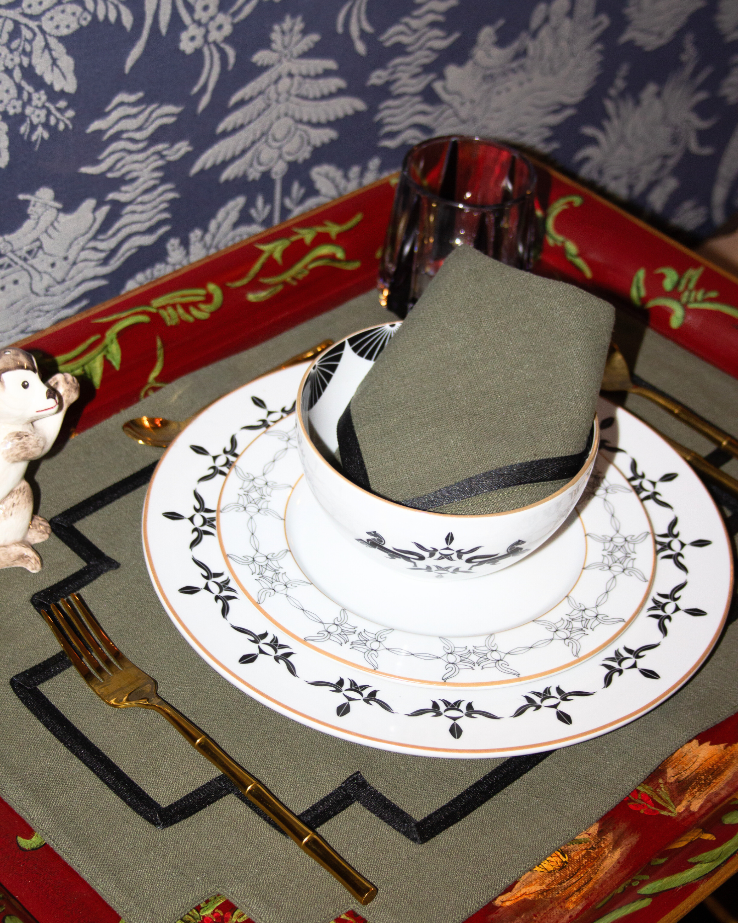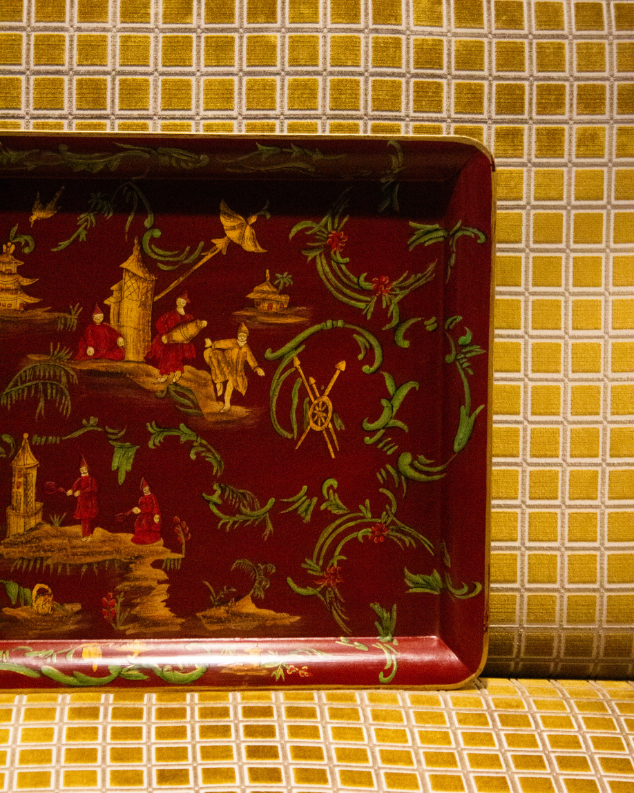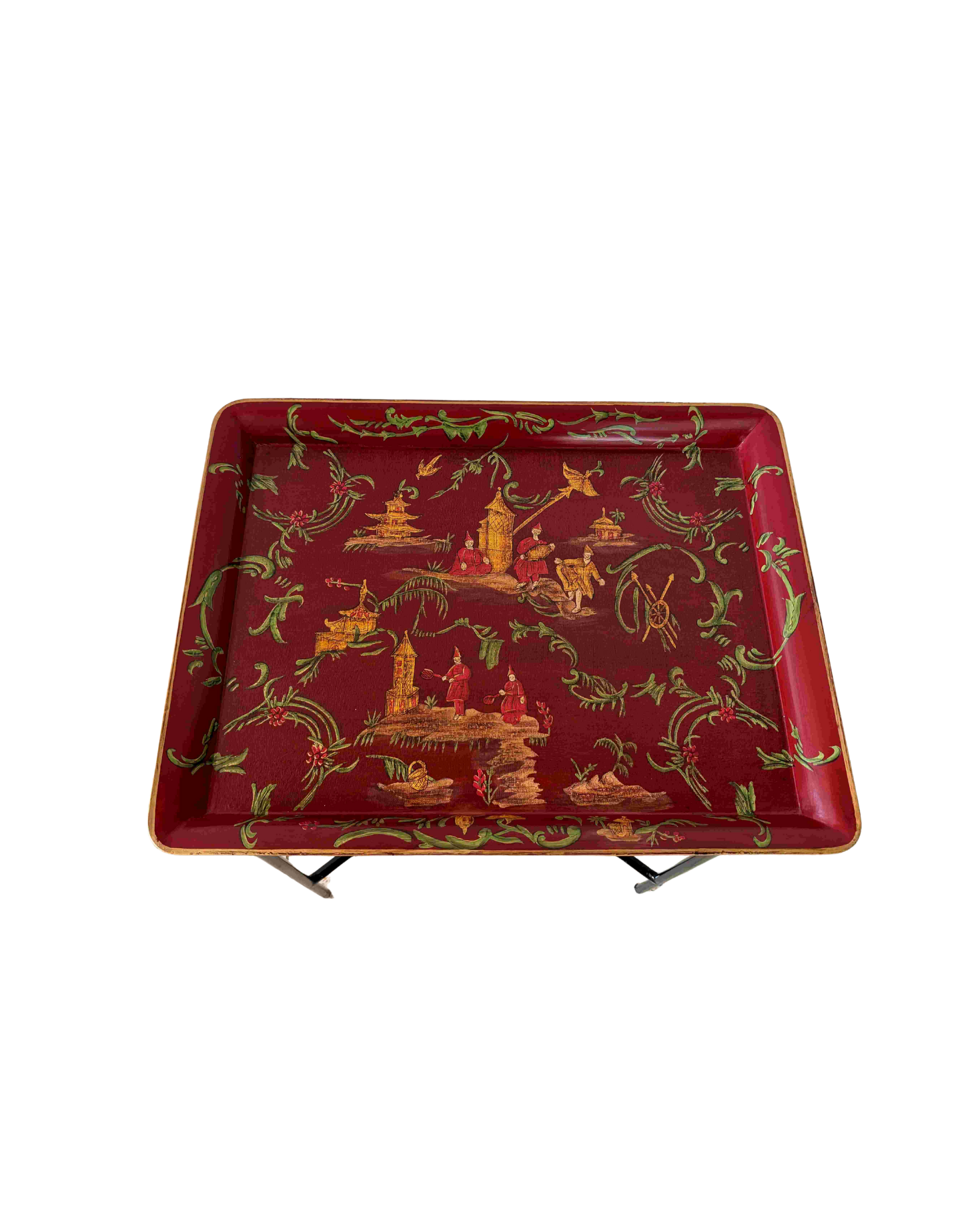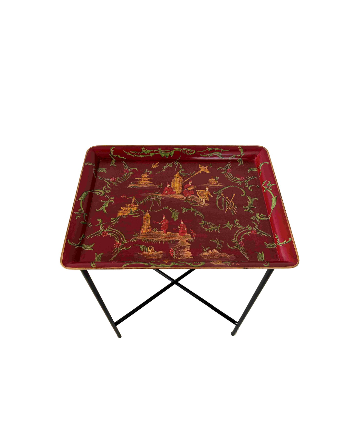 Tray Rectangular metal frame with legs, small in size. Burgundy background with gold and green illustration and details.
