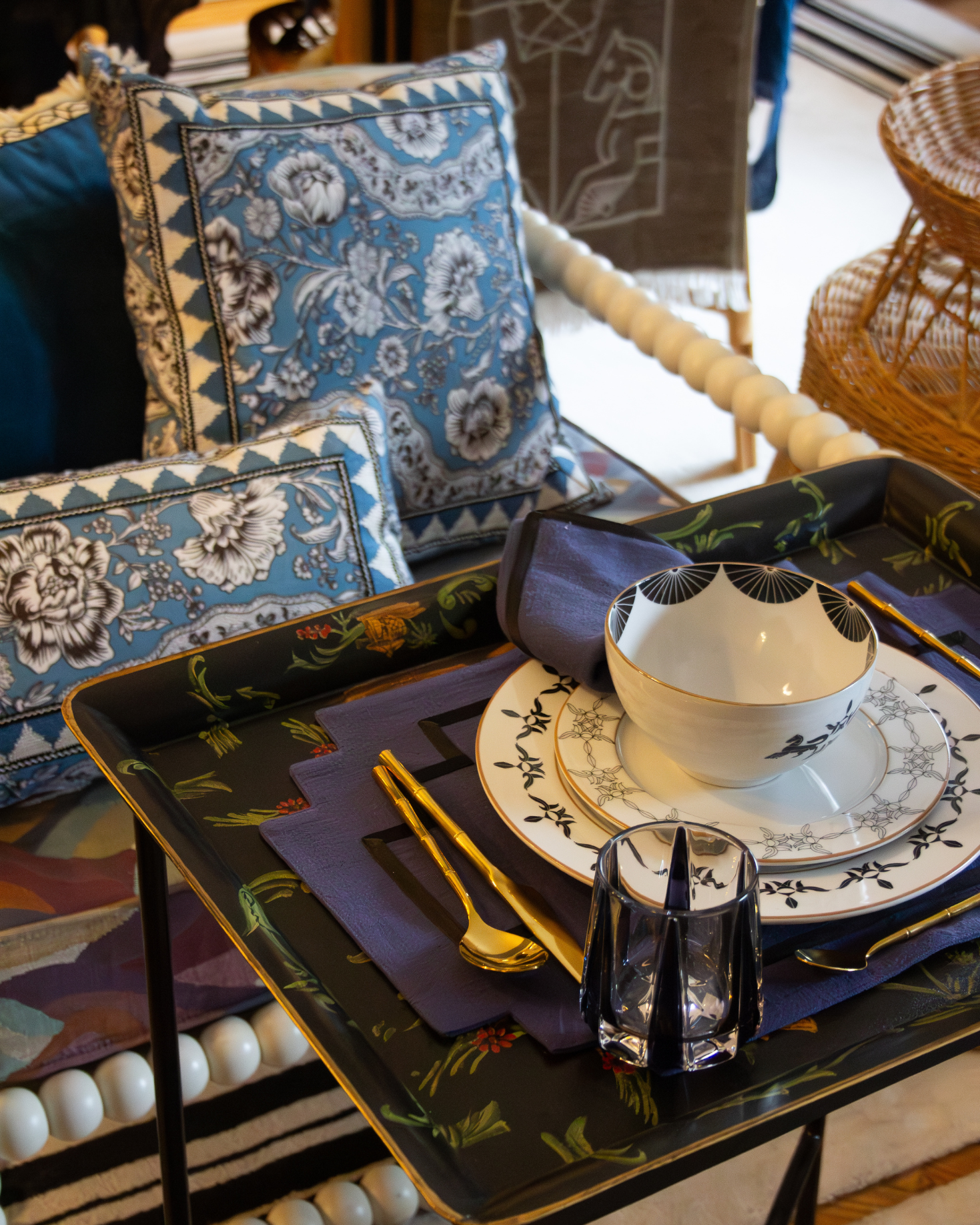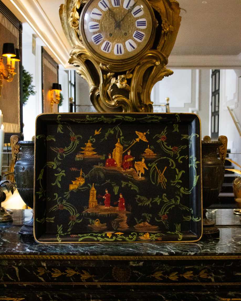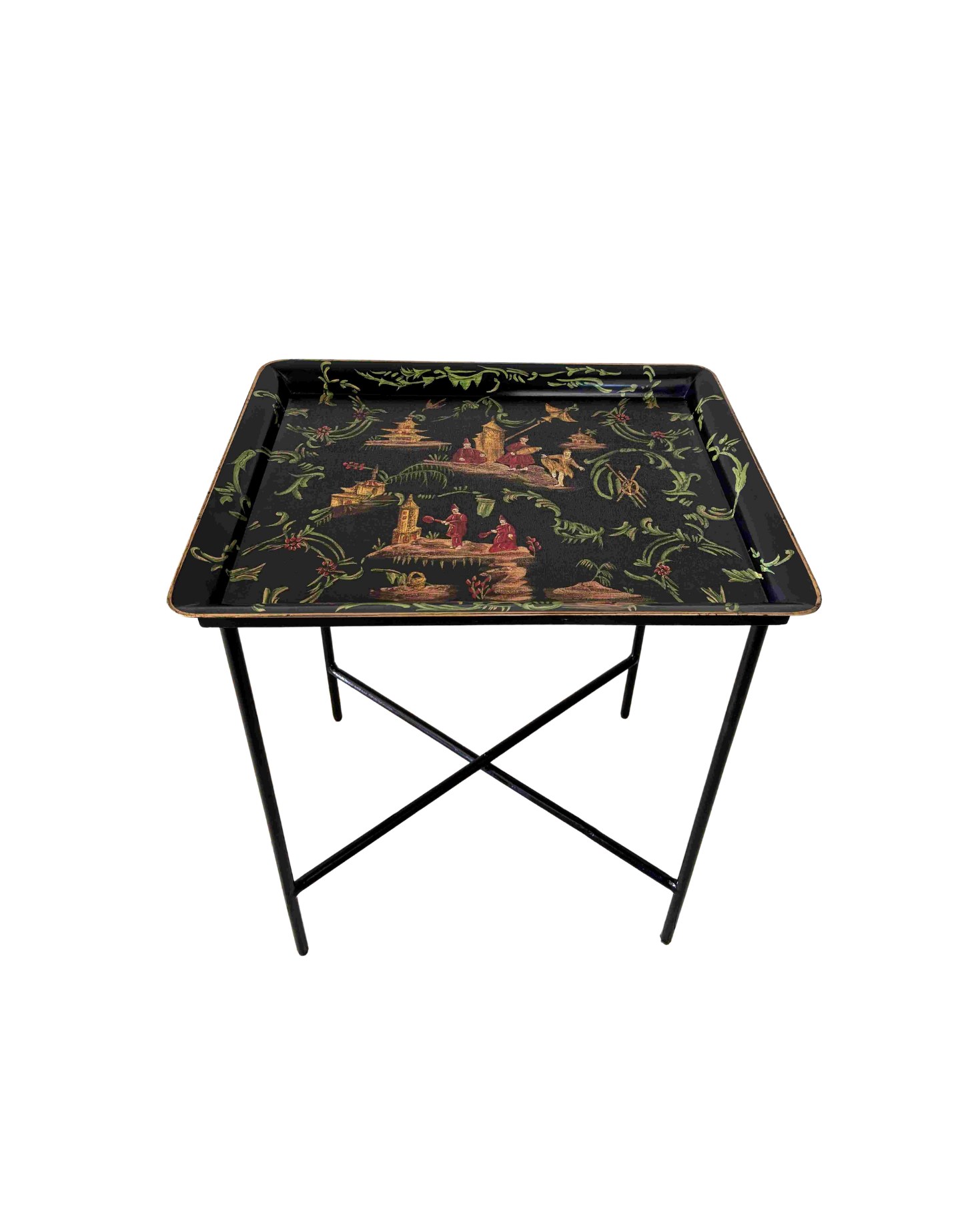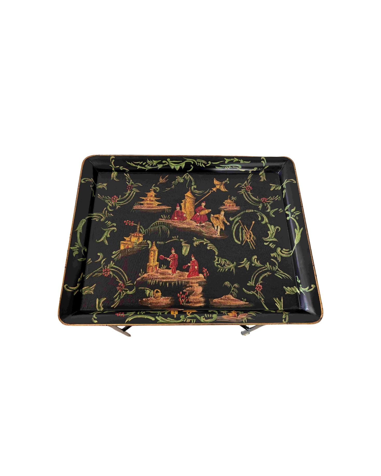 Tray Rectangular metal frame with legs, small in size. Black background with gold and green illustration and details.
