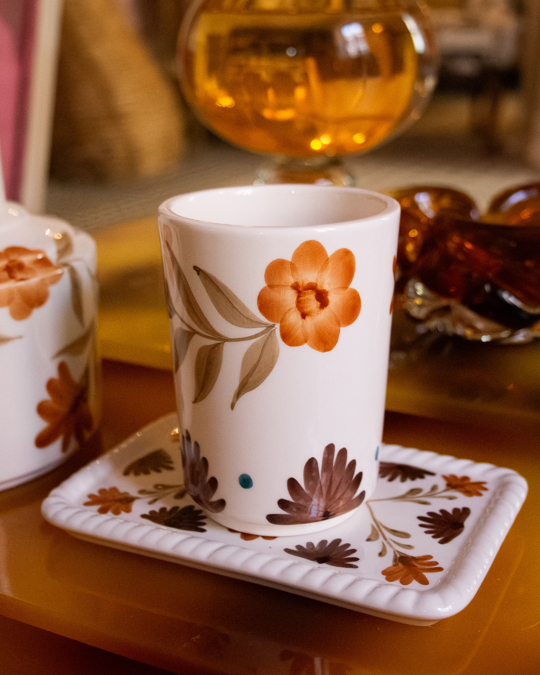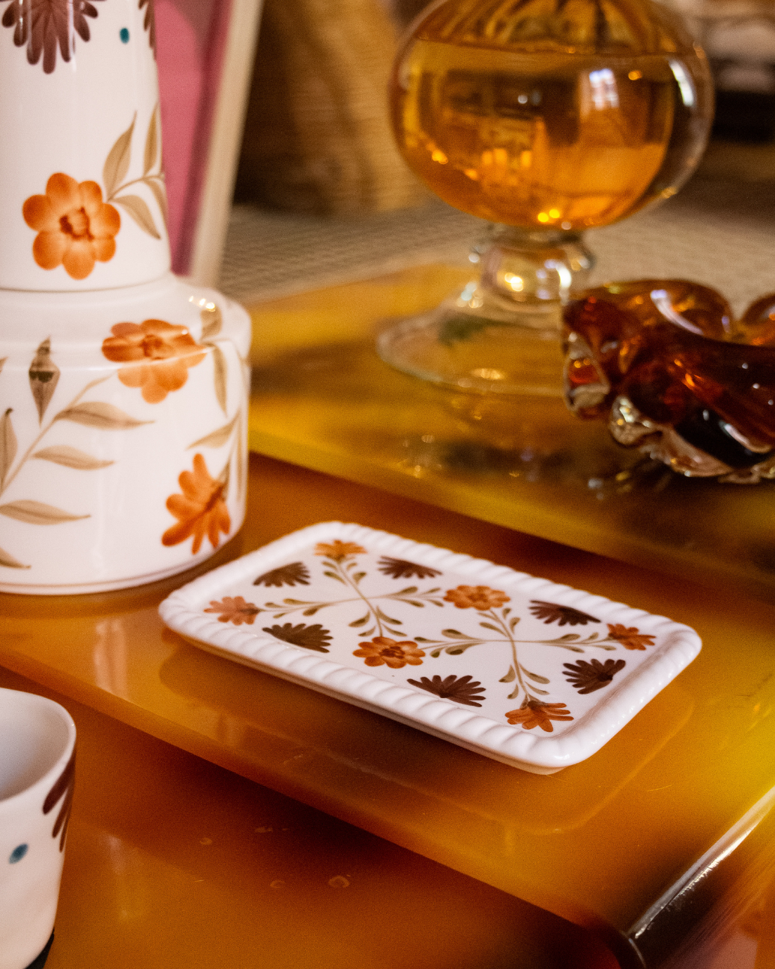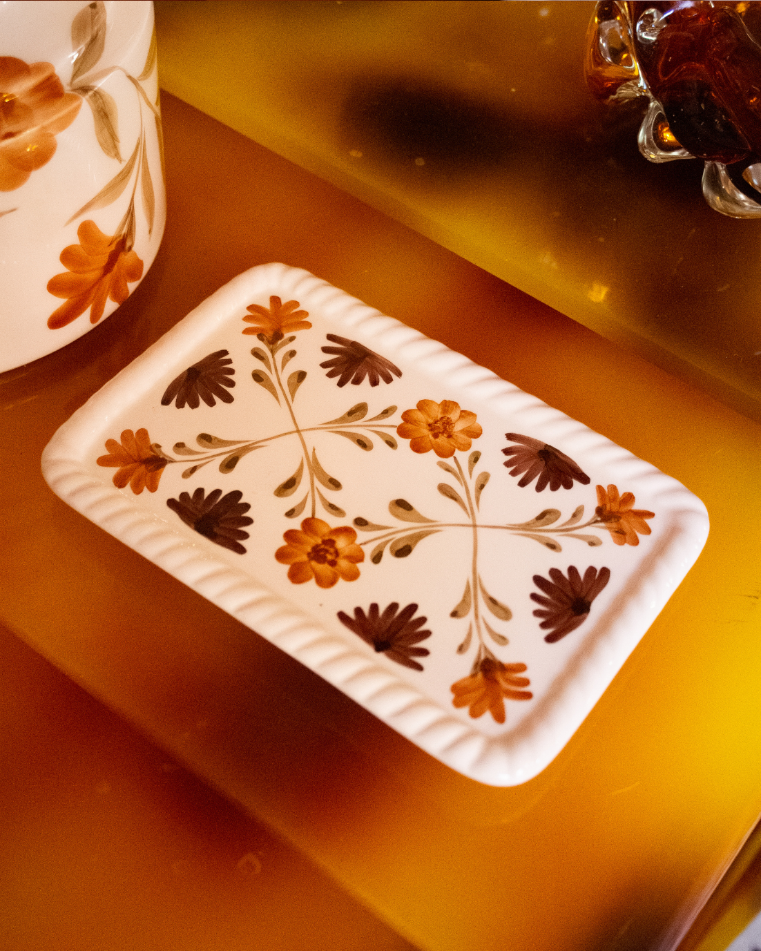 Bandeja rectangular pequeña hecha en cerámica pintada a mano en tonos terracota y marrón con detalles florales. También disponible en tonos verdes y azules.