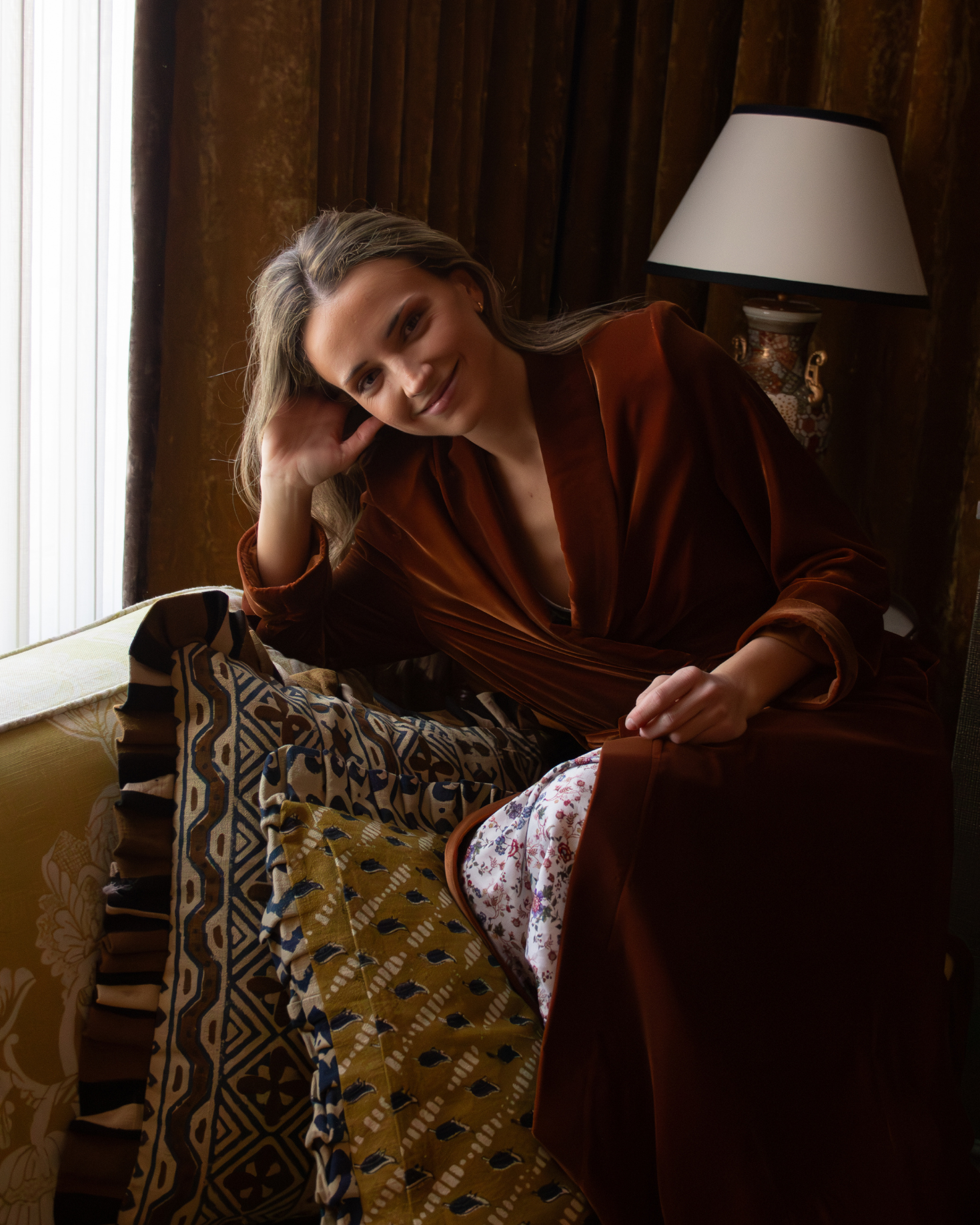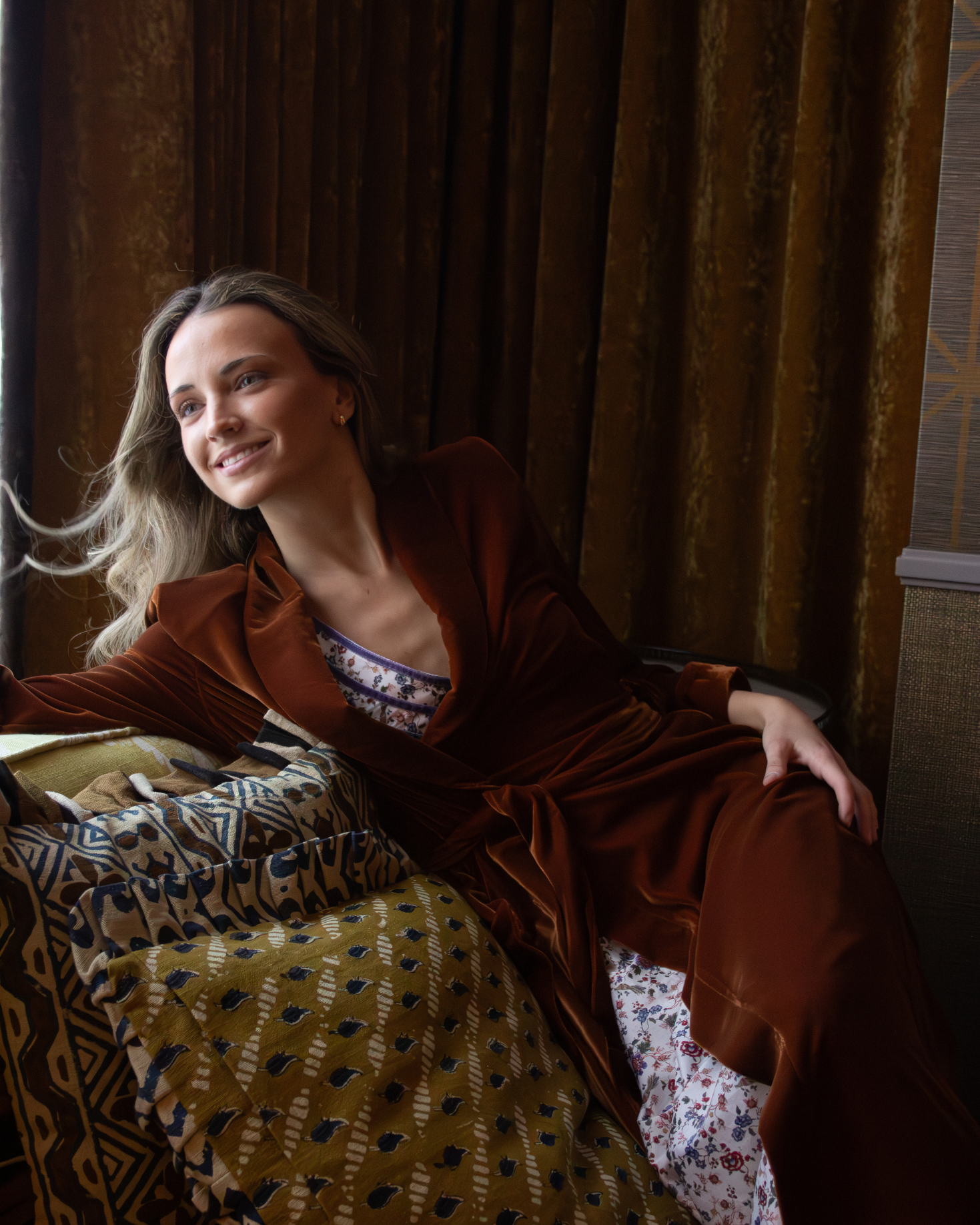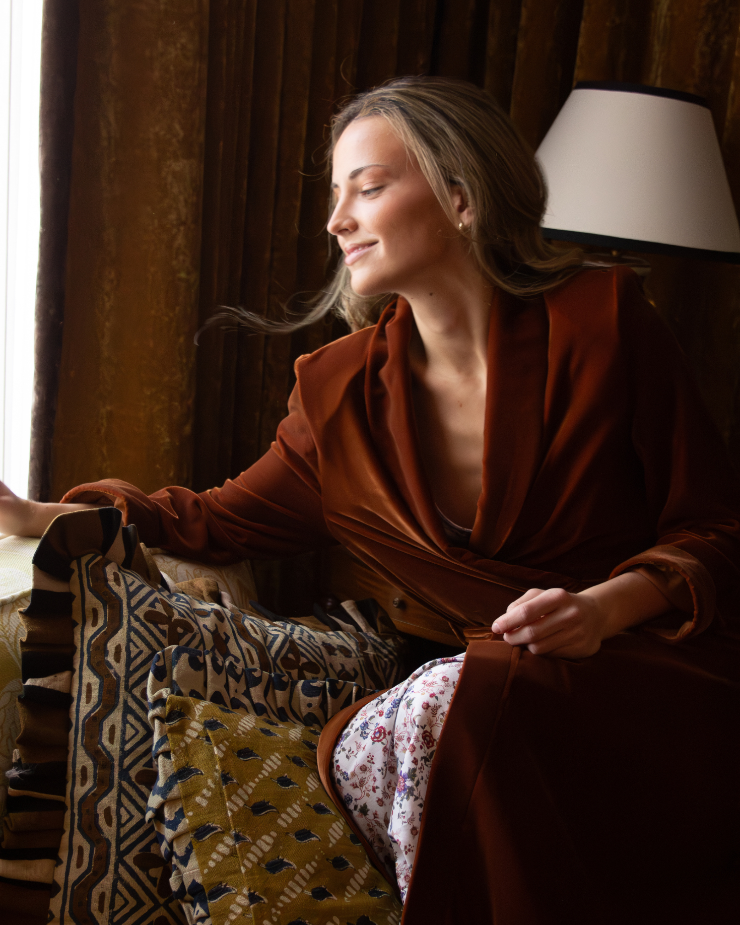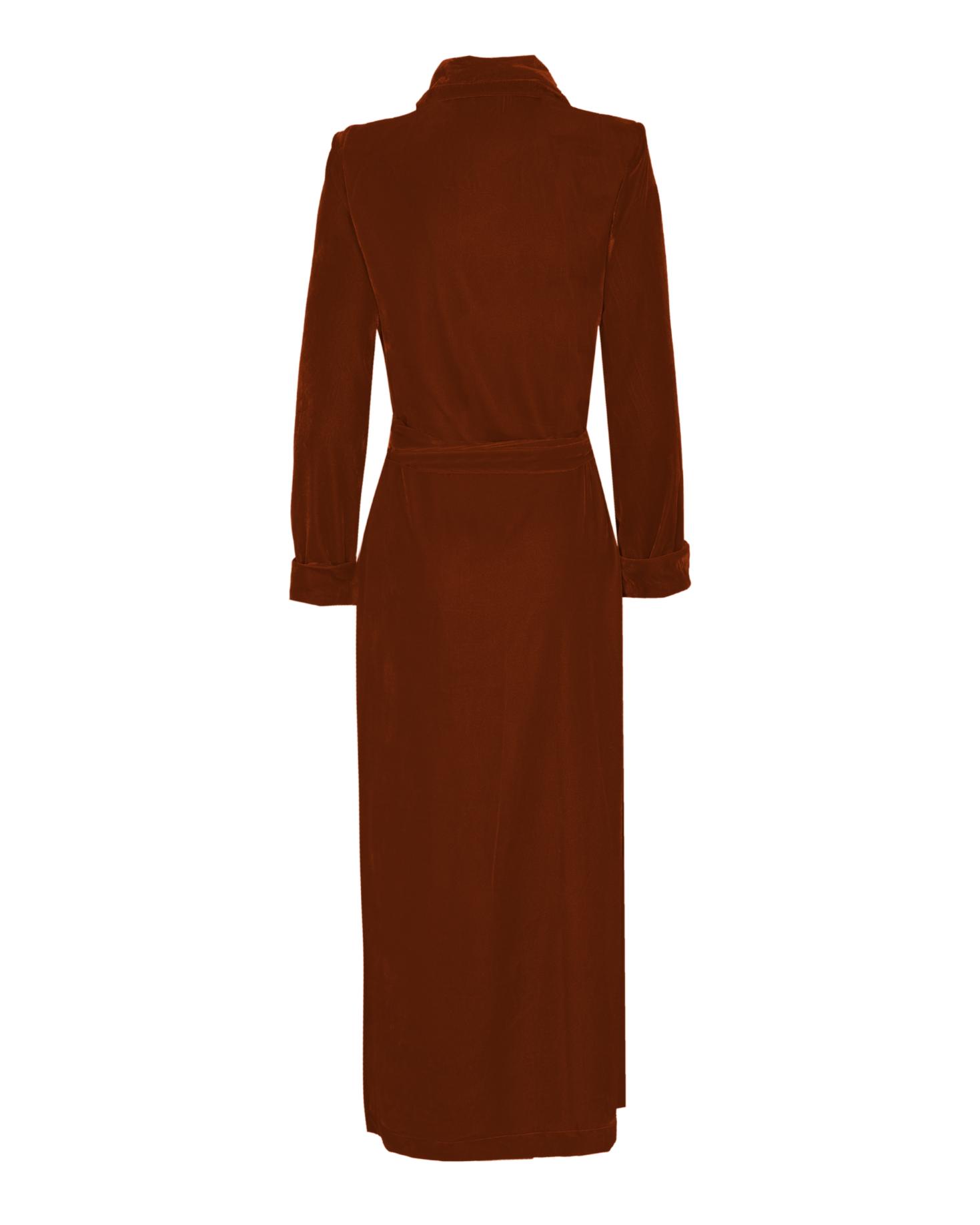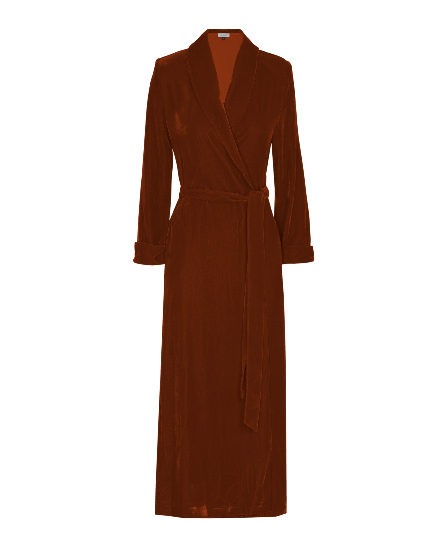 Kettle-colored velvet robe with shoulder pads, long sleeves, and belt closure.