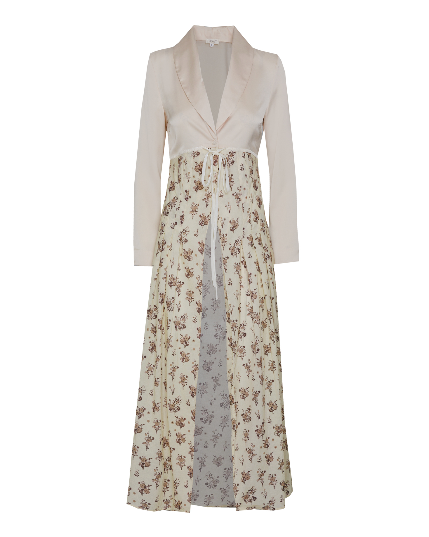 Cotton robe with floral print in beige and contrasting satin. Collar with velvet bow detail.