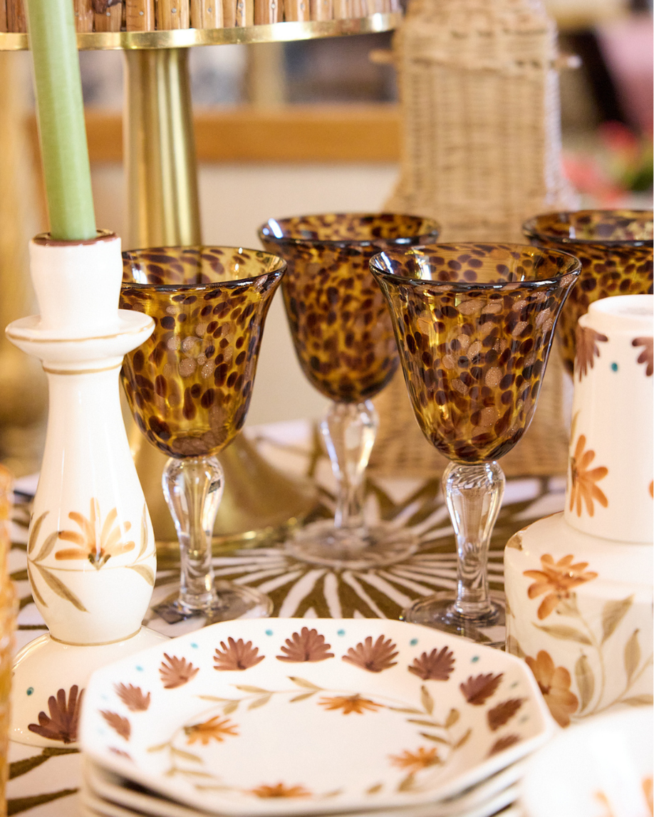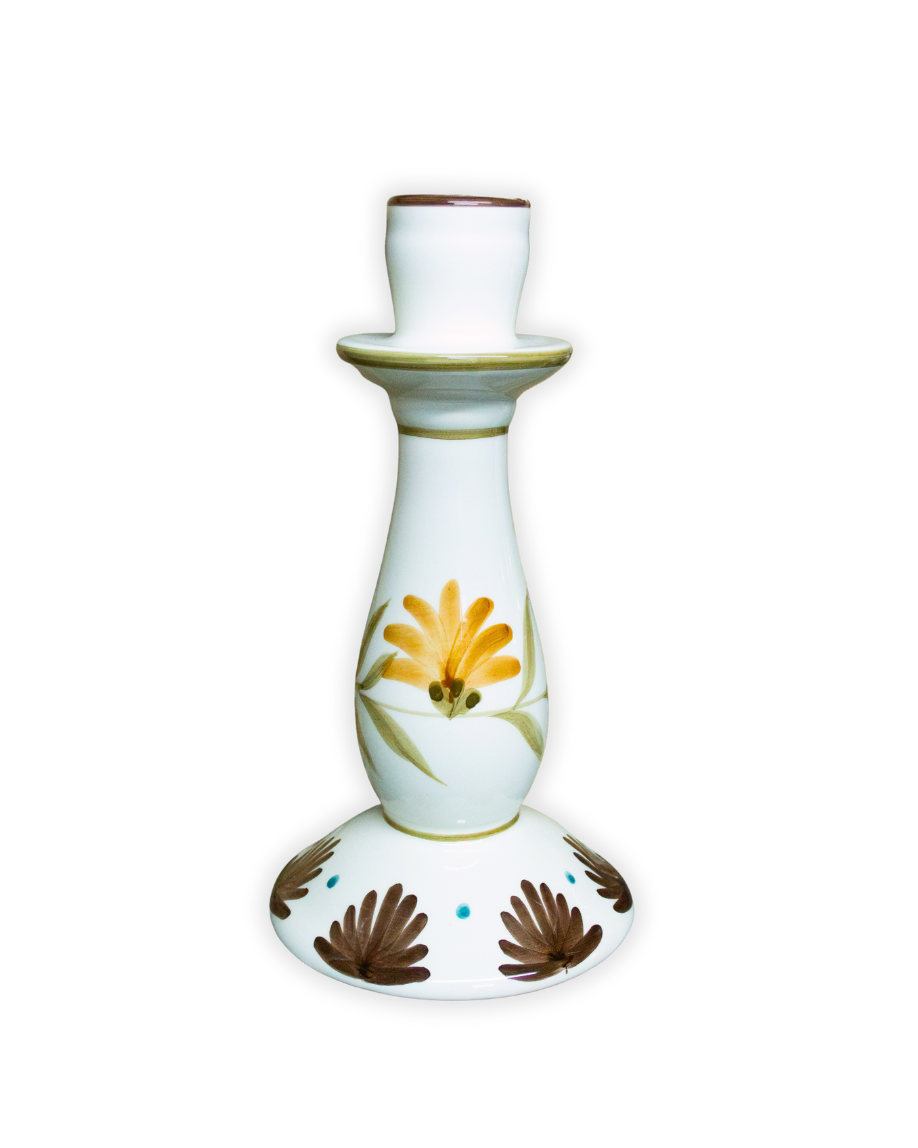 Candelabro hecho en cerámica pintado a mano en tonos terracota y marrón con detalles florales. También disponible en tonos verdes y azules.