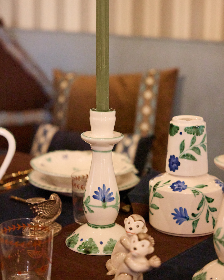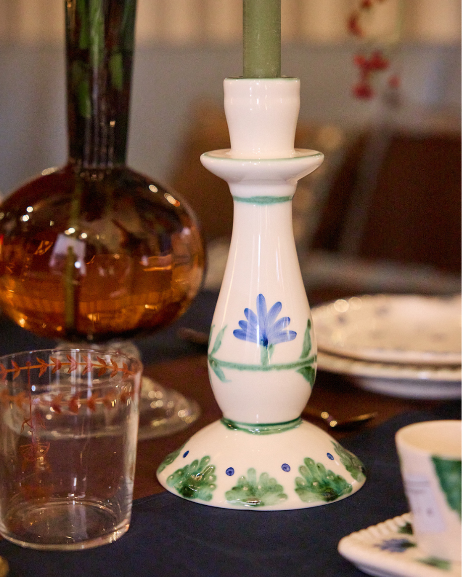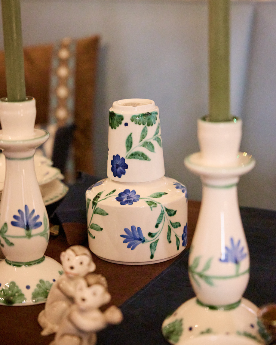 Candelabro hecho en cerámica pintado a mano en tonos verdes y azules con detalles florales. También disponible en color terracota.