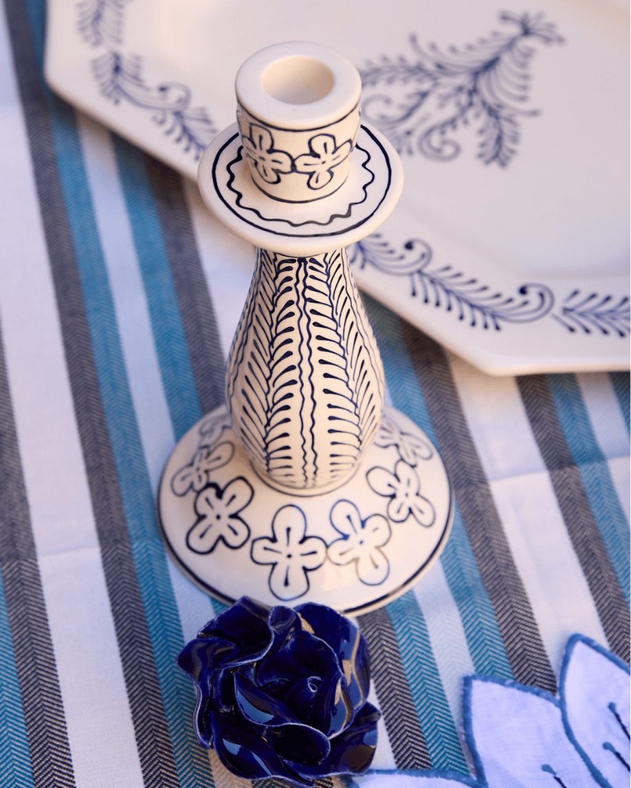 Ceramic candlestick hand-painted in blue.
