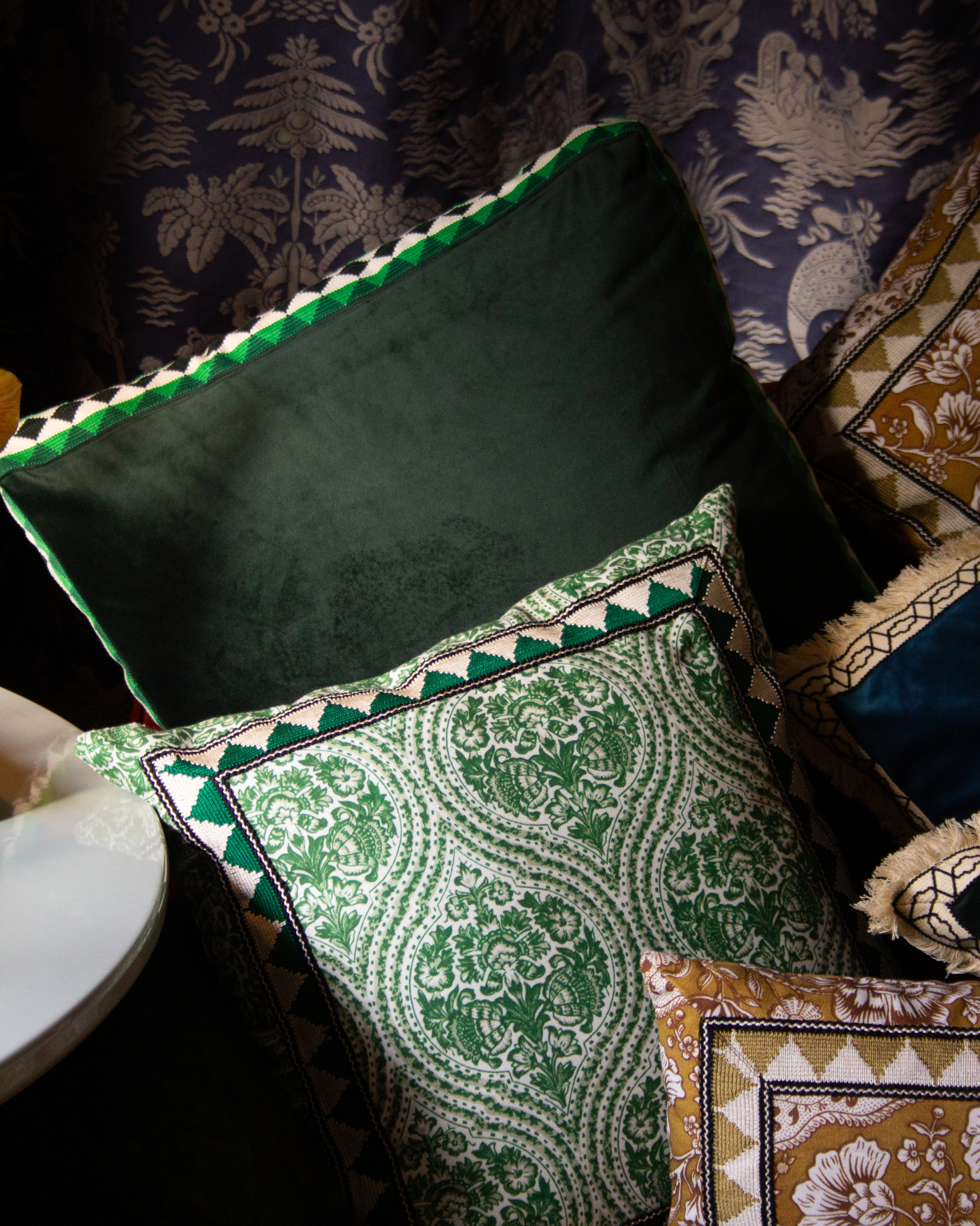 Large cushion cover made of velvet with a geometric border. Available in four shades: burgundy, blue, black and green, with a wide border. Filling not included.