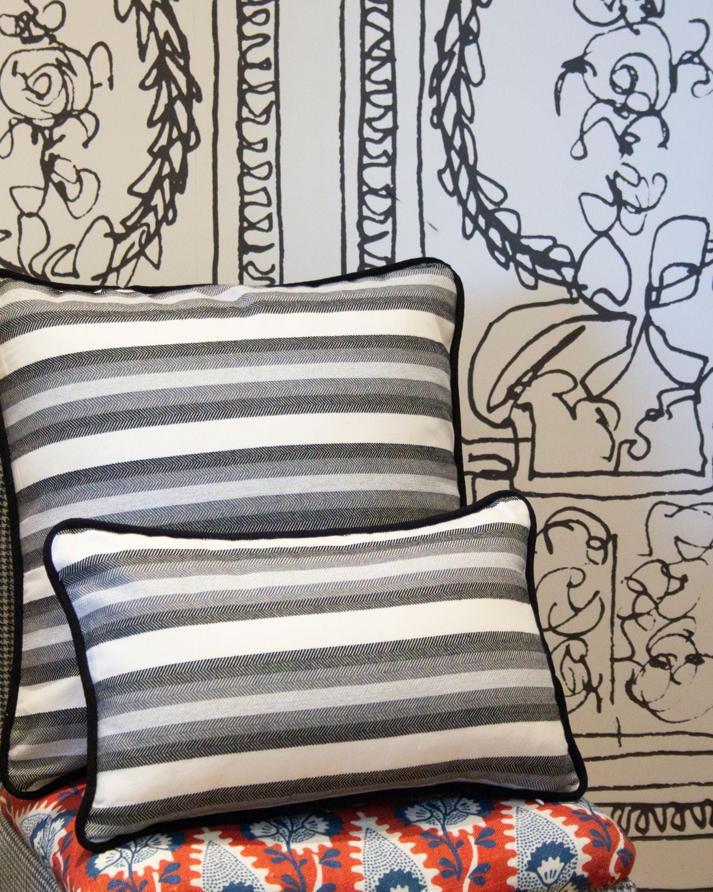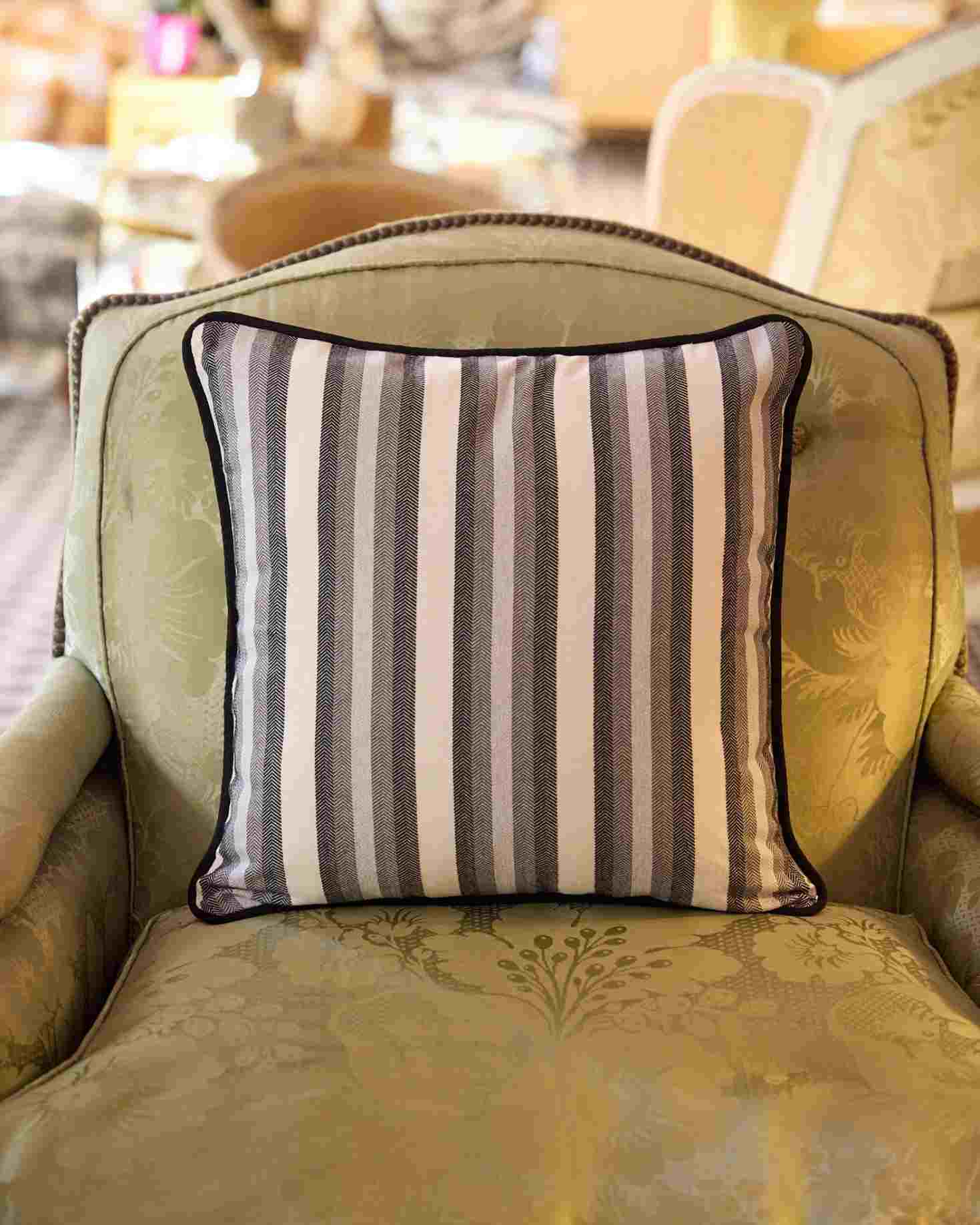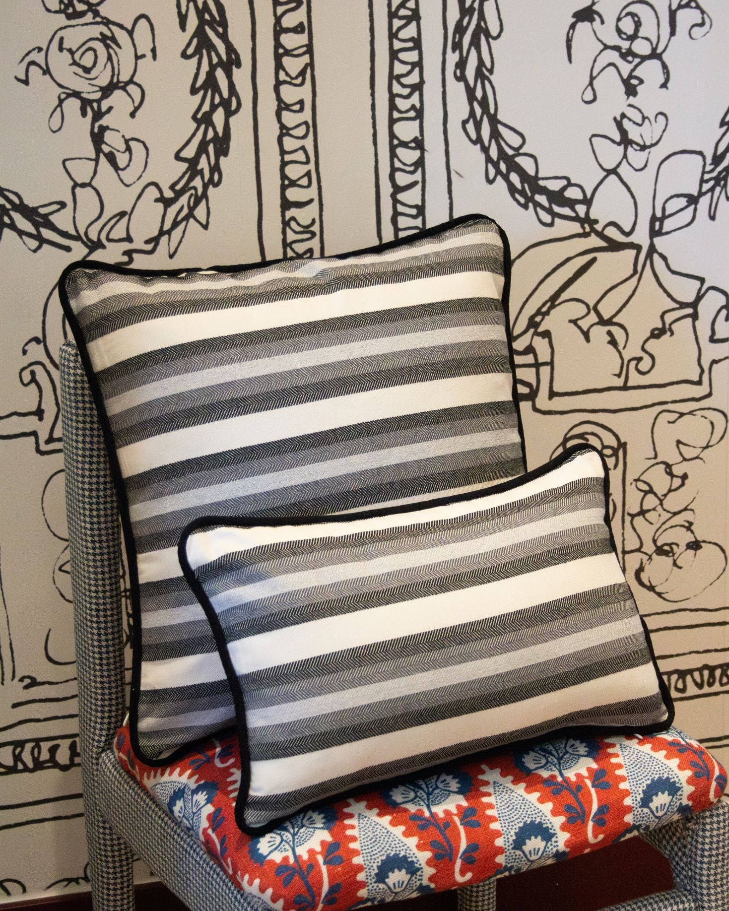 Large cotton cushion with a striped print in black, gray, and beige. Black piping detail. Also available in blue and red. Filling not included.