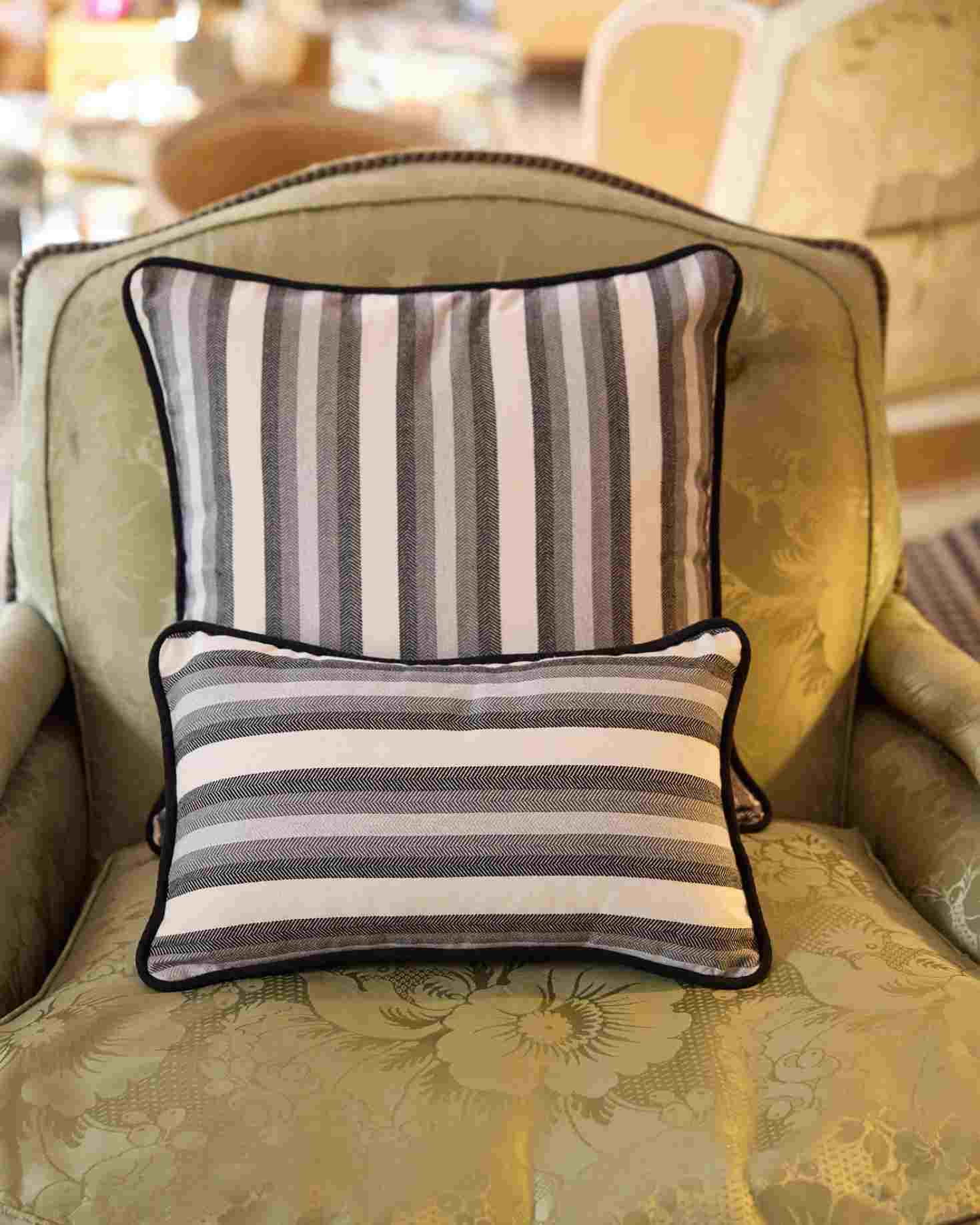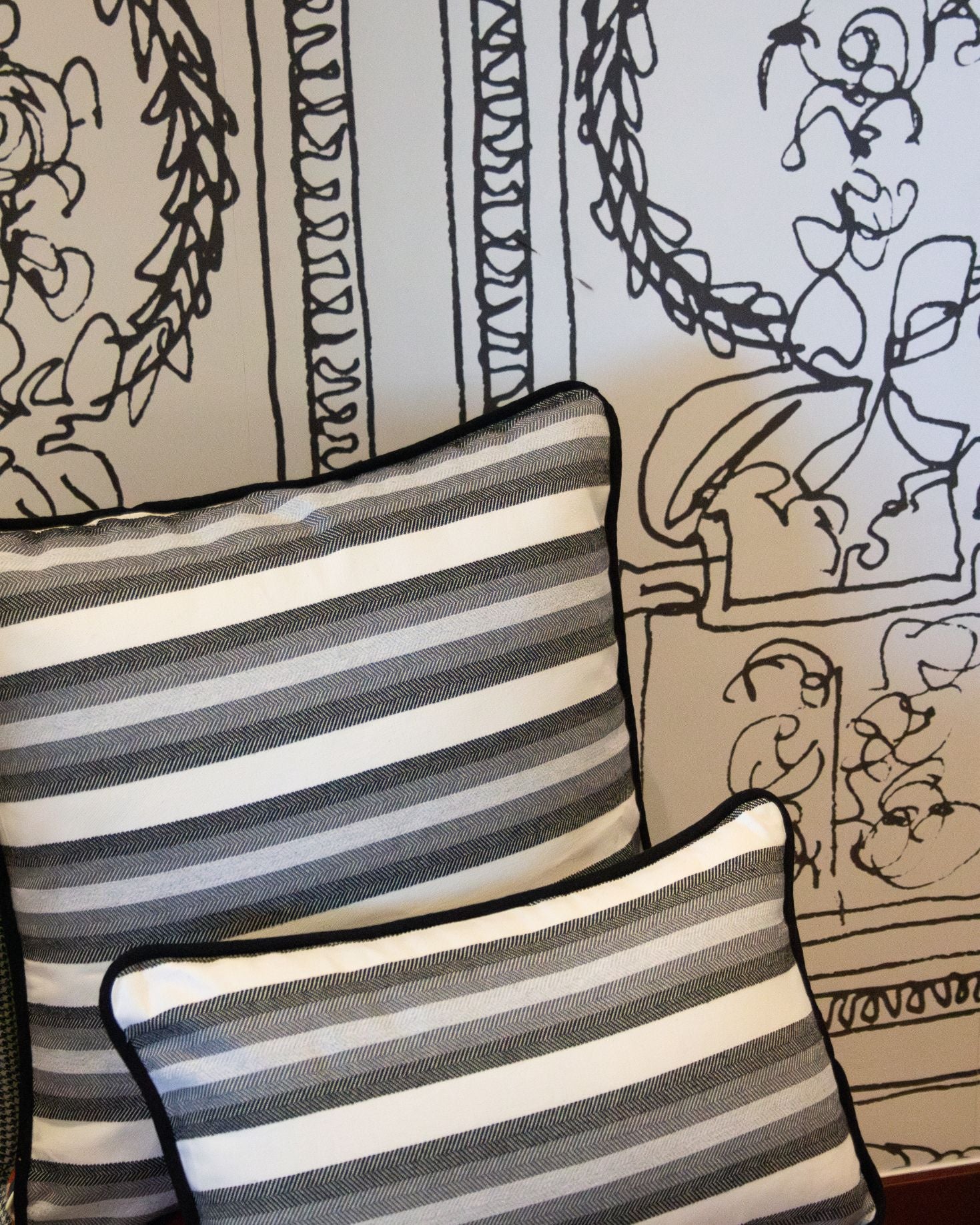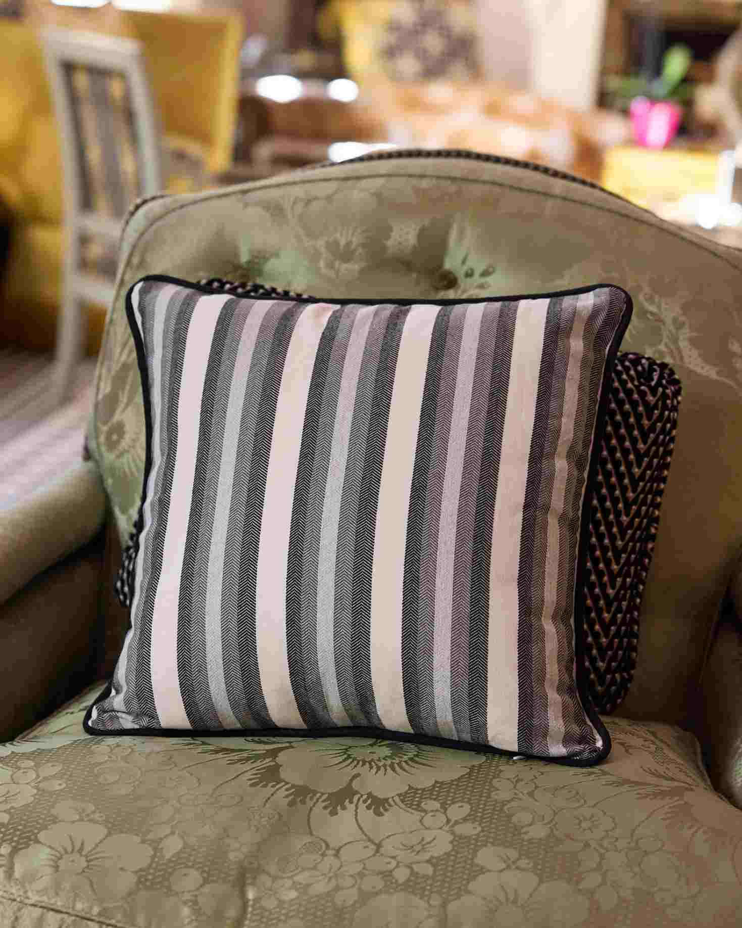 Large cotton cushion with a striped print in black, gray, and beige. Black piping detail. Also available in blue and red. Filling not included.
