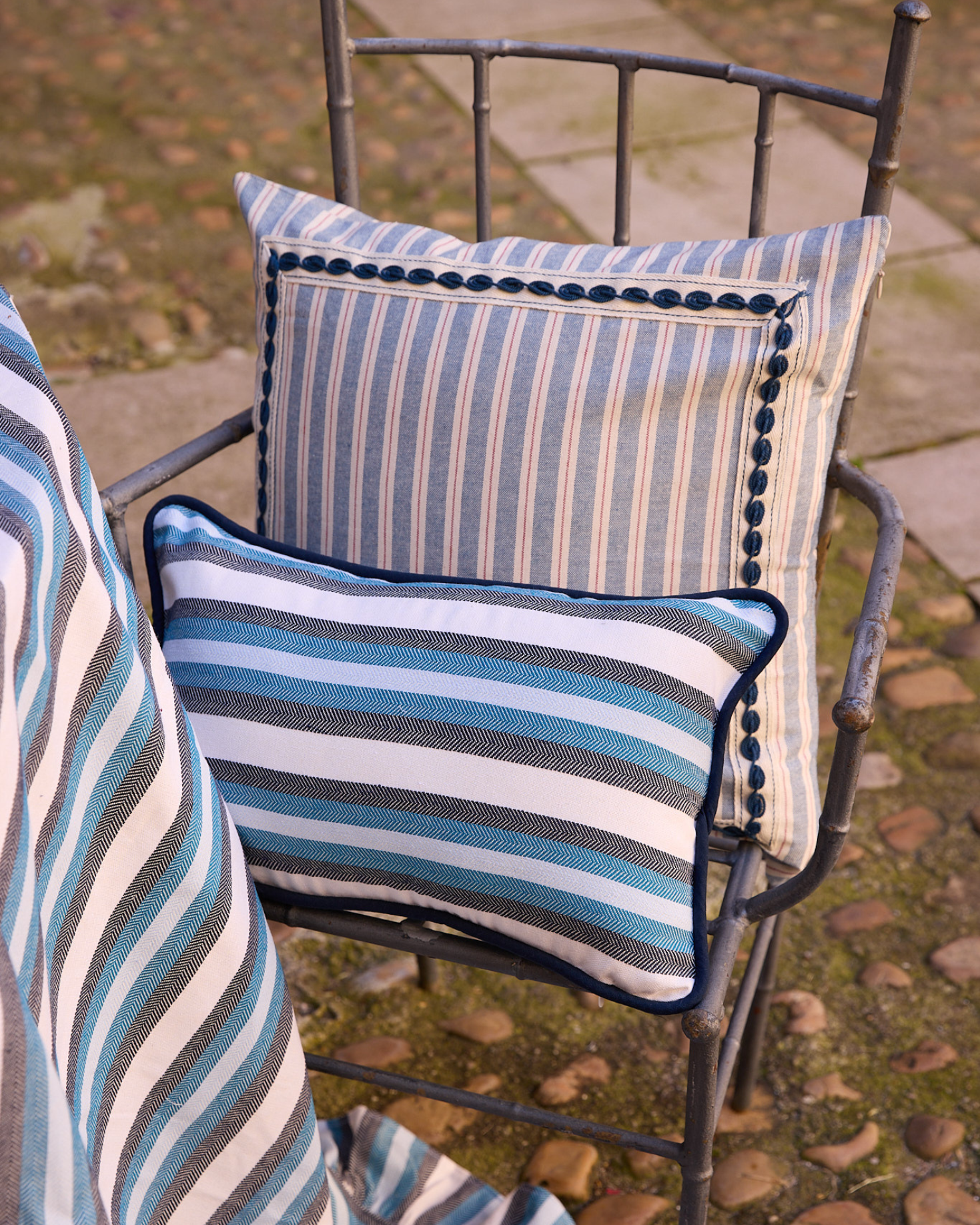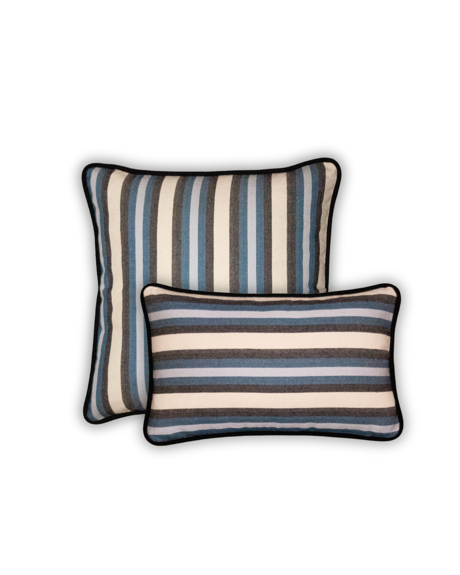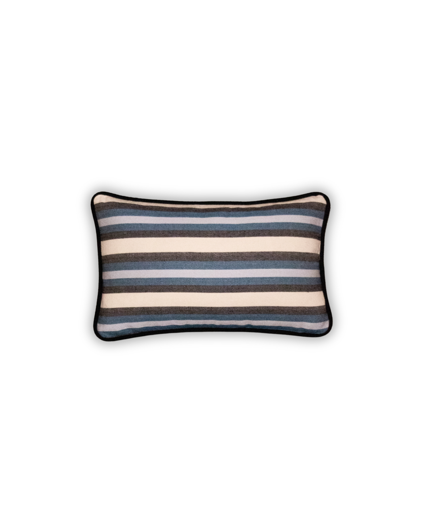 Small cotton cushion with a striped print in shades of blue and beige. Navy blue piping detail. Also available in red and black. Filling not included.