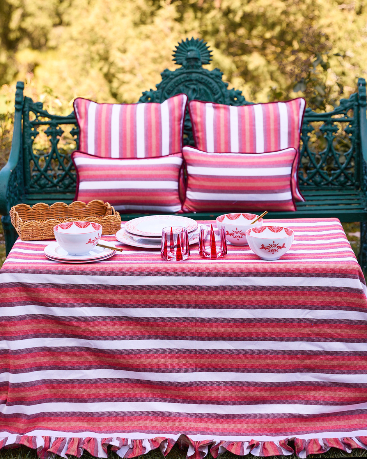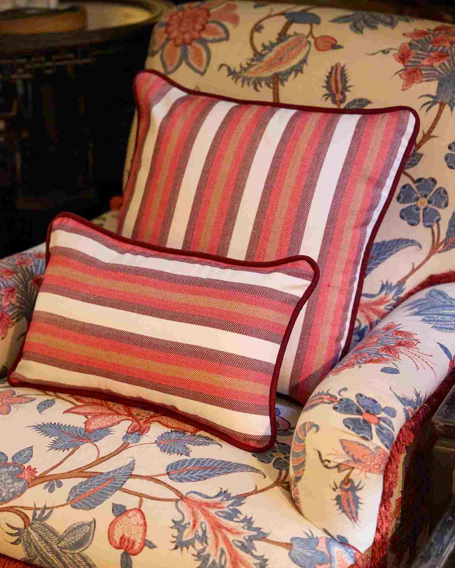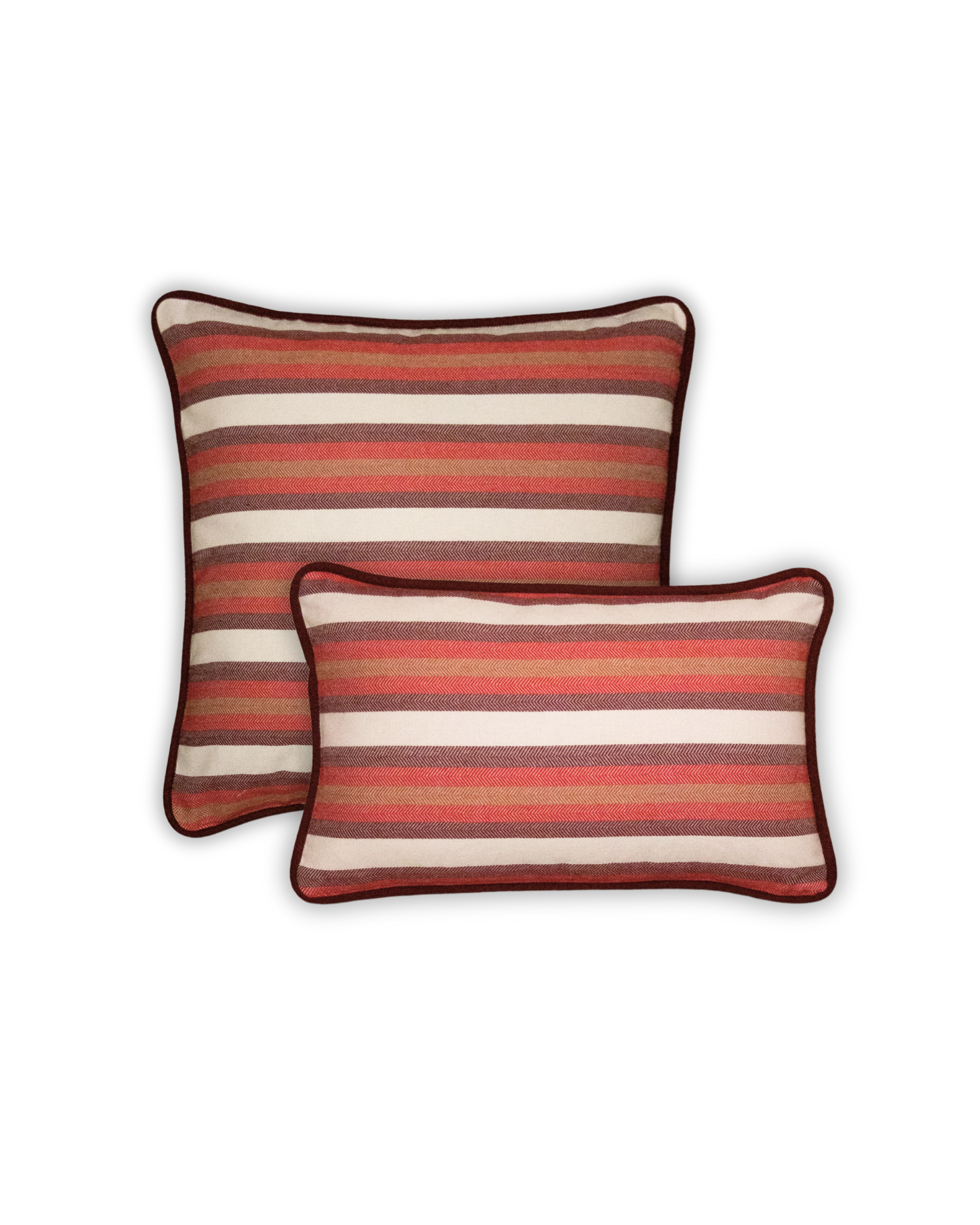 Small cotton cushion with a striped print in shades of red and beige. Burgundy piping detail. Also available in blue and black. Filling not included.