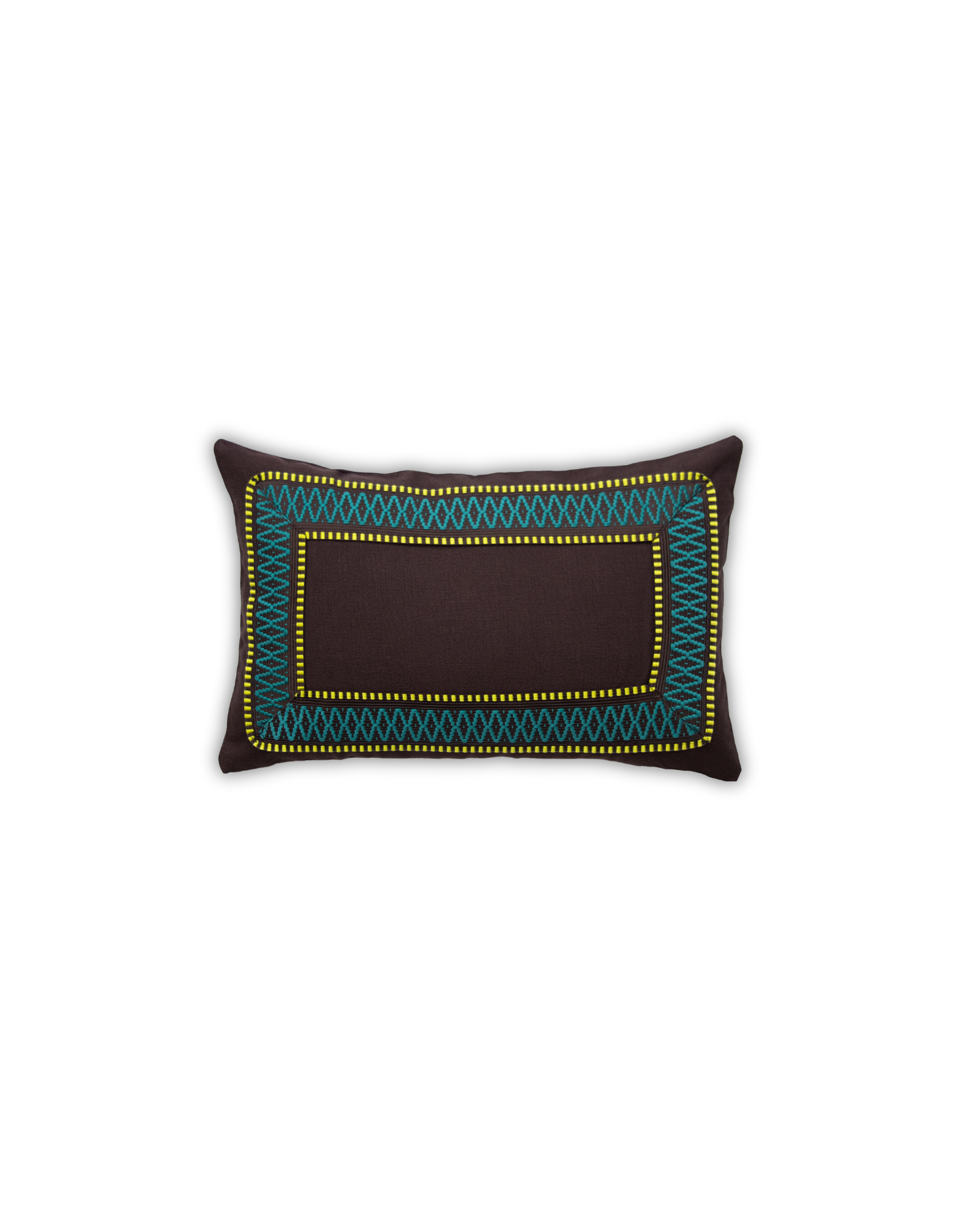 Small brown linen cushion with a geometric border in brown, green, and yellow. Also available in green. Filling not included.