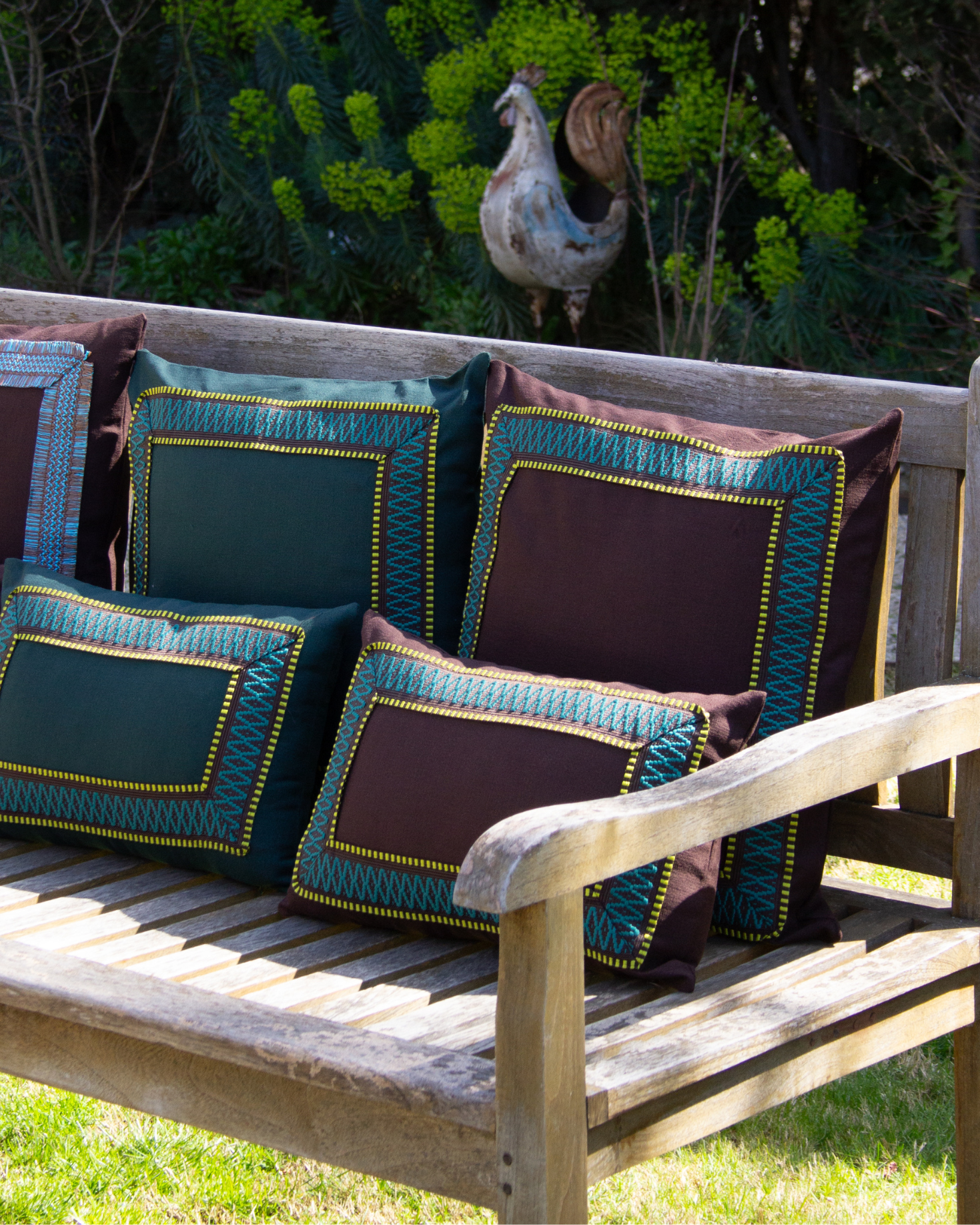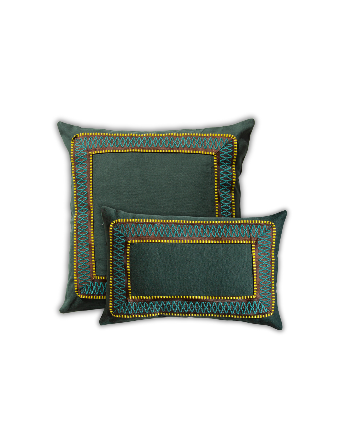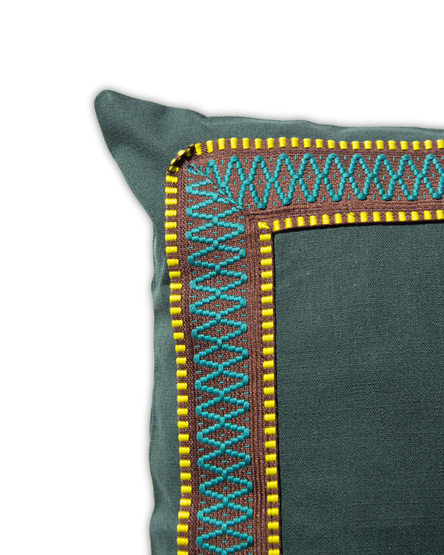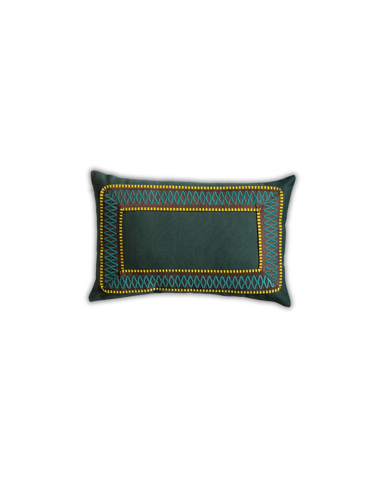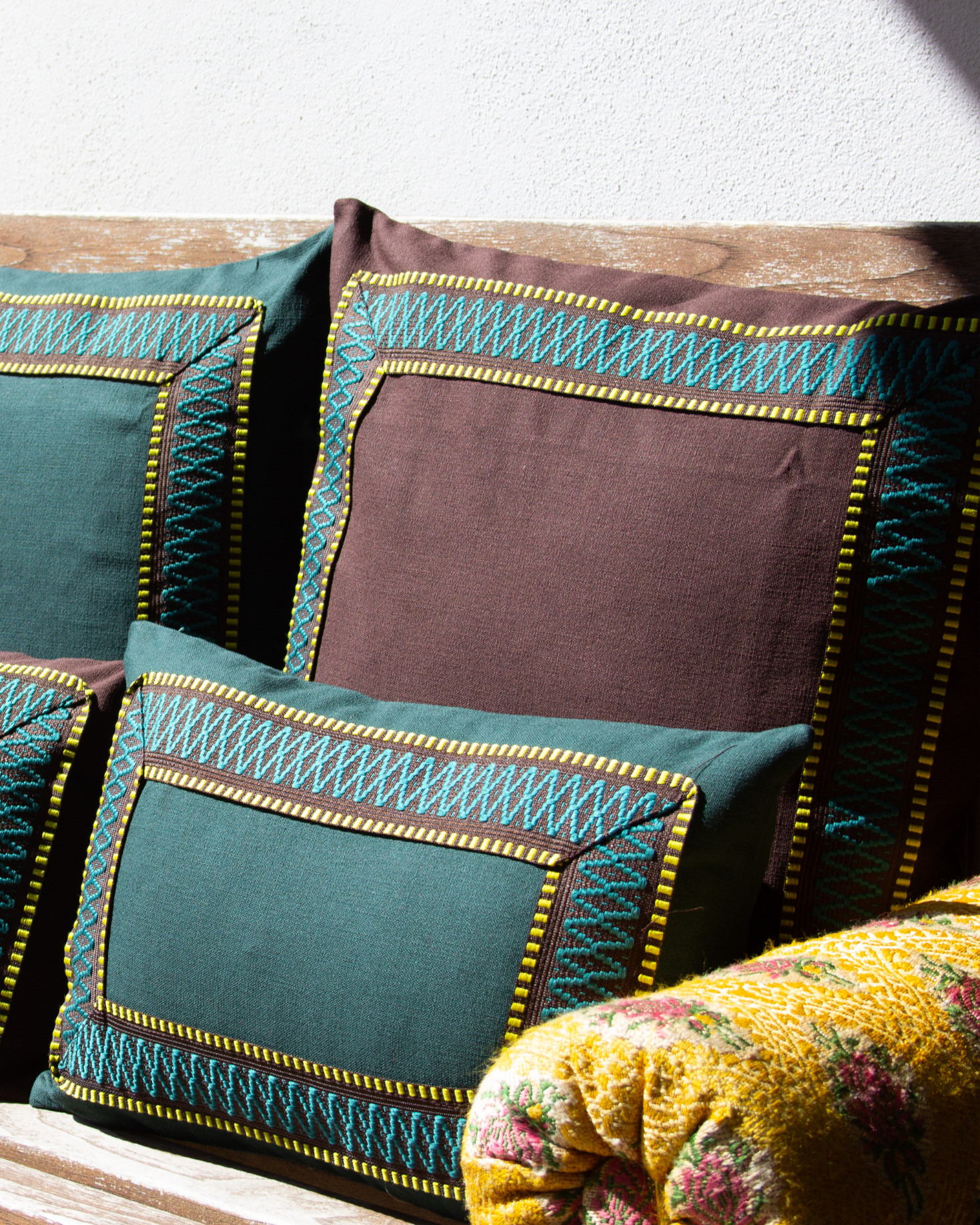 Small green linen cushion with a geometric border in brown, green, and yellow. Also available in brown. Filling not included.