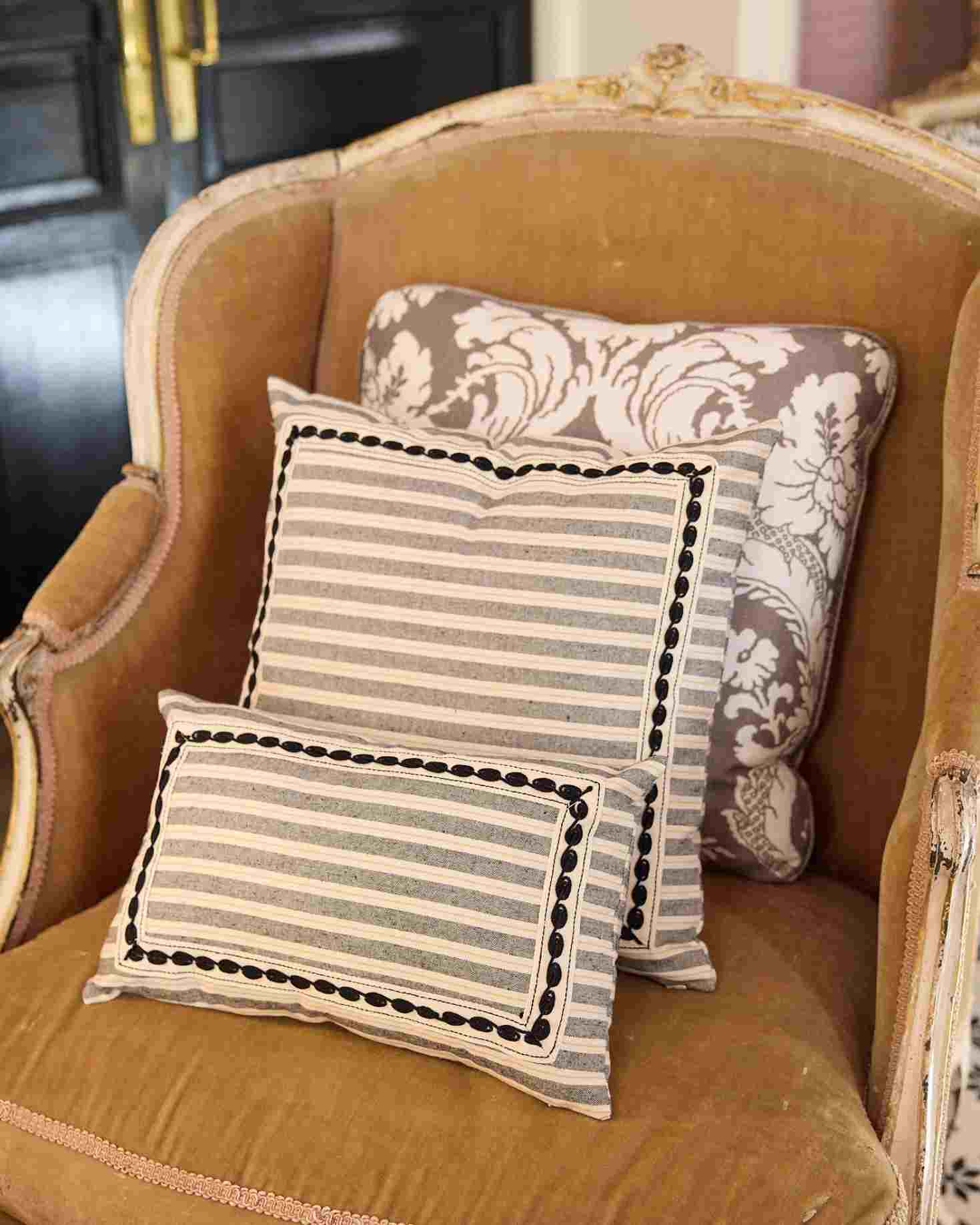 Large cotton cushion with a striped print in black, mustard, and beige. Black border detail. Also available in red, mustard, and blue. Filling not included.