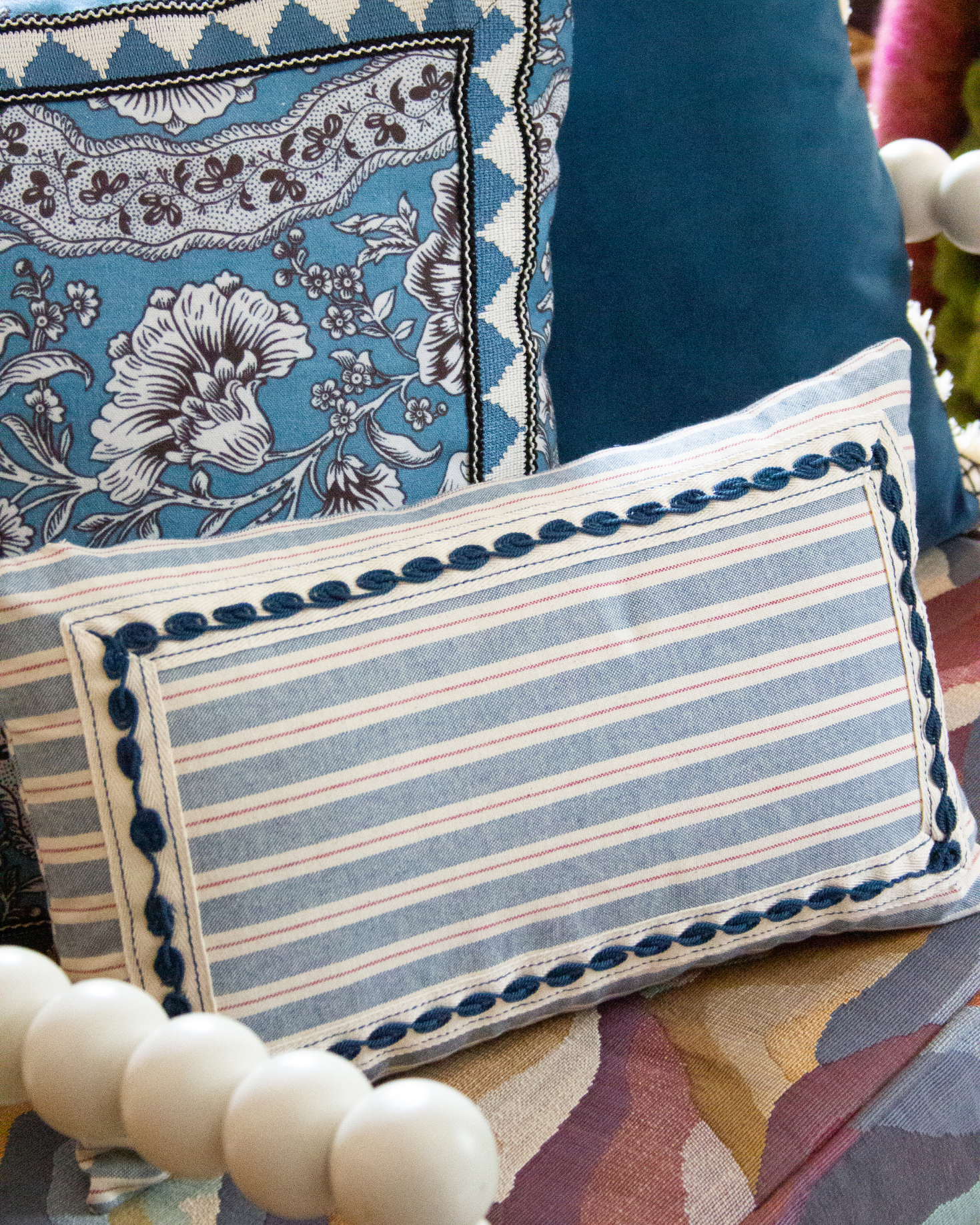 Small cotton cushion with a striped print in shades of blue, red, and beige. Blue border detail. Also available in black, mustard, and red. Filling not included.