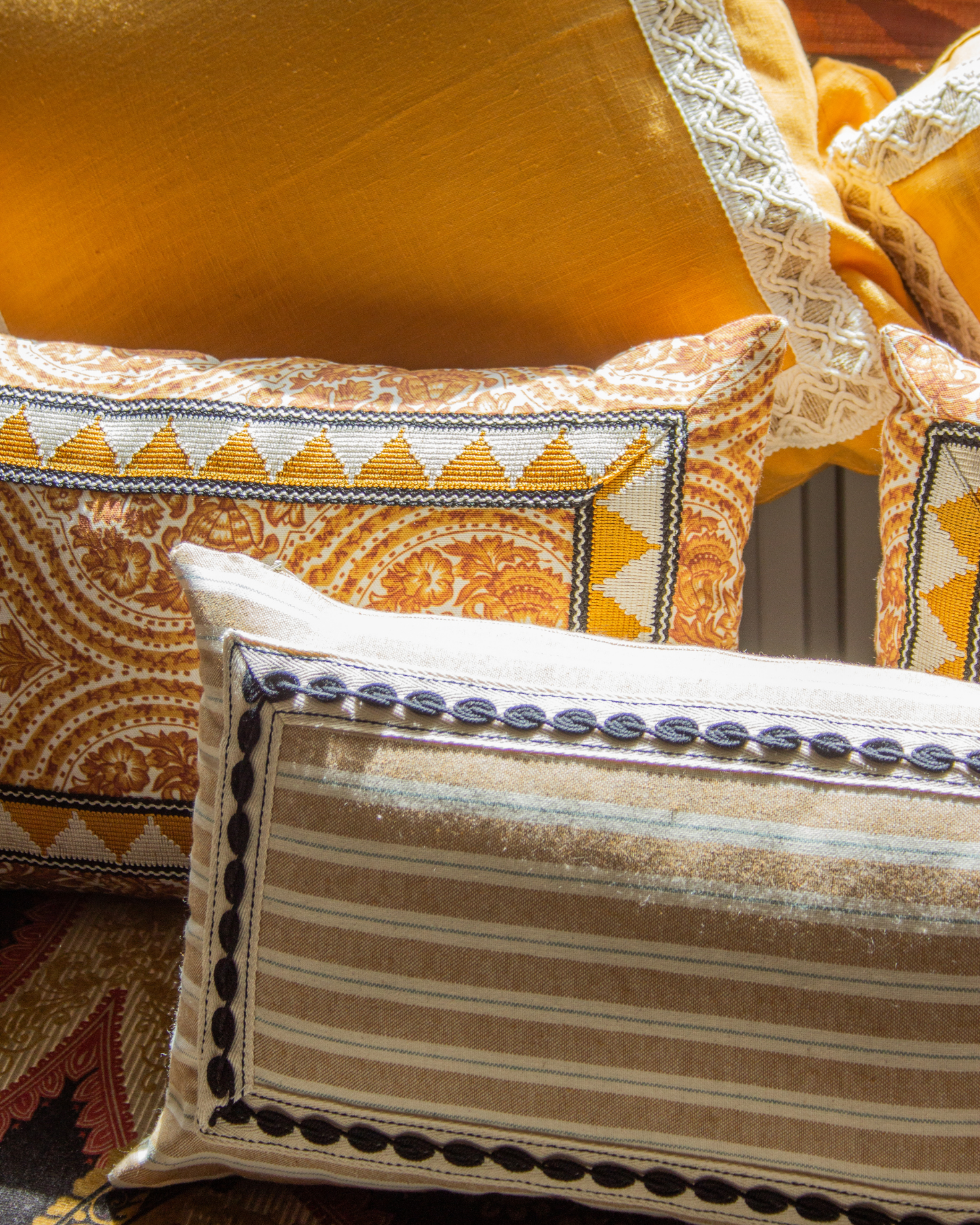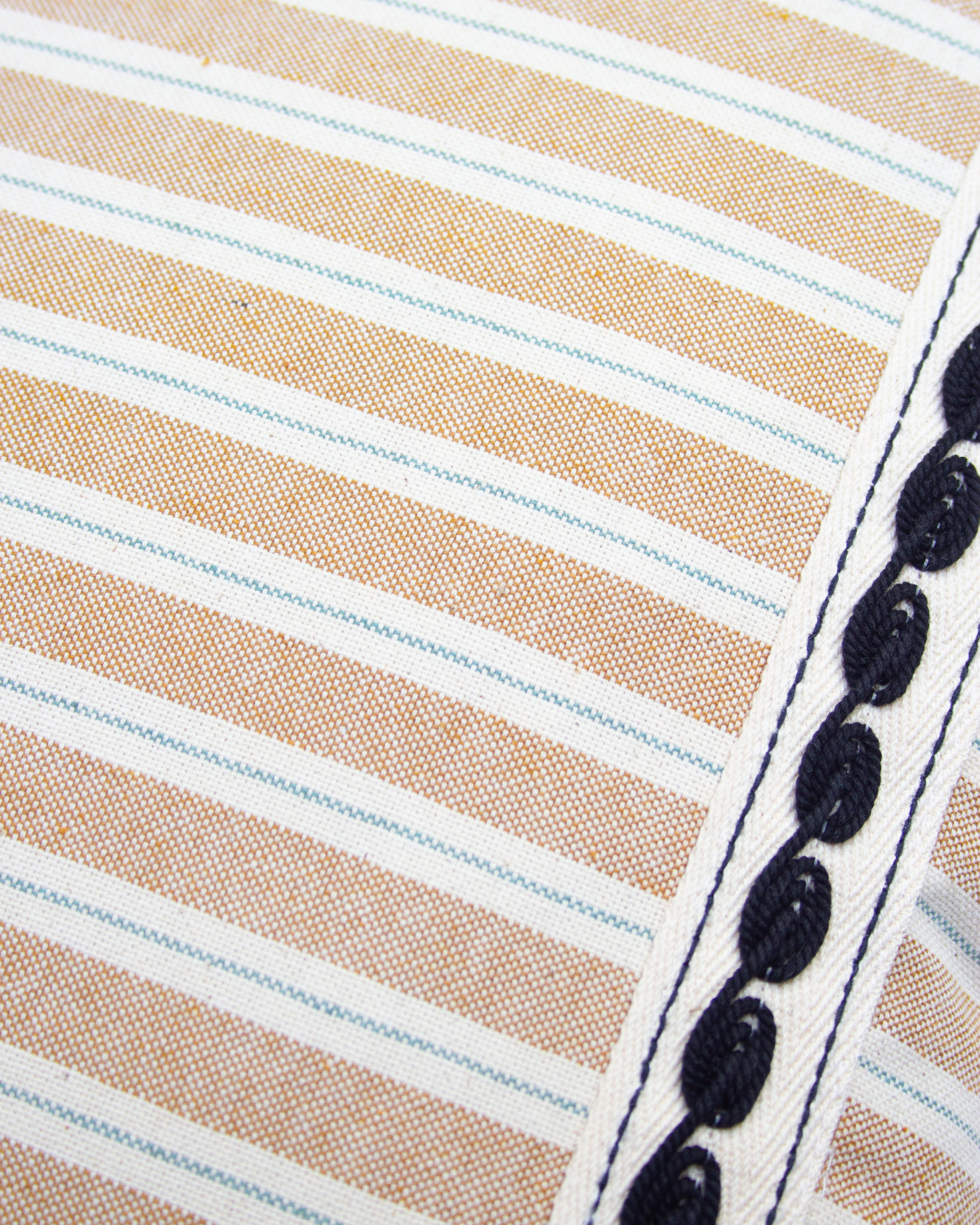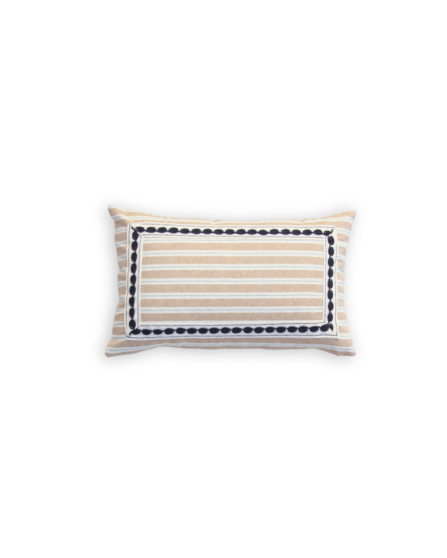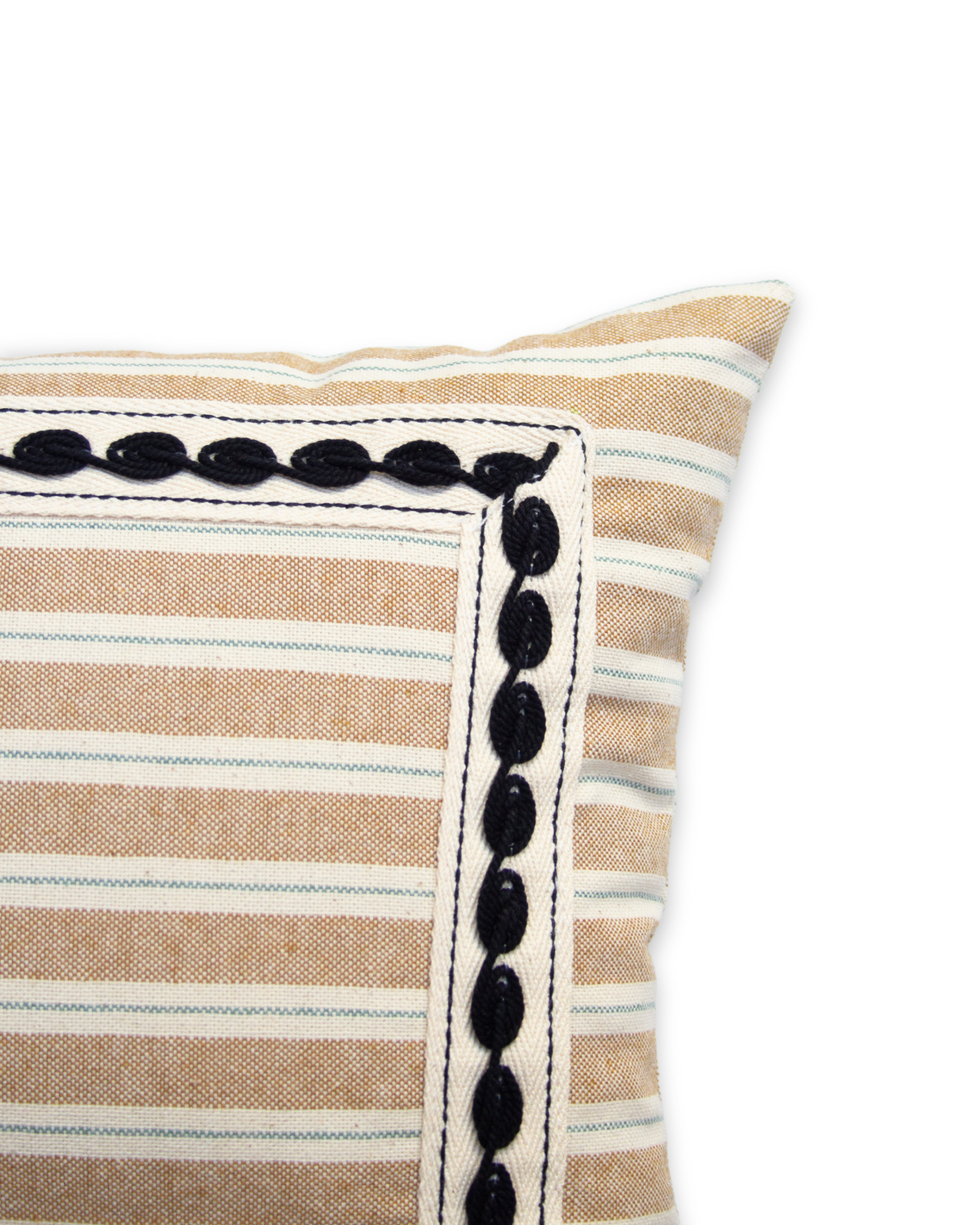 Small cotton cushion with a striped print in mustard, green, and beige tones. Black border detail. Also available in red, black, and blue. Filling not included.