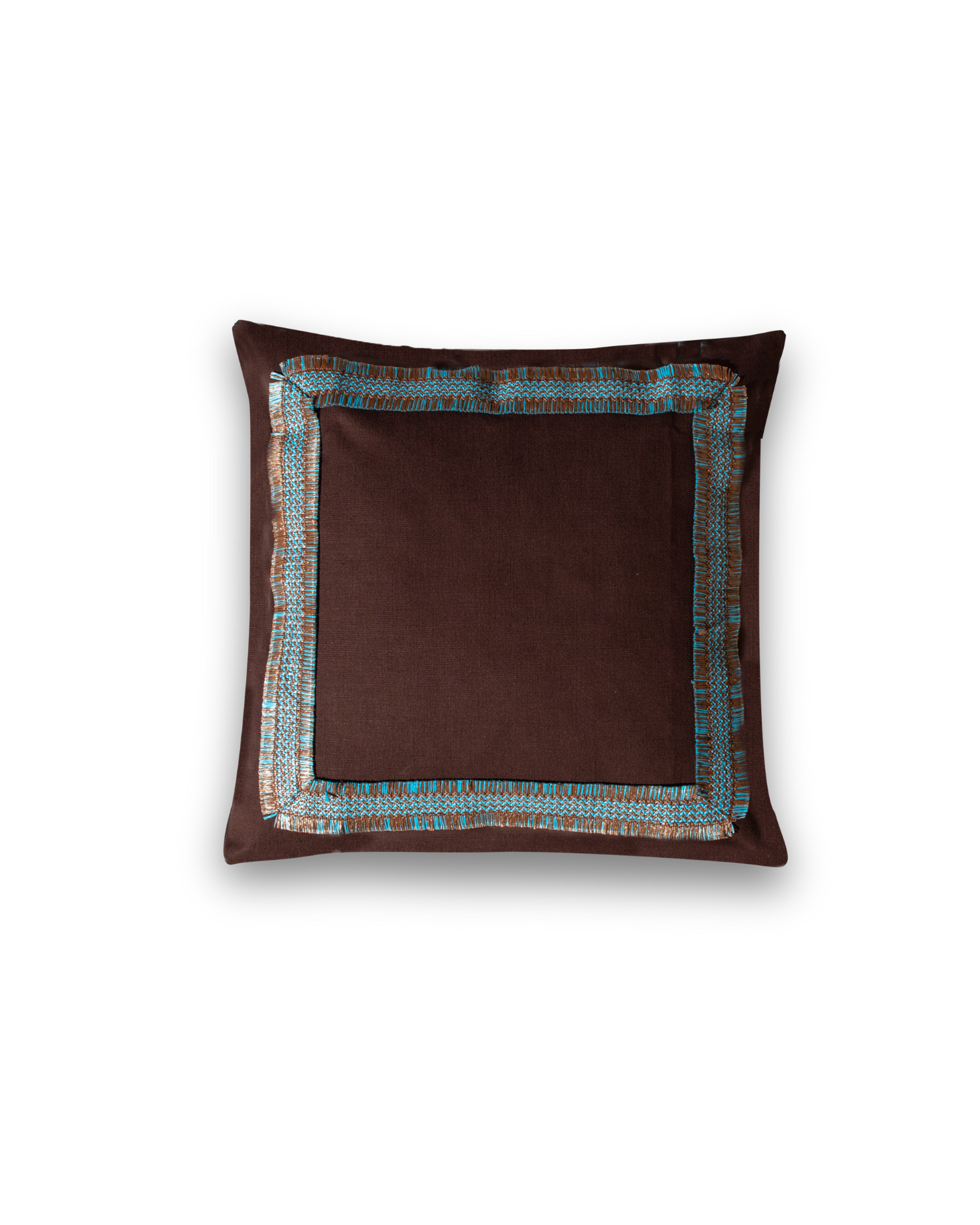 Large brown linen cushion with a brown and blue geometric border. Also available in white. Filling not included.