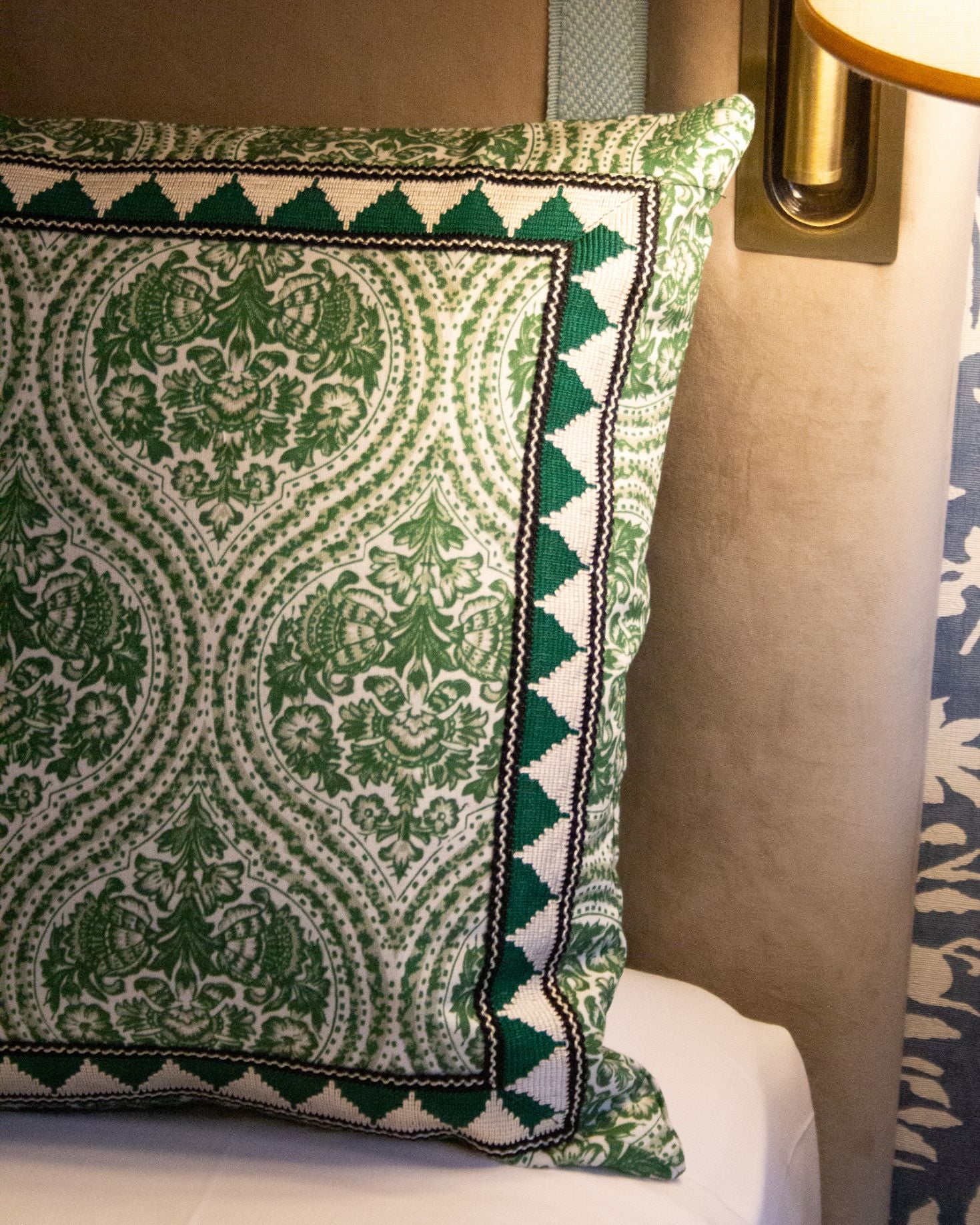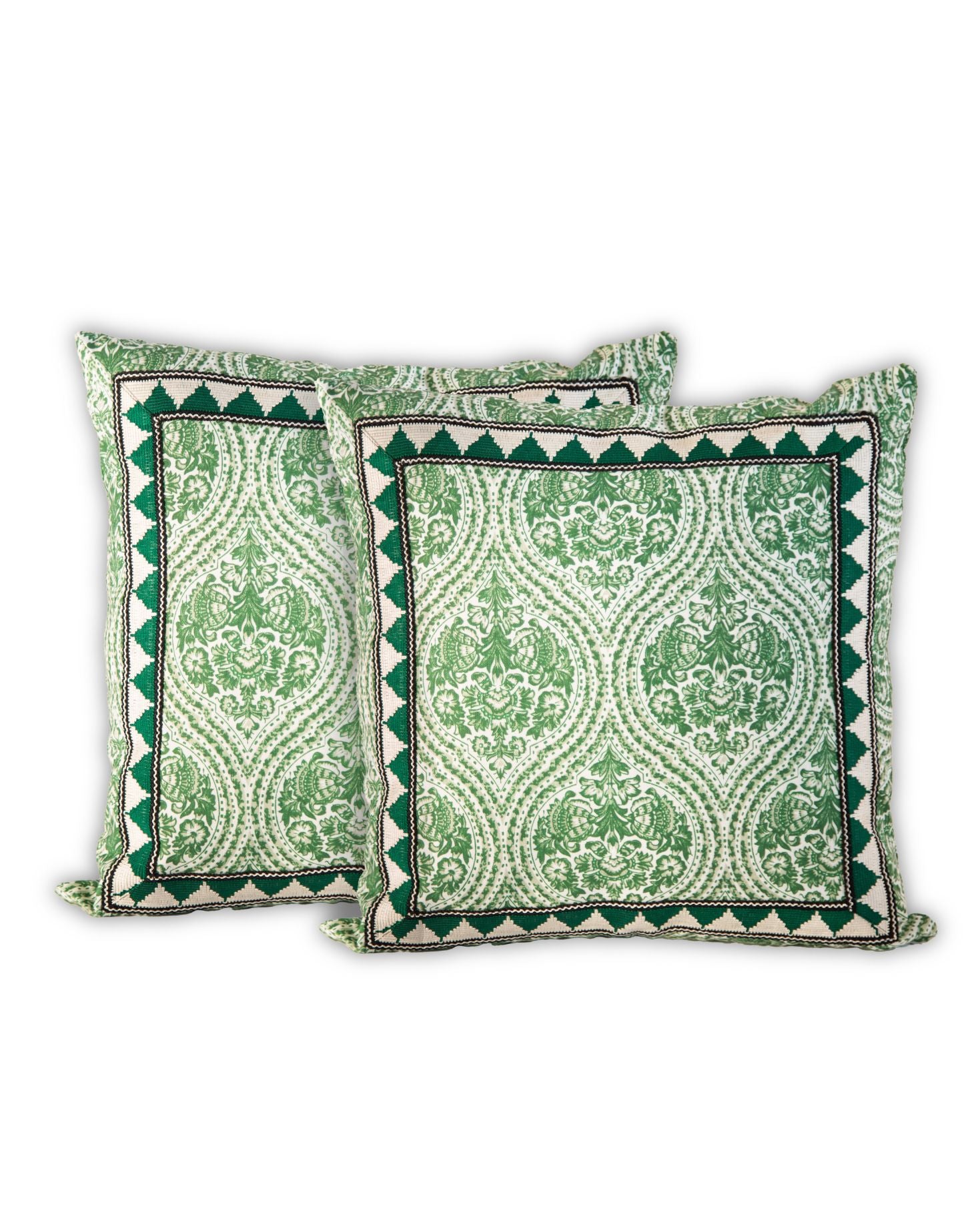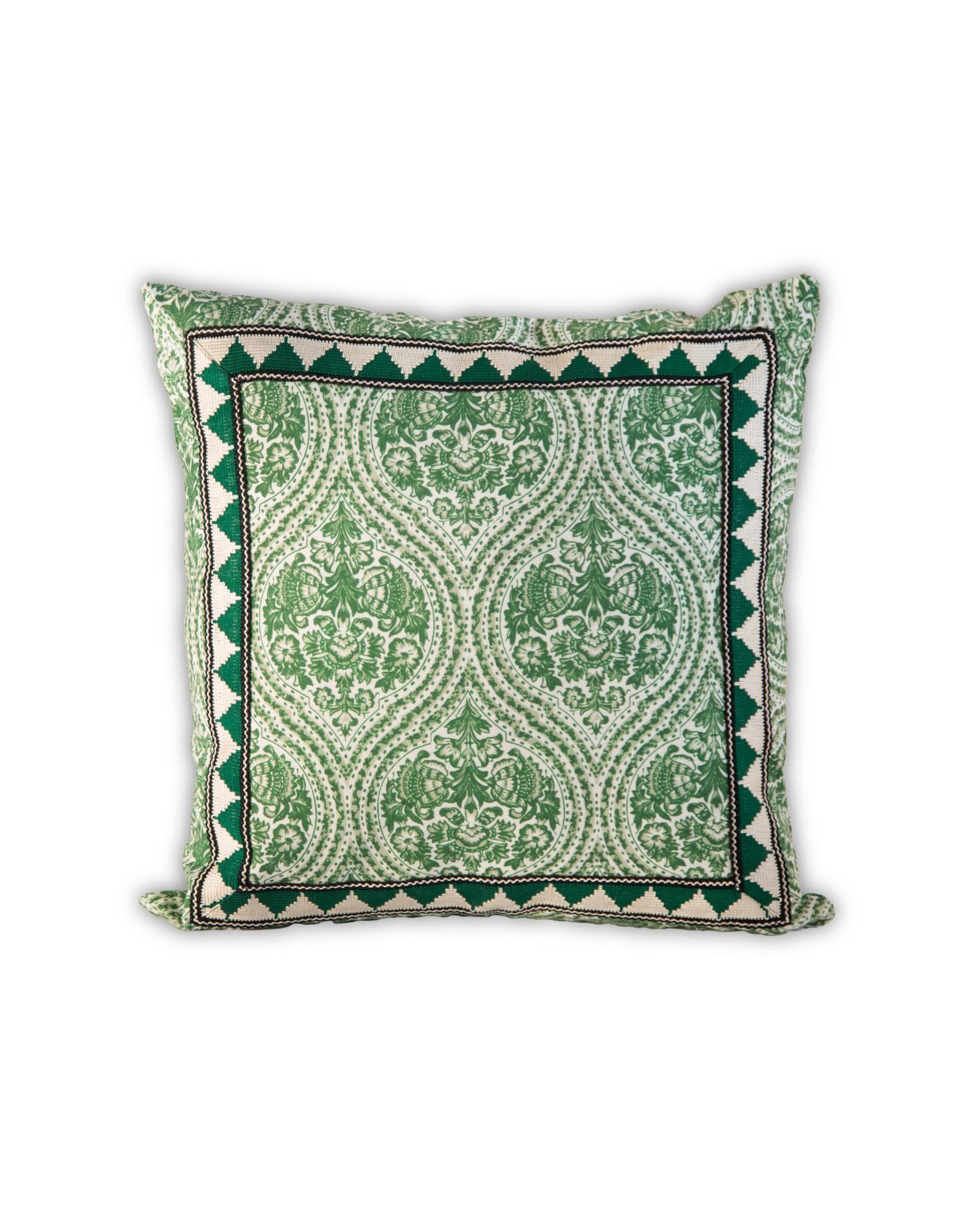 Large cotton cushion with a floral print, designed exclusively for IQ Home. Border detail. Available in green and orange, and in large and small sizes. Filling not included.