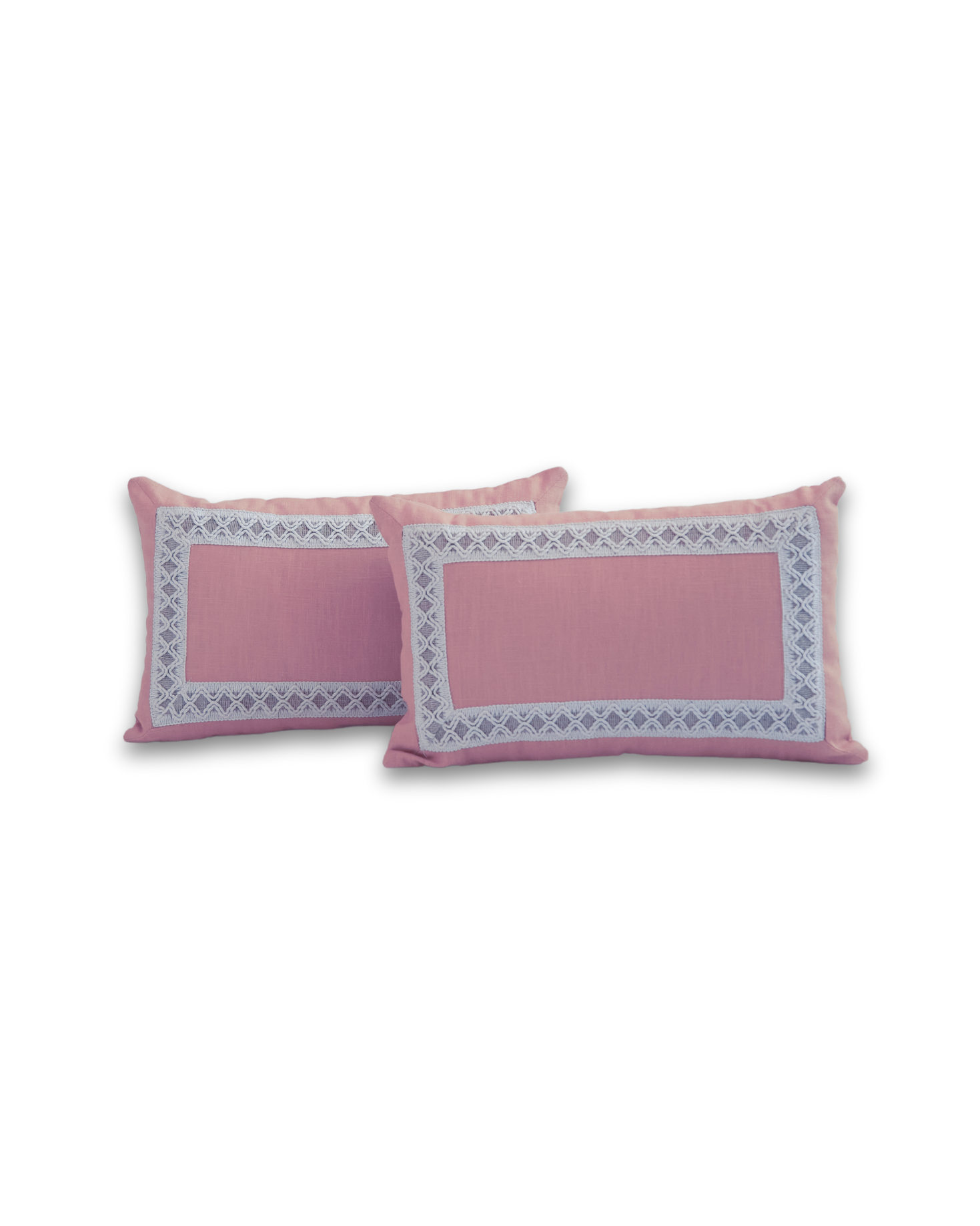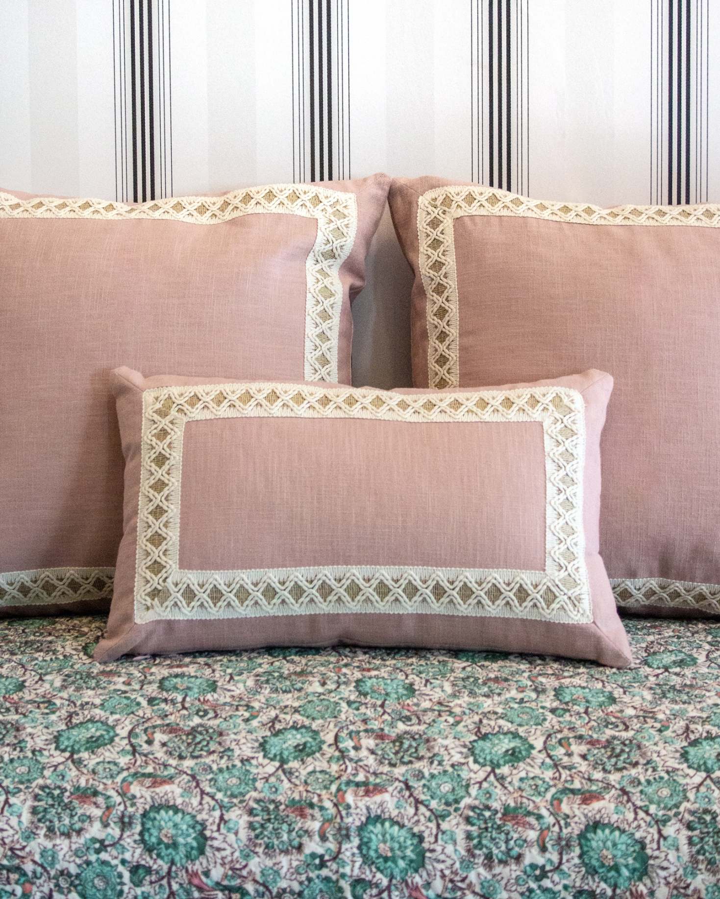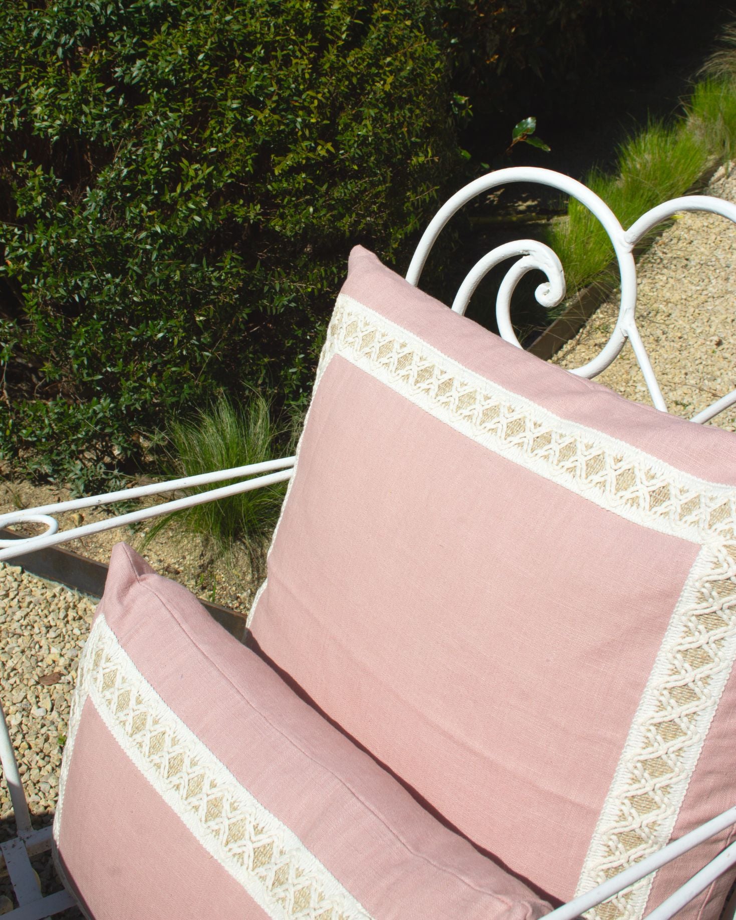 Linen cushion with a border in ecru, pink, and albero. Available in large and small sizes. Filling not included.