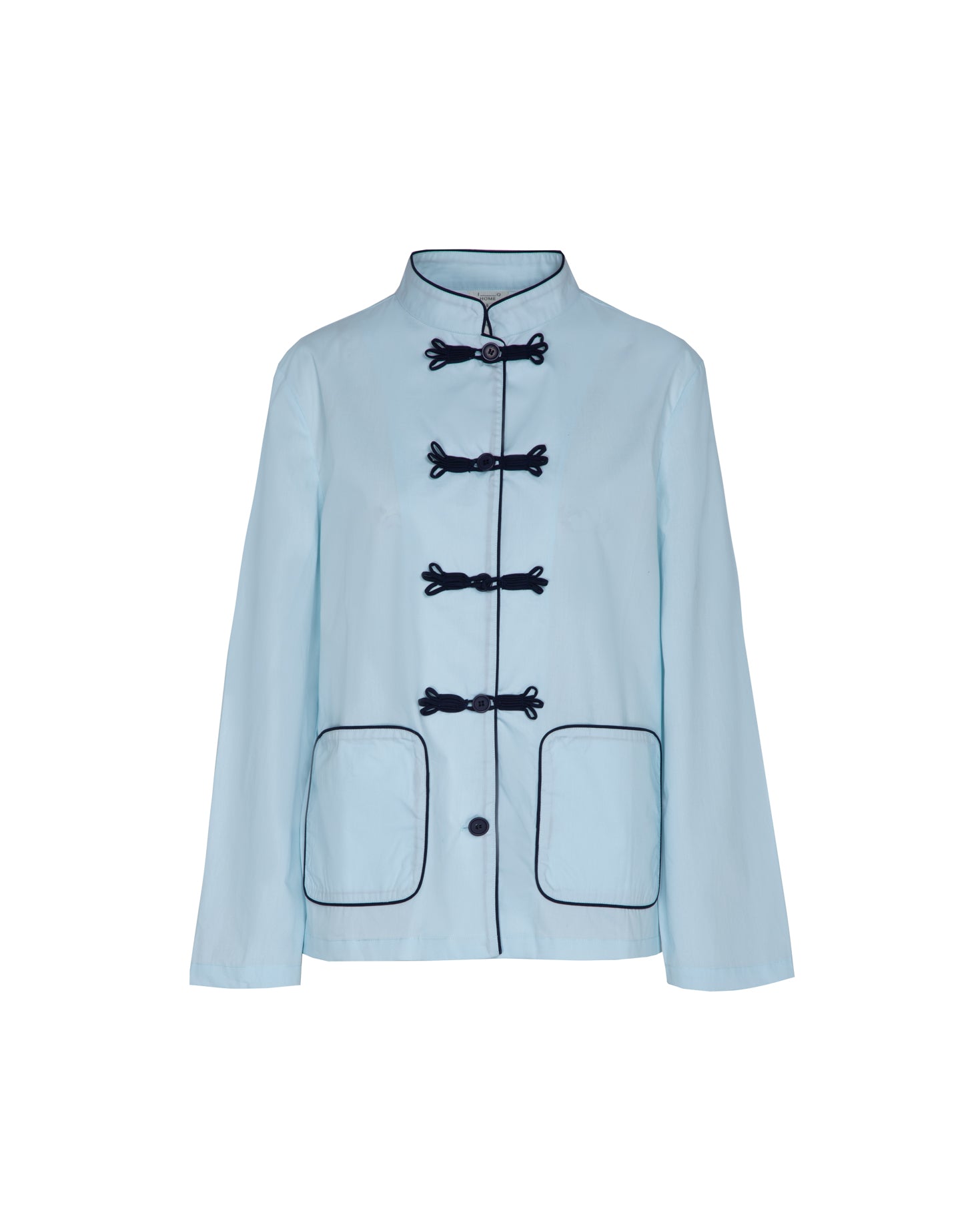 Pajama set with a mandarin collar shirt and long trousers. In light blue with navy blue trim and buttons. Made from 100% cotton.