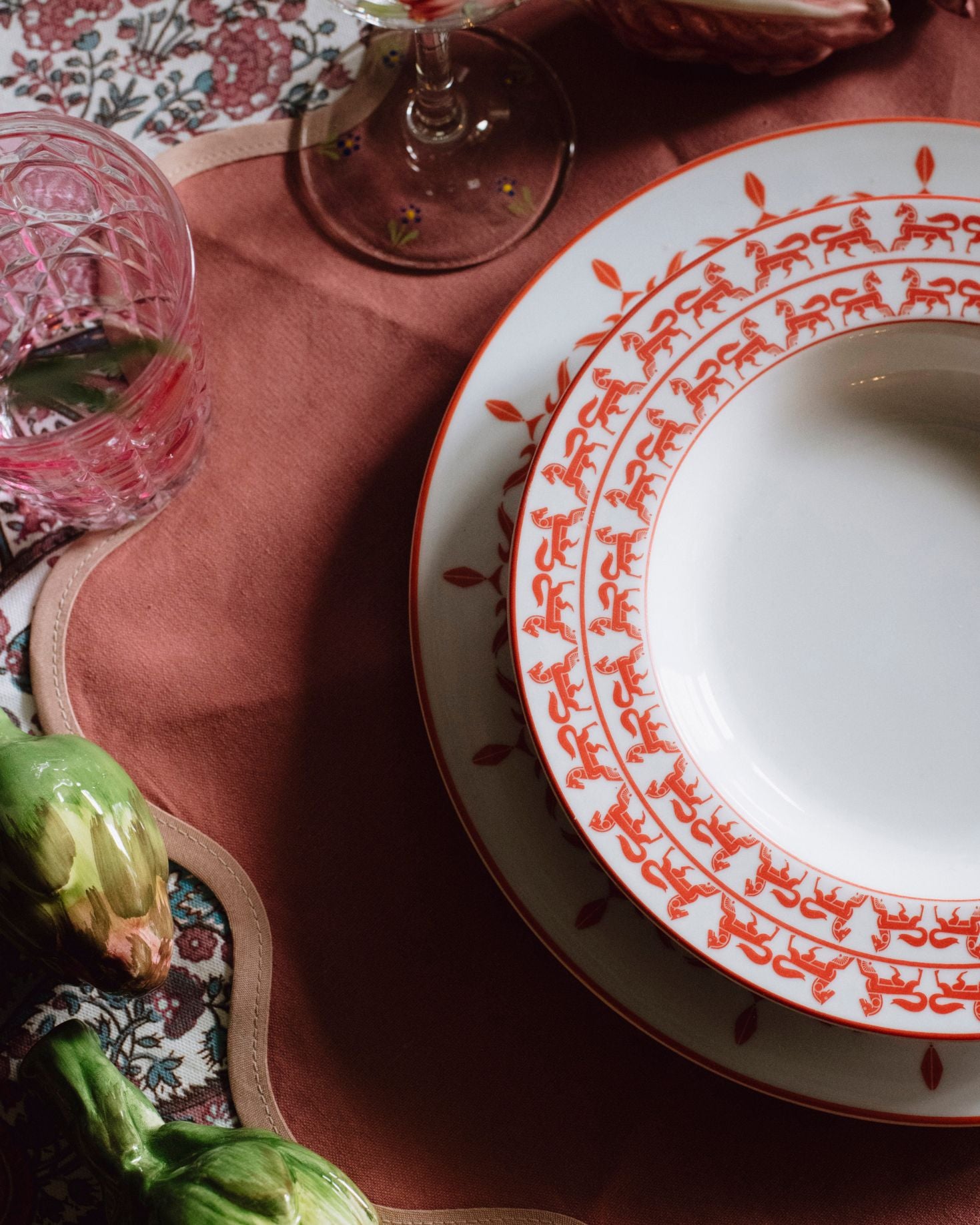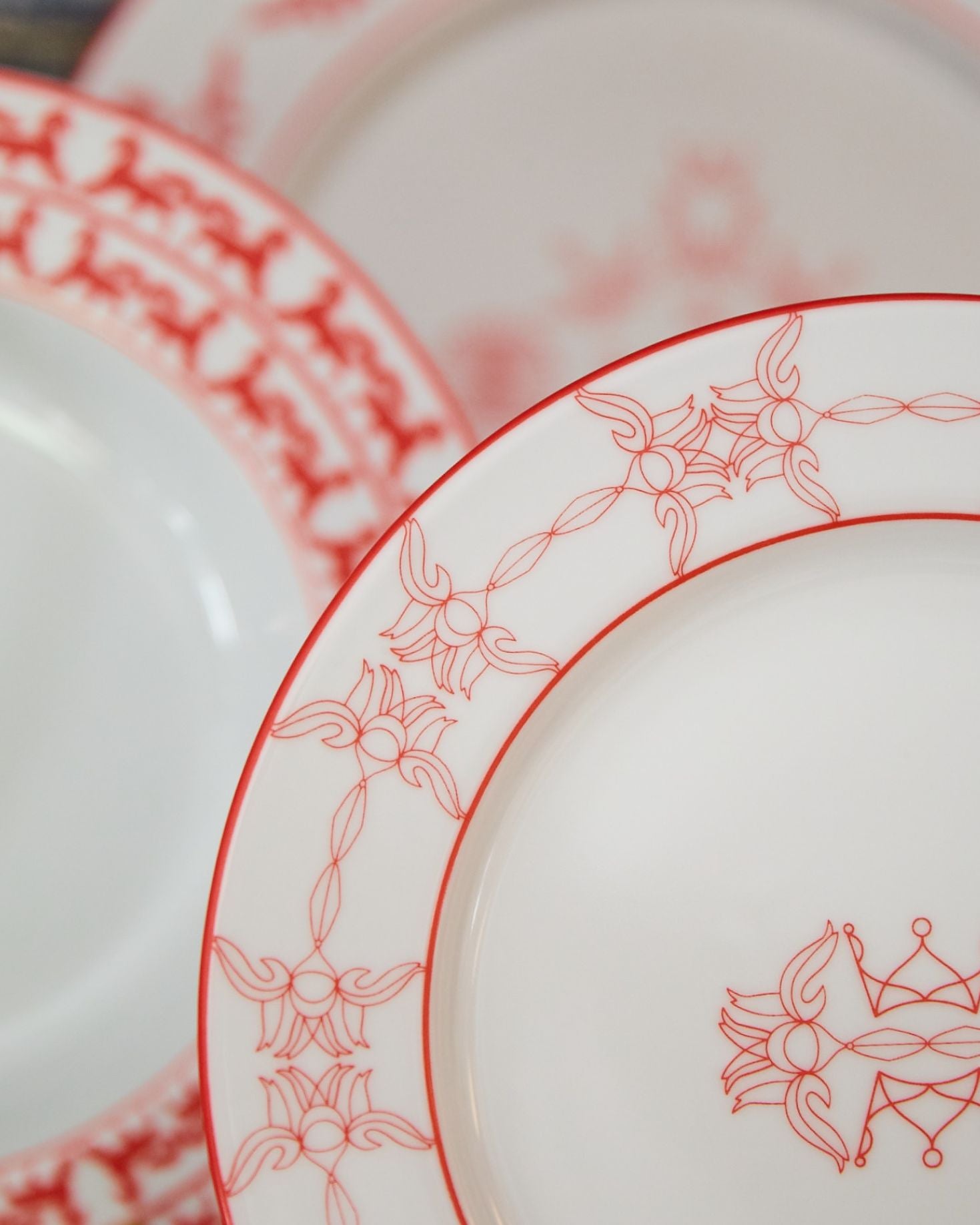Deep porcelain plate in white and coral, with different elements of the logo.