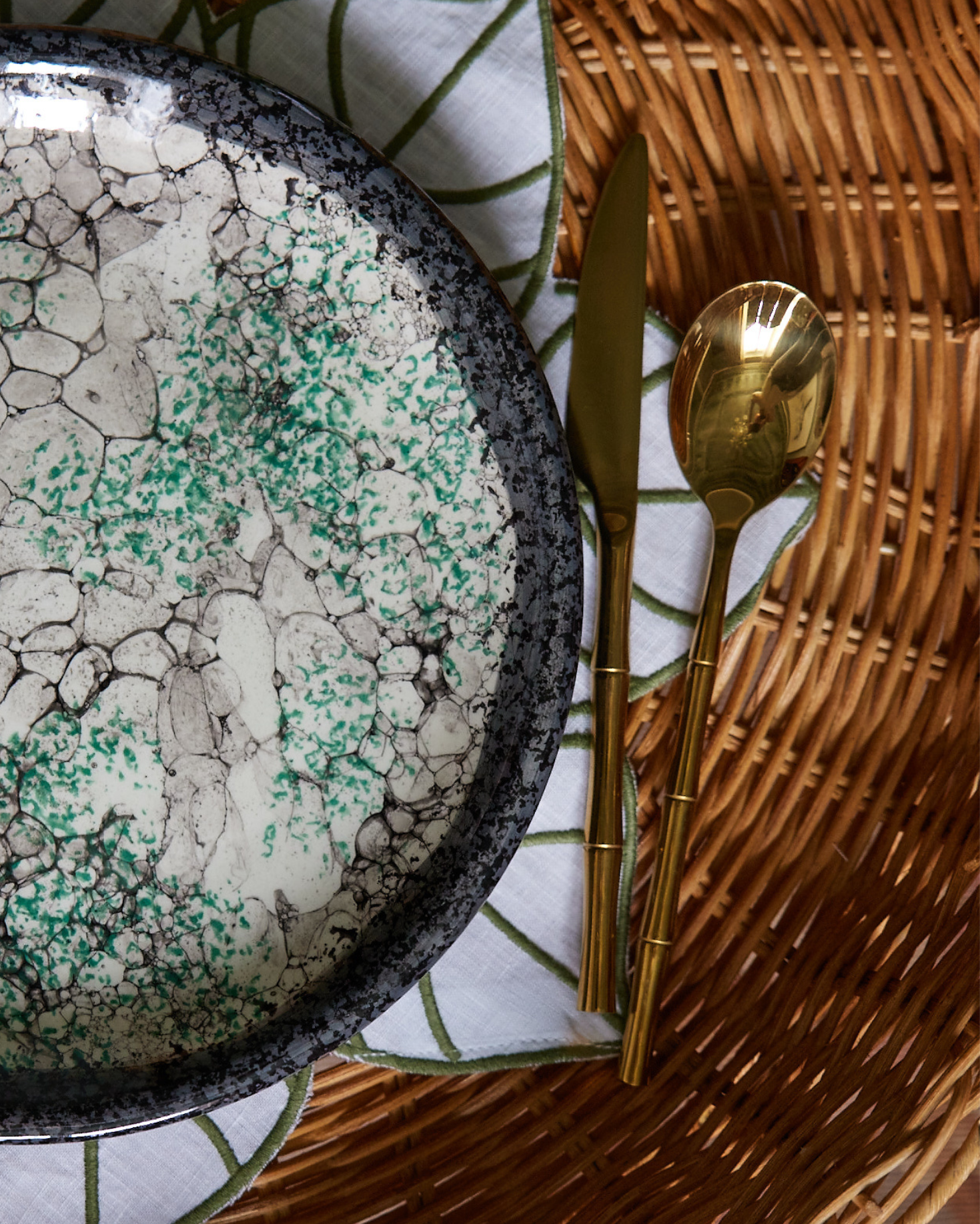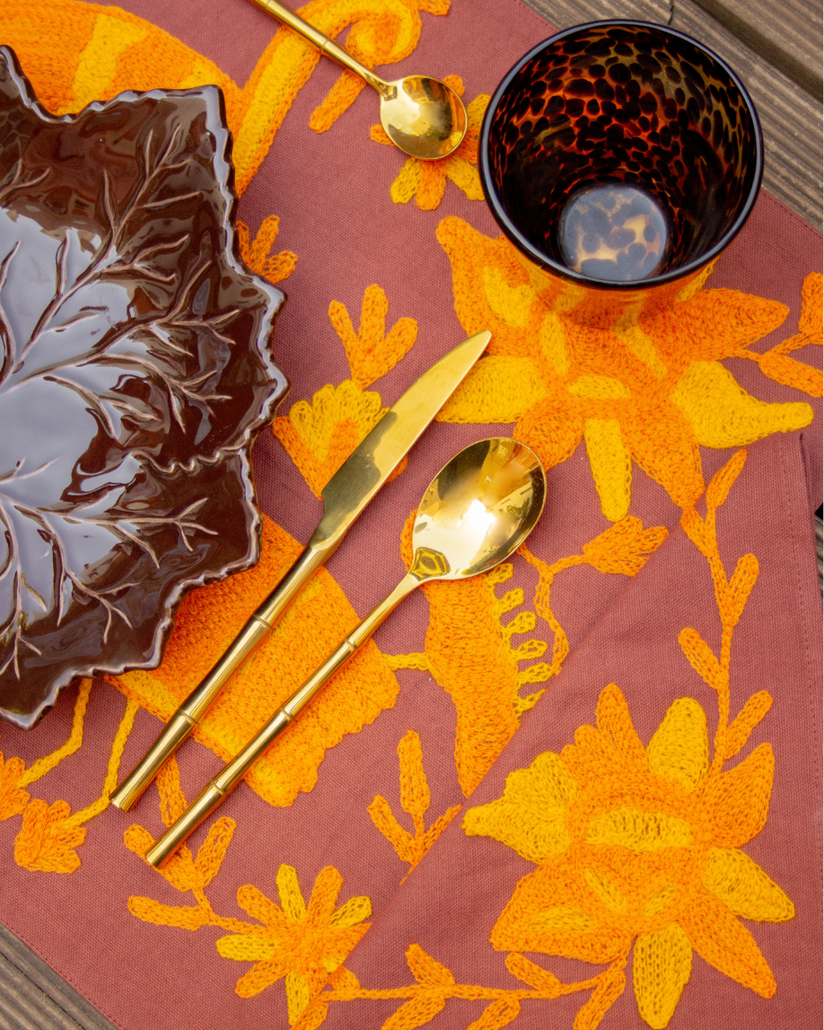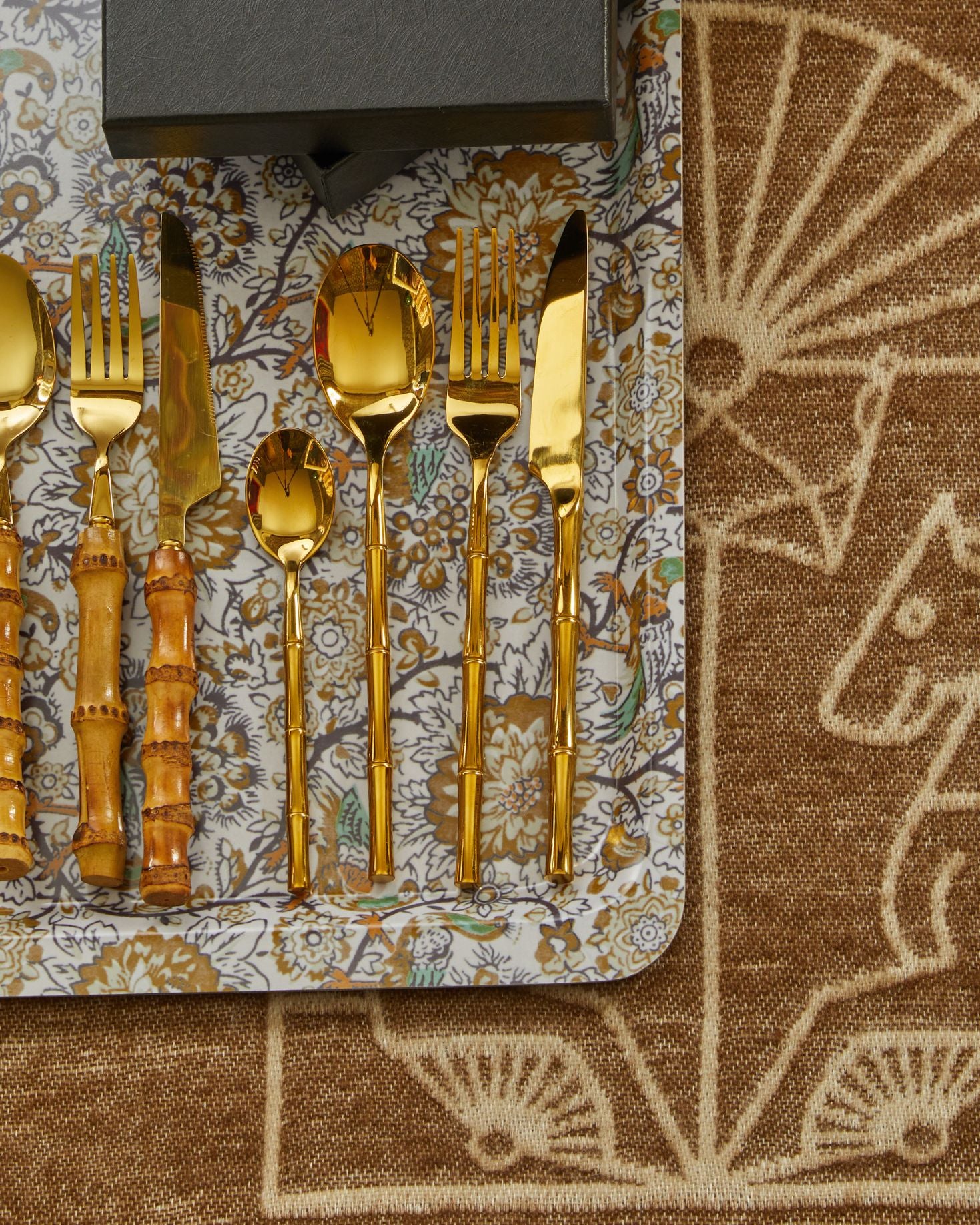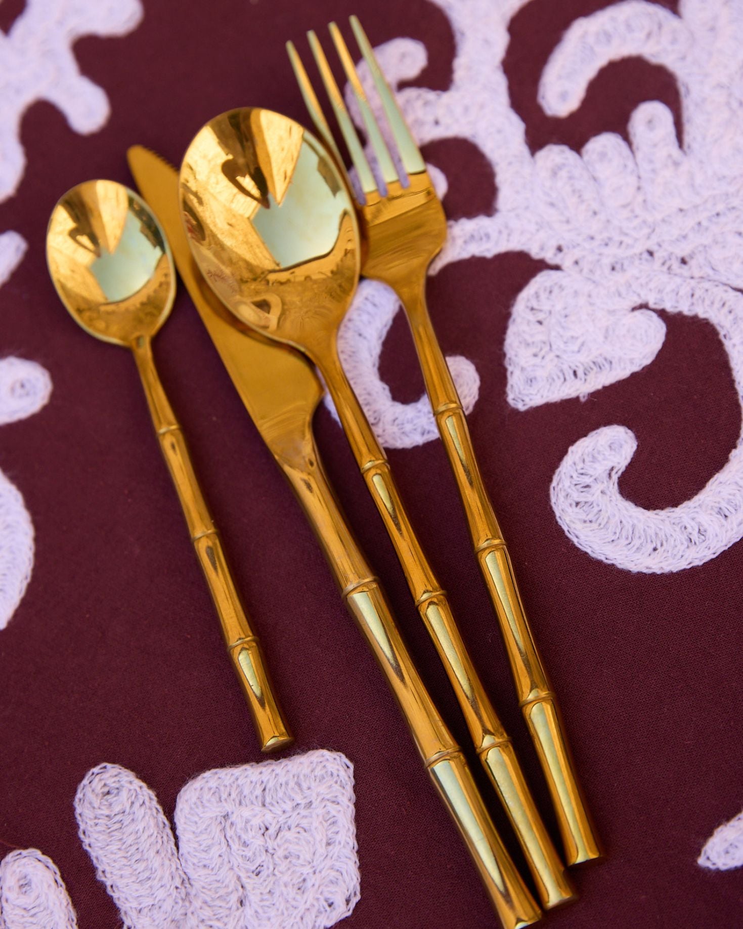 Gold-coloured stainless steel cutlery. The pieces are sold in boxes of 4 units in our black box screen-printed with the logo.