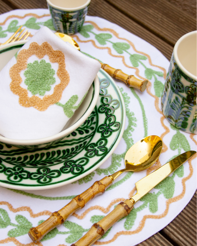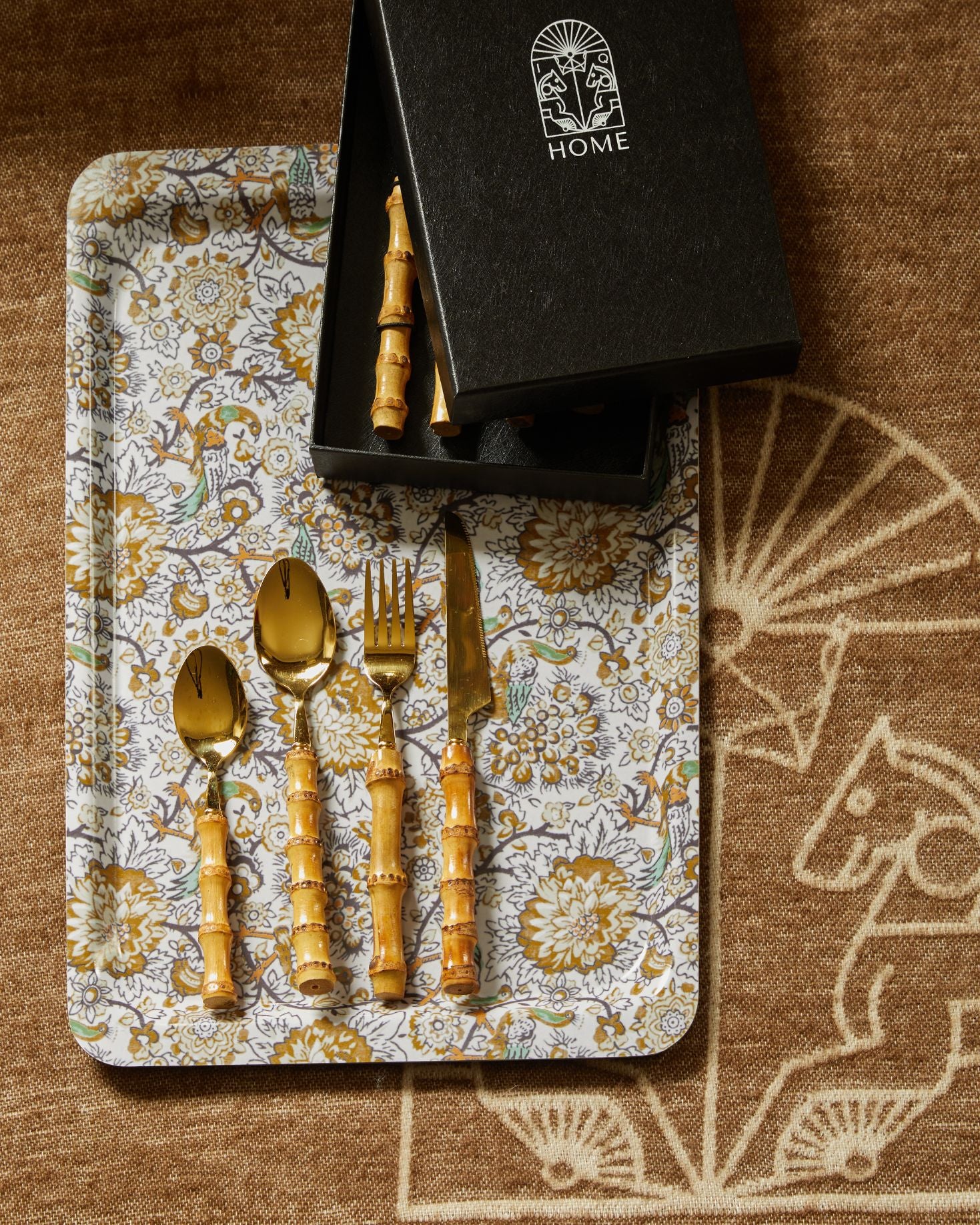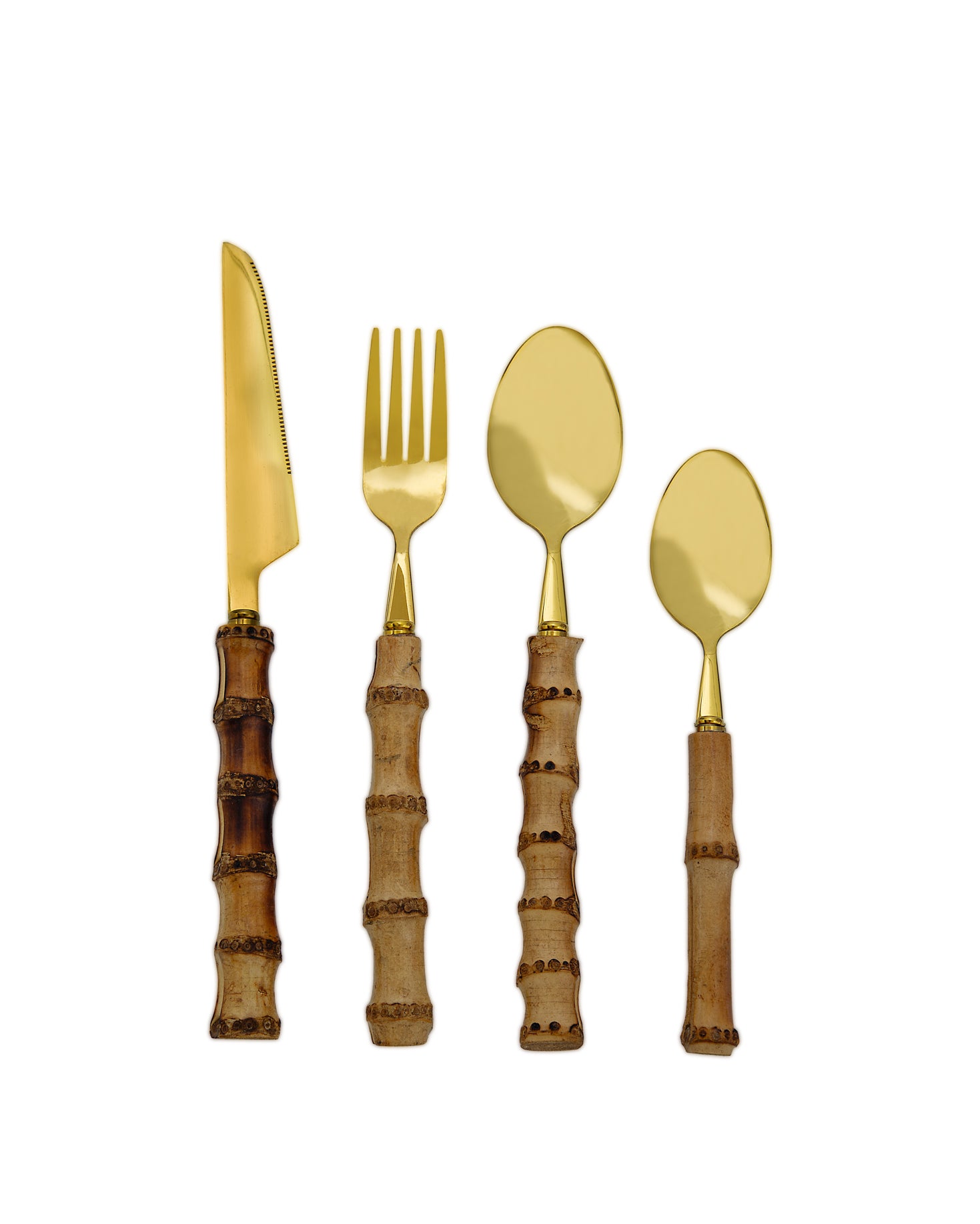 Gold-colored stainless steel cutlery with bamboo handles. Sold in boxes of 4 in our black box screen-printed with our logo.