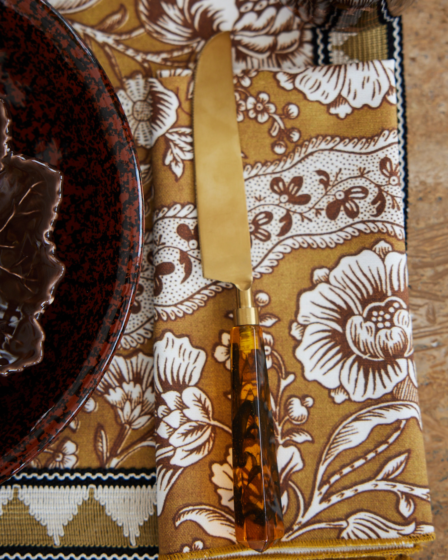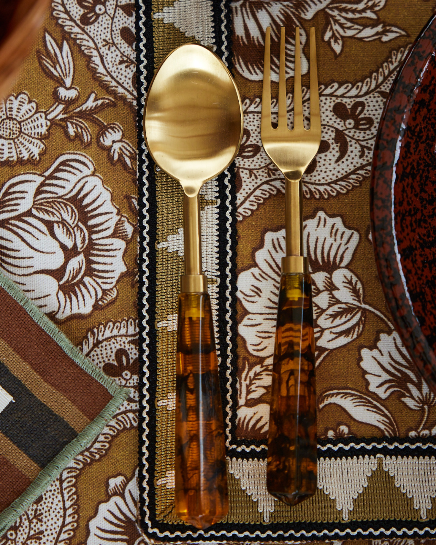 Gold-coloured stainless steel cutlery with tortoiseshell handles. The pieces are sold in boxes of 6 units.