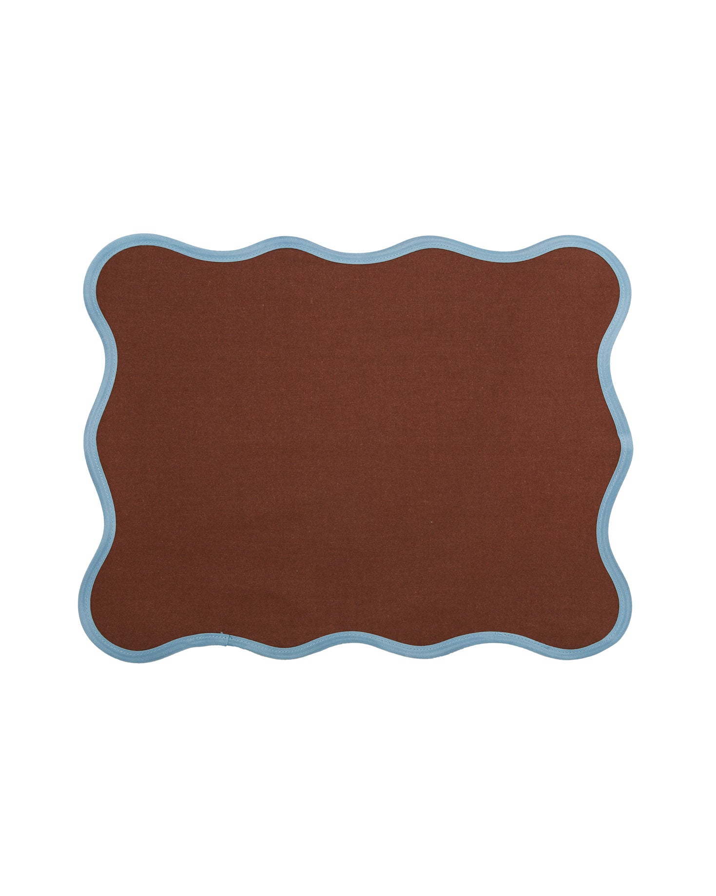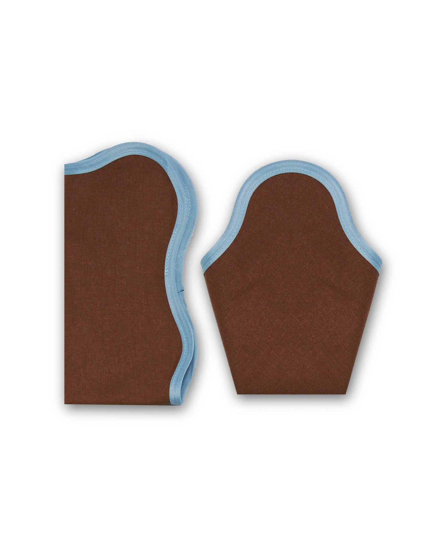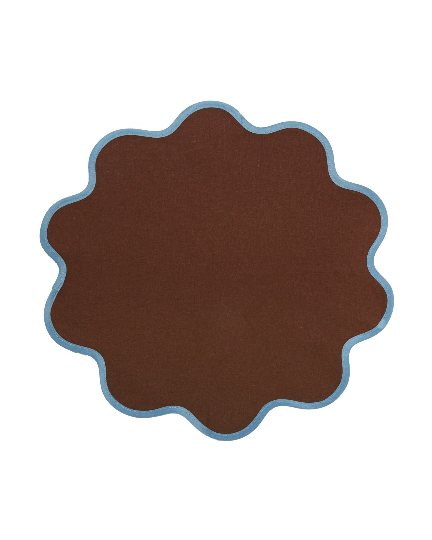 Individual set and brown napkin in round and square shape with blue scalloped trim. Sold in a pack of 2. Made of 100% cotton.