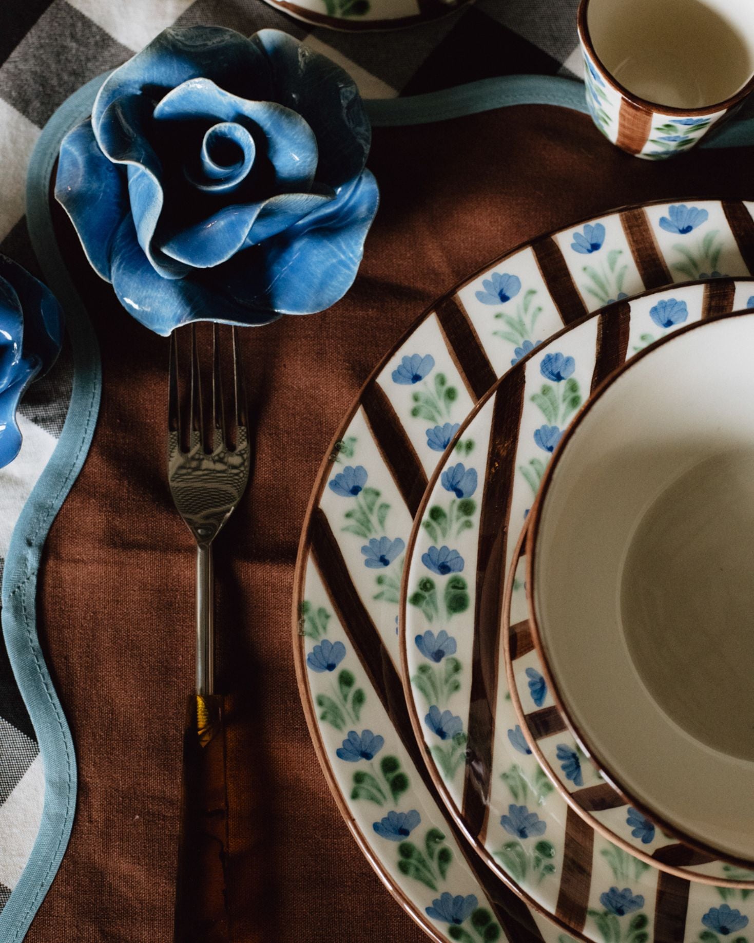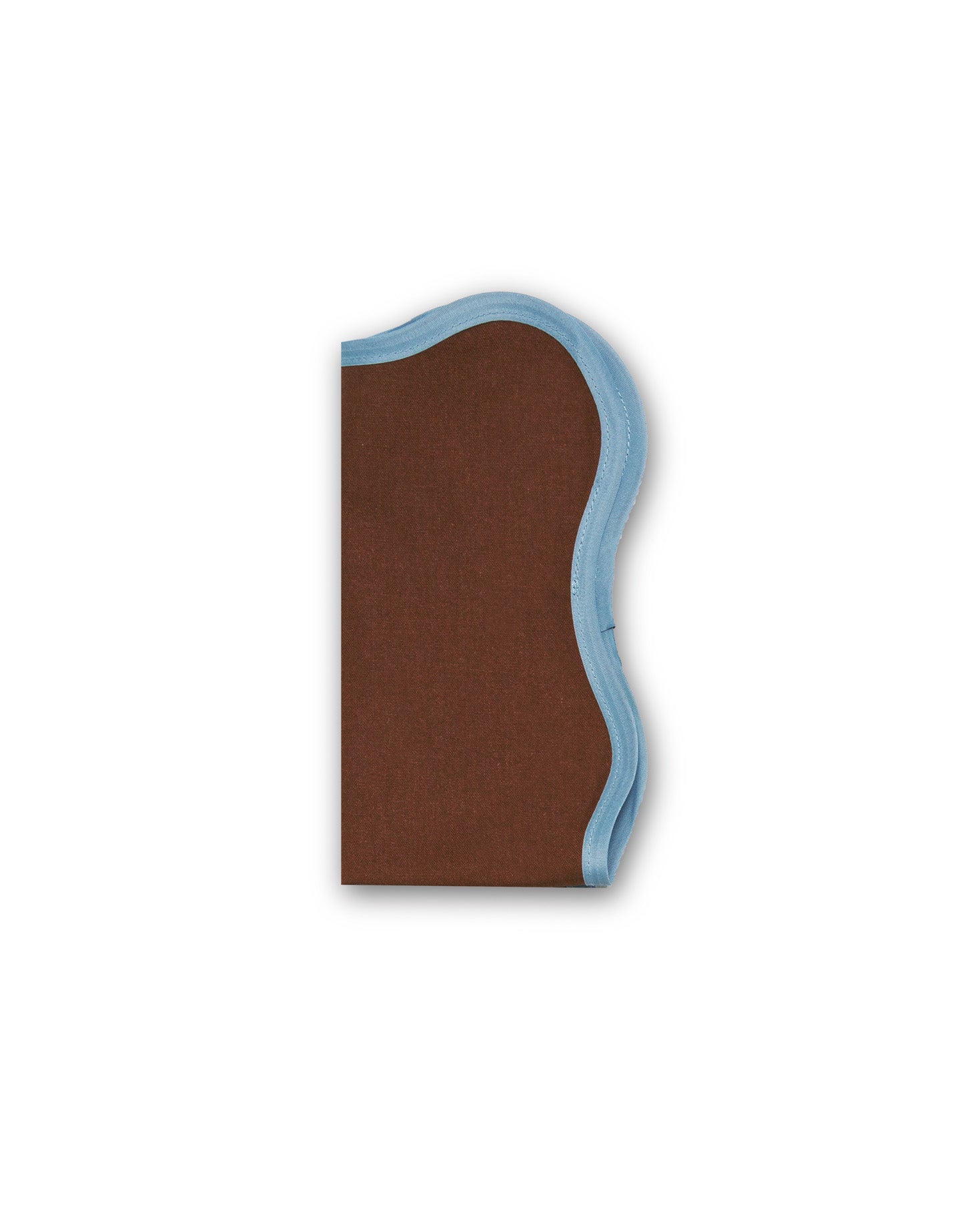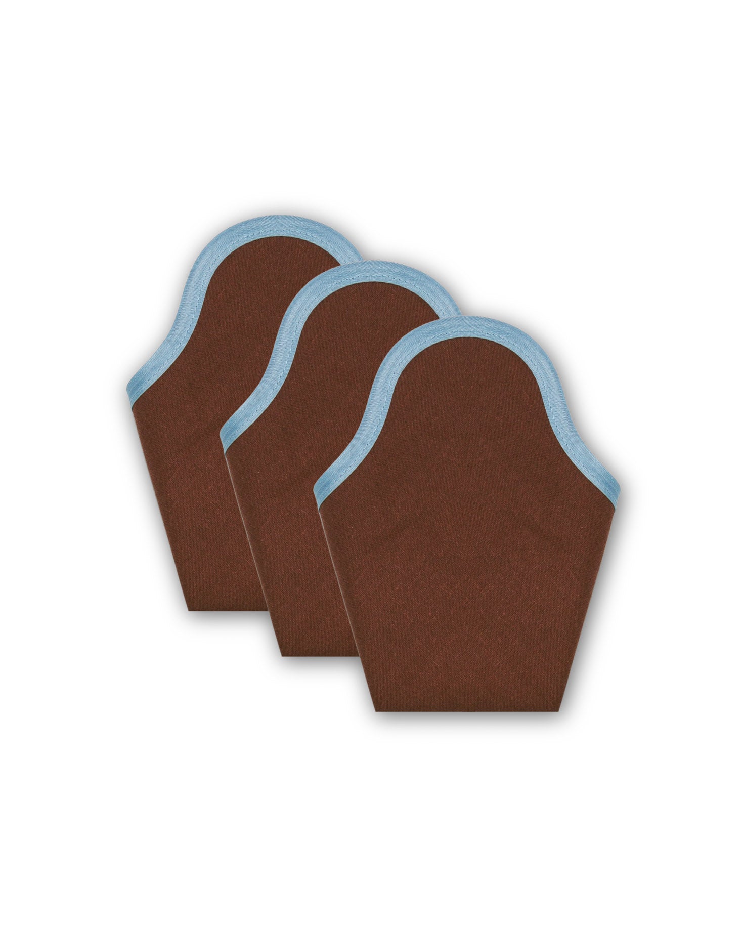 Individual set and brown napkin in round and square shape with blue scalloped trim. Sold in a pack of 2. Made of 100% cotton.