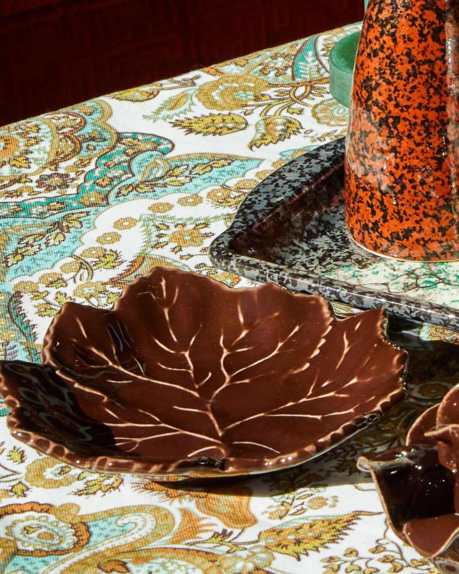 Leaf-shaped flat plate made of hand-painted brown ceramic.