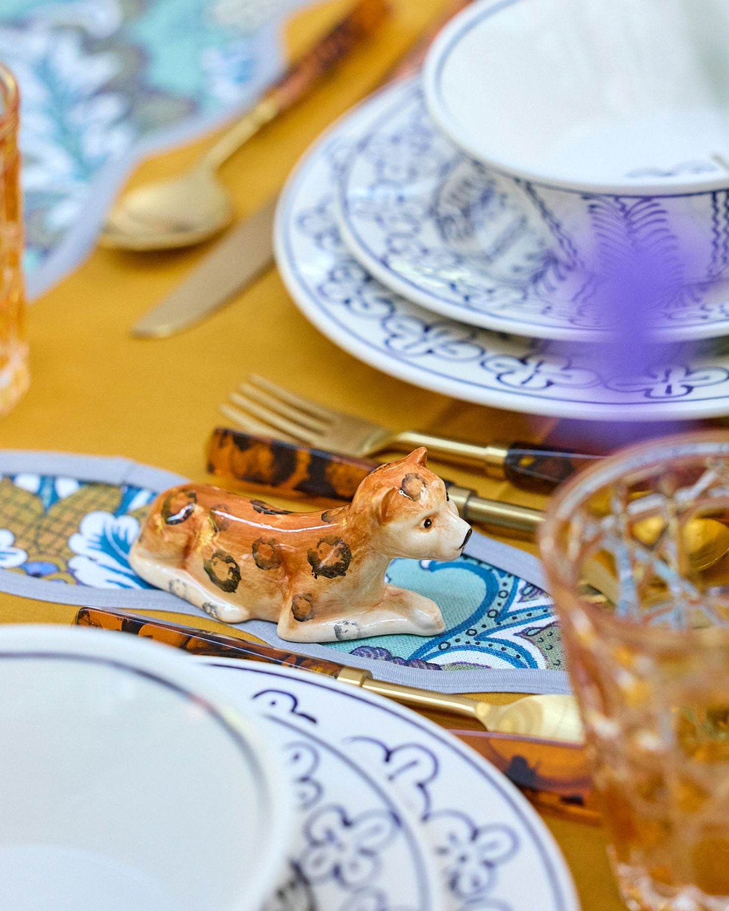 Set of two ceramic accessories in the shape of a sitting and lying leopard, hand painted.