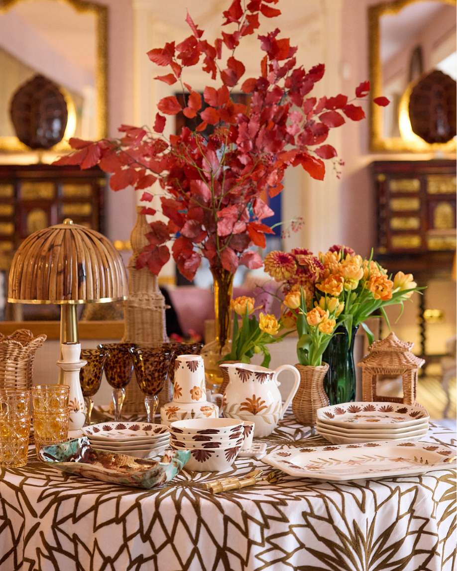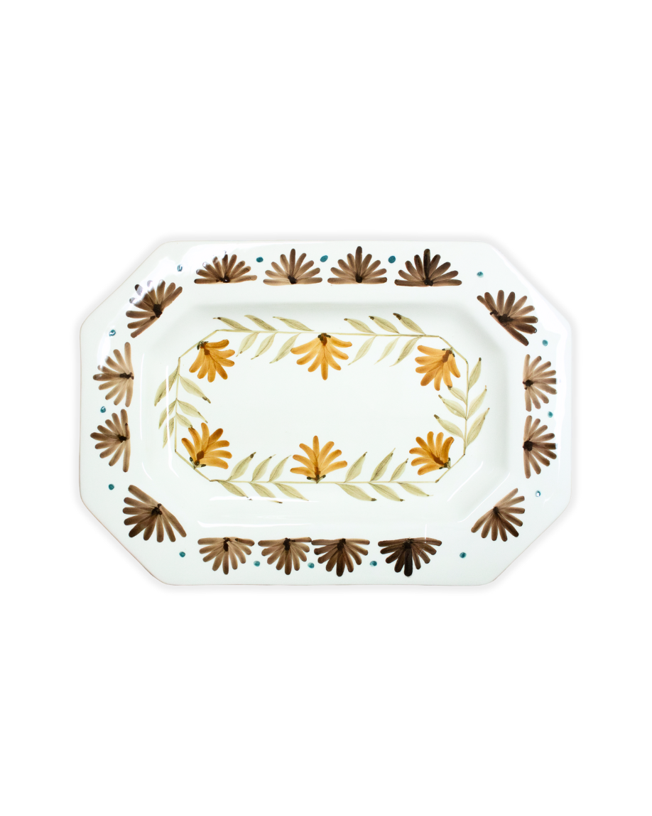 Fuente rectangular de aperitivo hecha en cerámica pintada a mano en tonos terracota y marrón con detalles florales. También disponible en tonos verdes y azules.