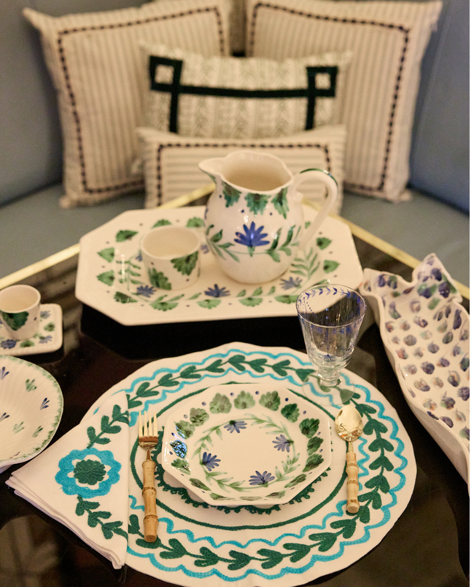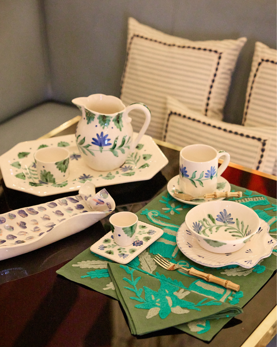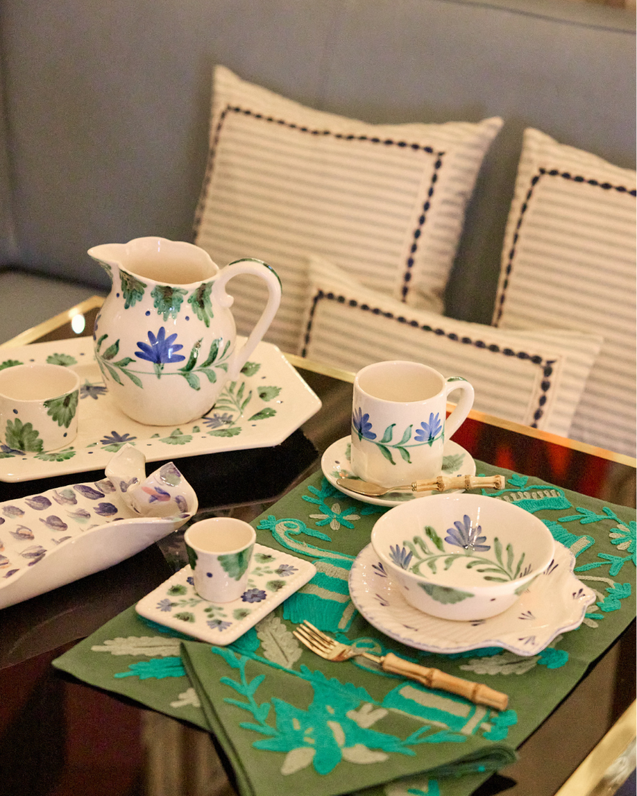 Fuente rectangular de aperitivo hecha en cerámica pintada a mano en tonos verdes y azules con detalles florales. También disponible en color terracota.