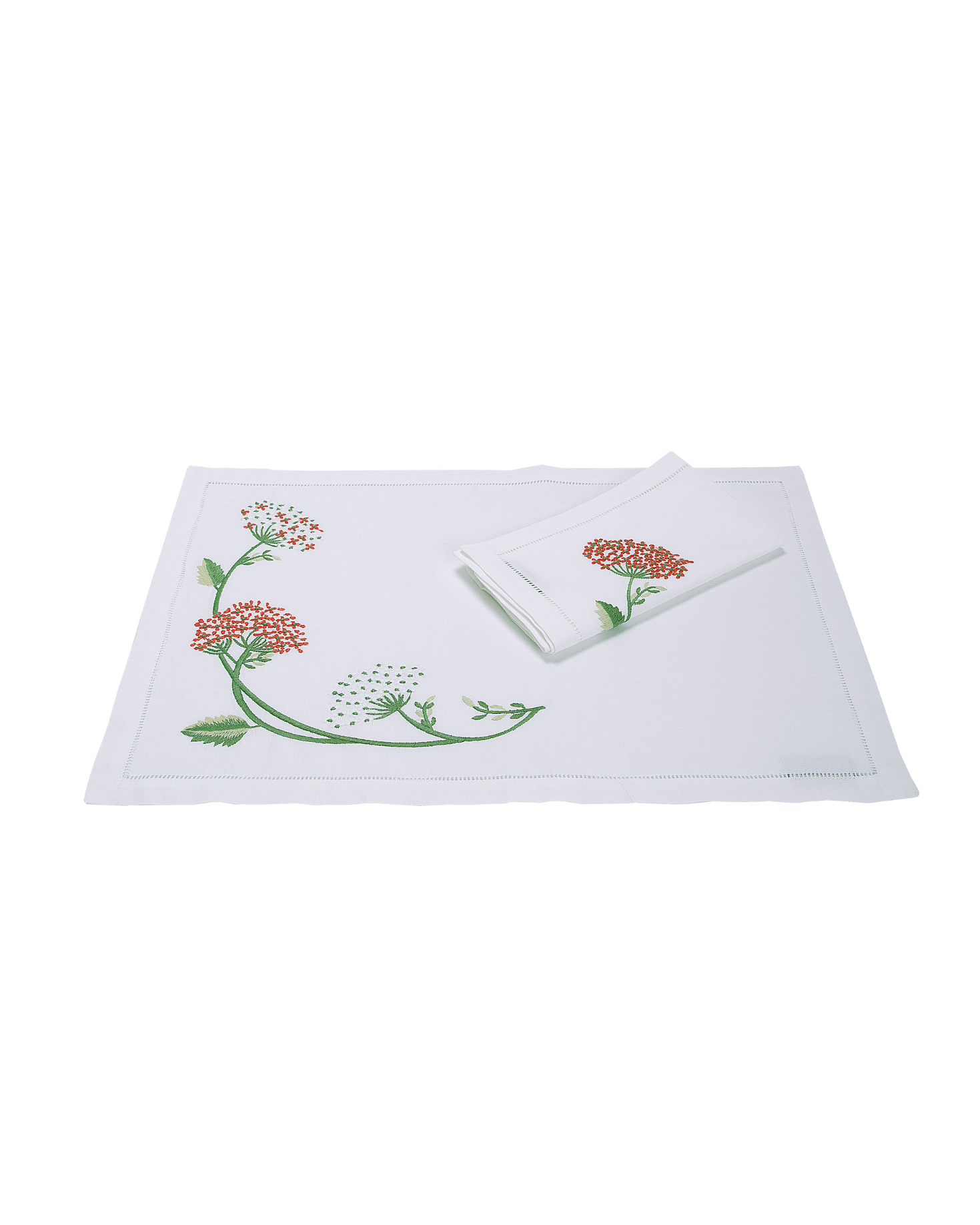 Individual set and napkin with embroidered floral details. Made of 100% linen.