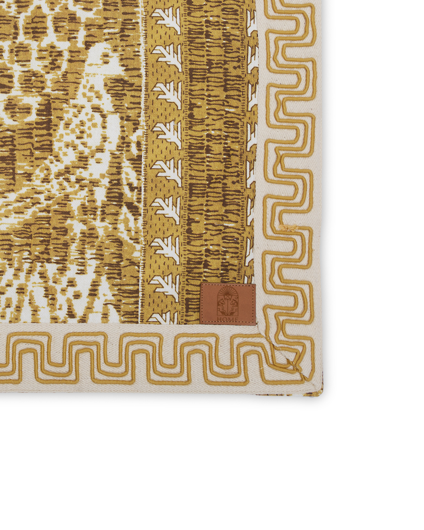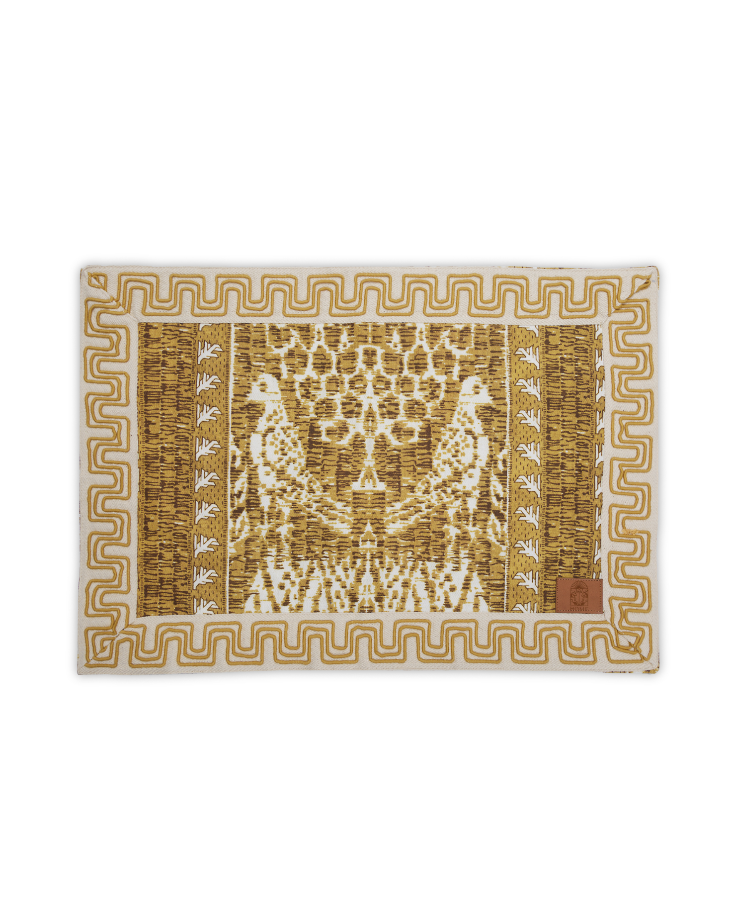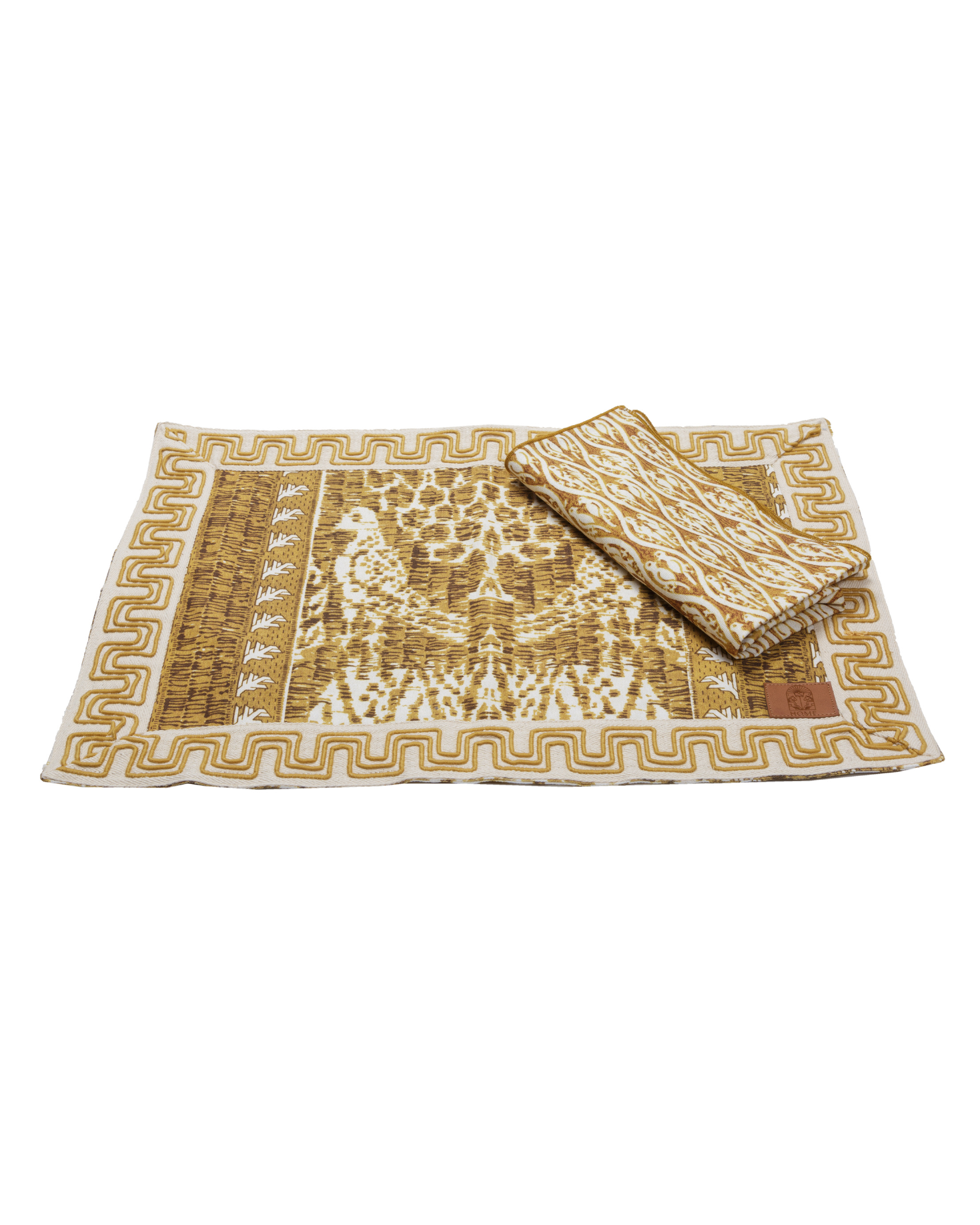 Mustard-toned cotton placemat and napkin set with print Exclusively for IQ Home. Border detail. Also available in red and green.