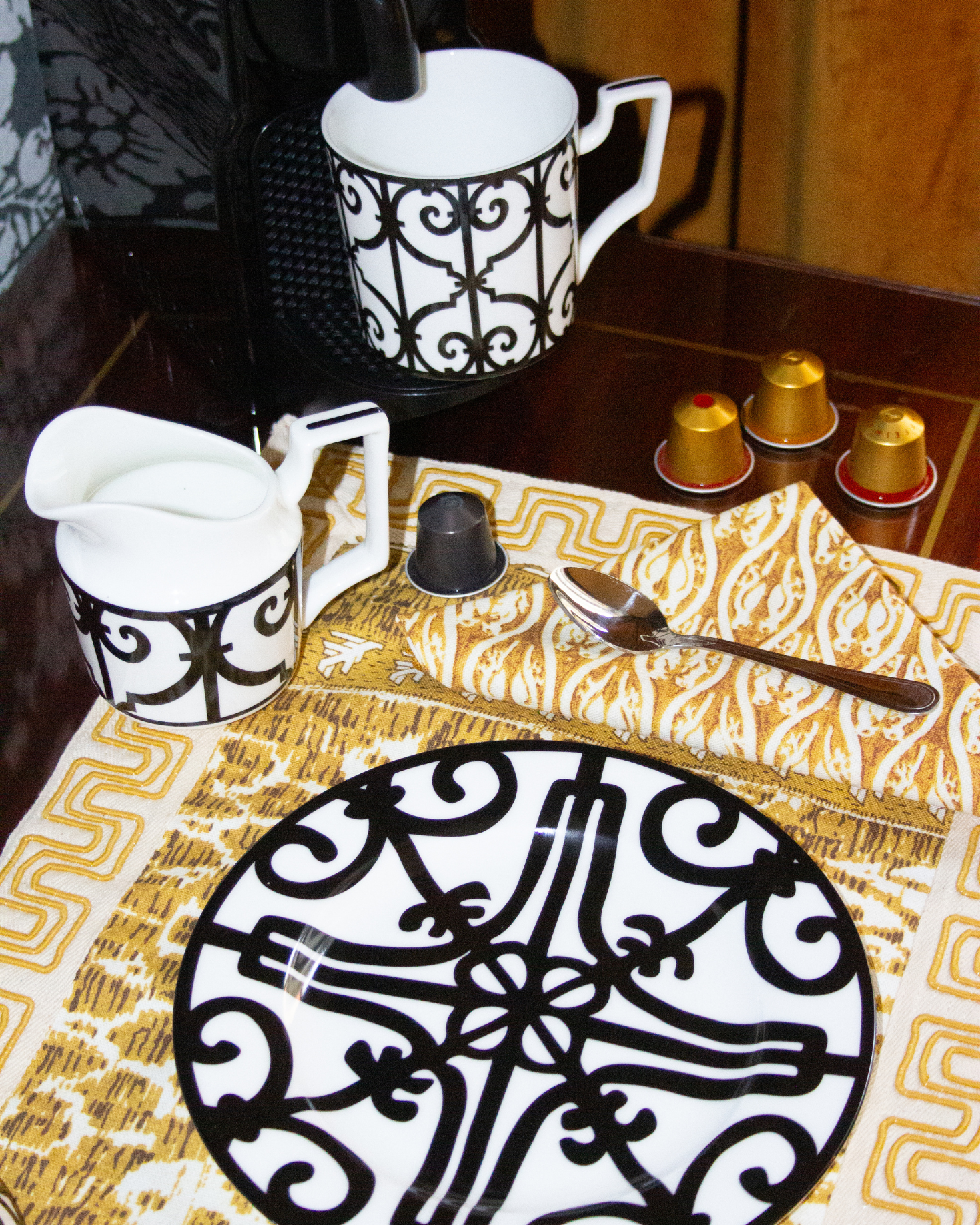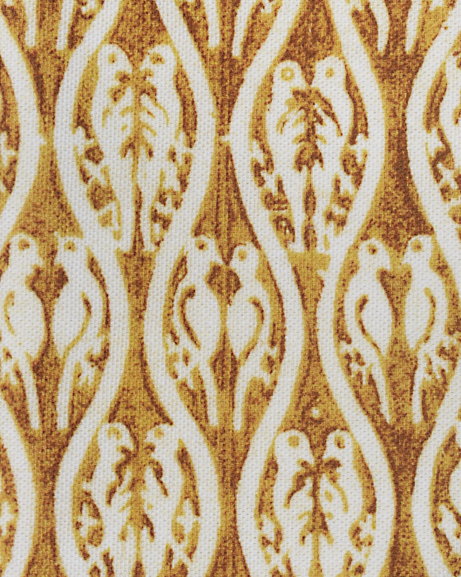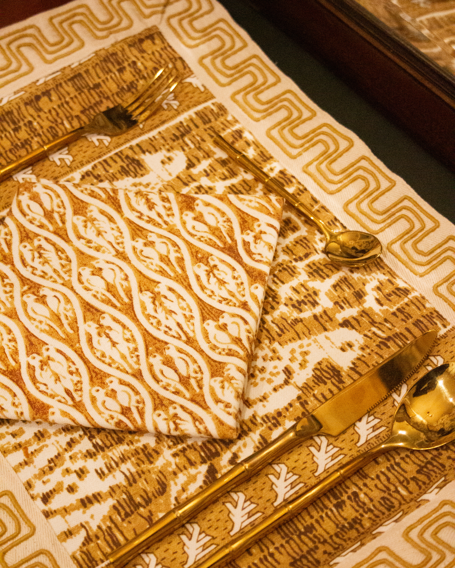 Mustard-toned cotton placemat and napkin set with print Exclusively for IQ Home. Border detail. Also available in red and green.