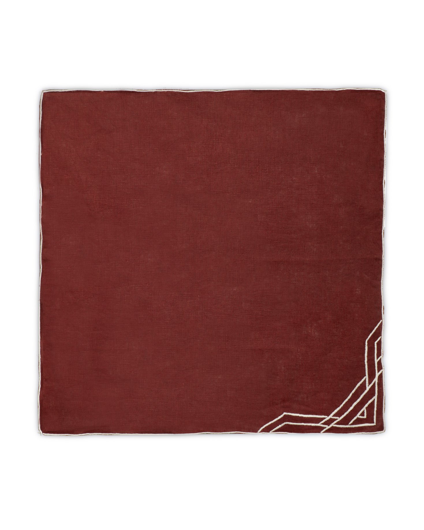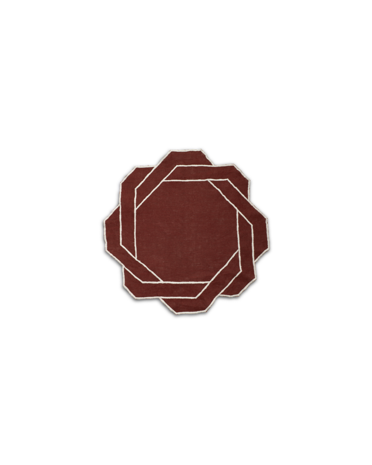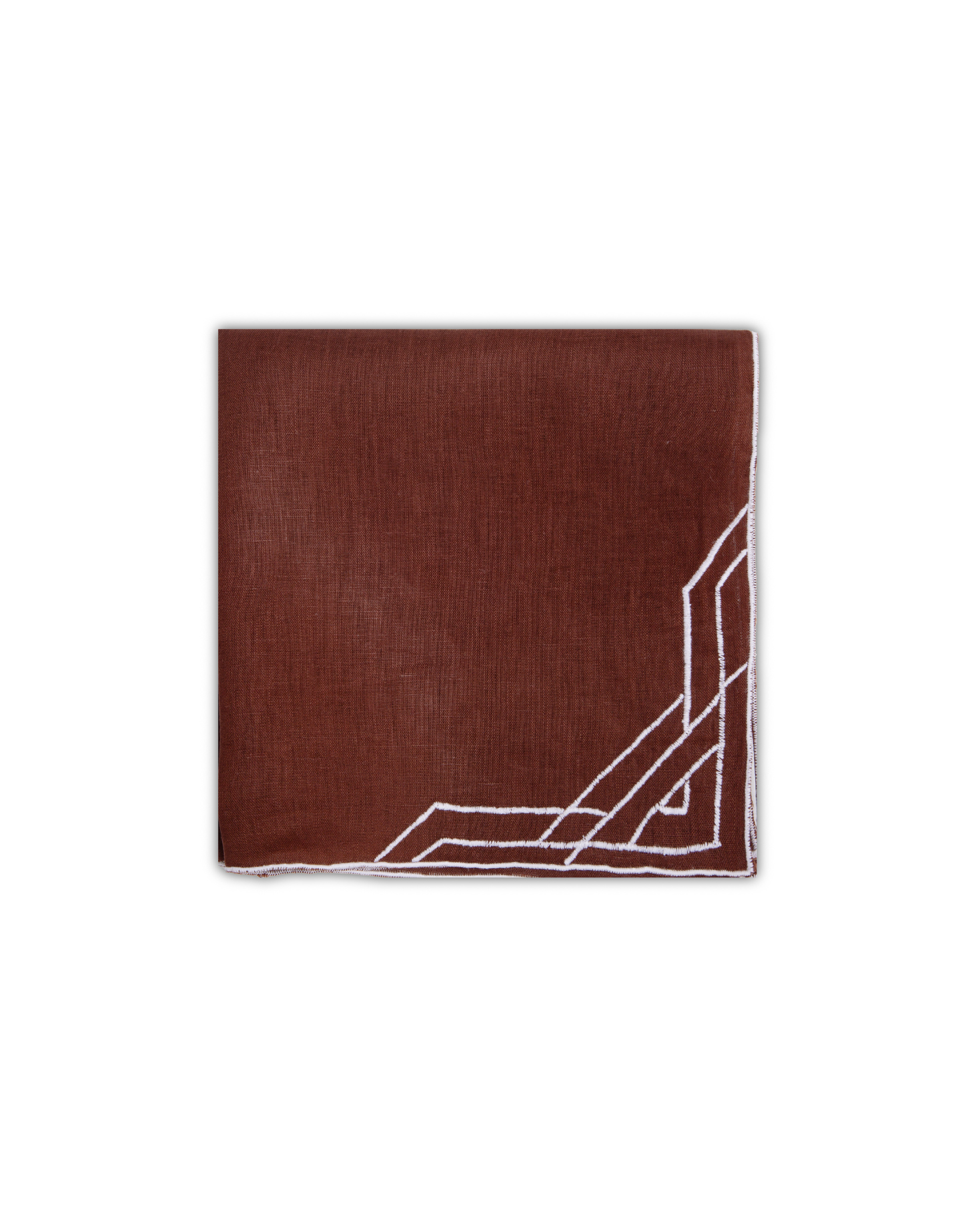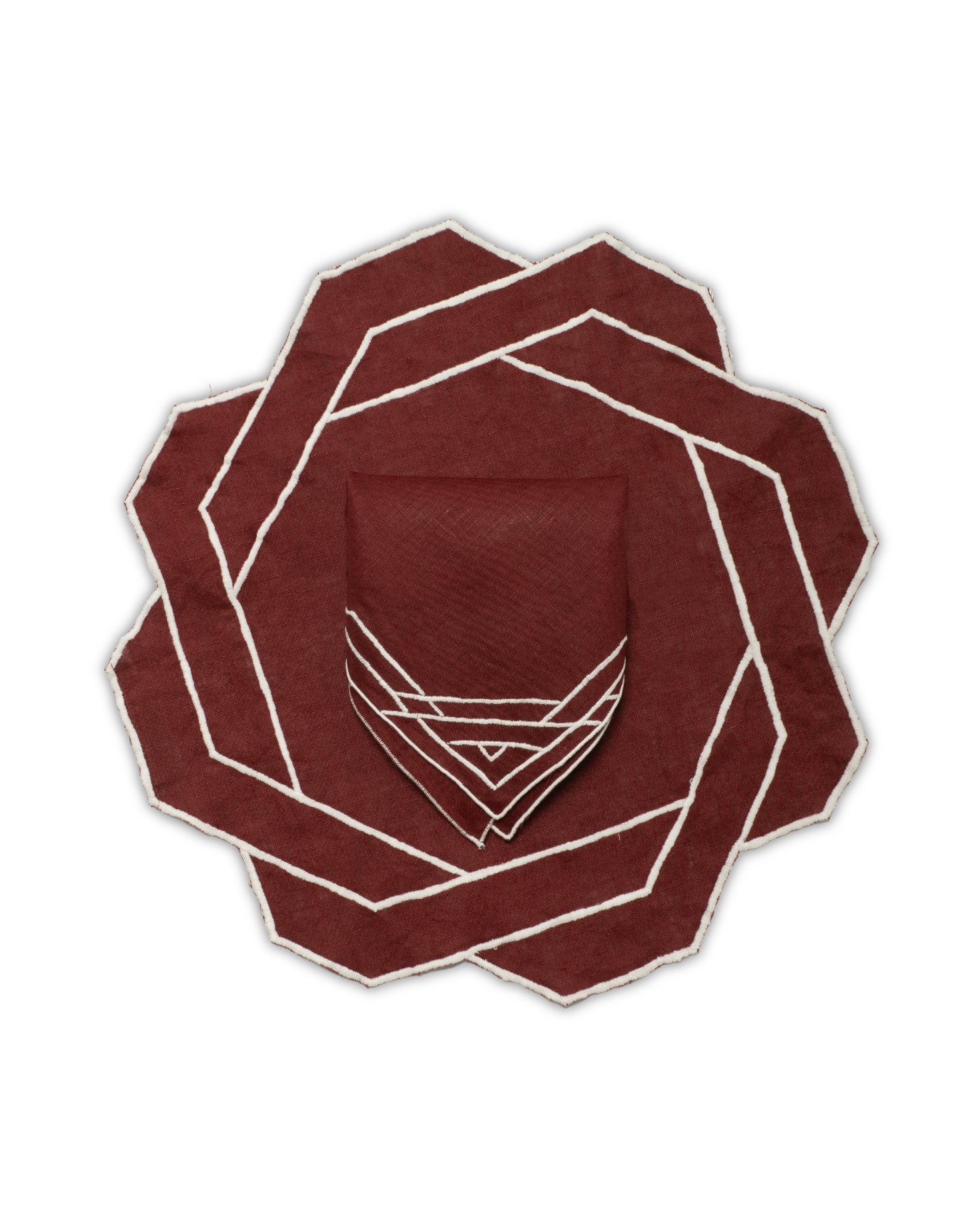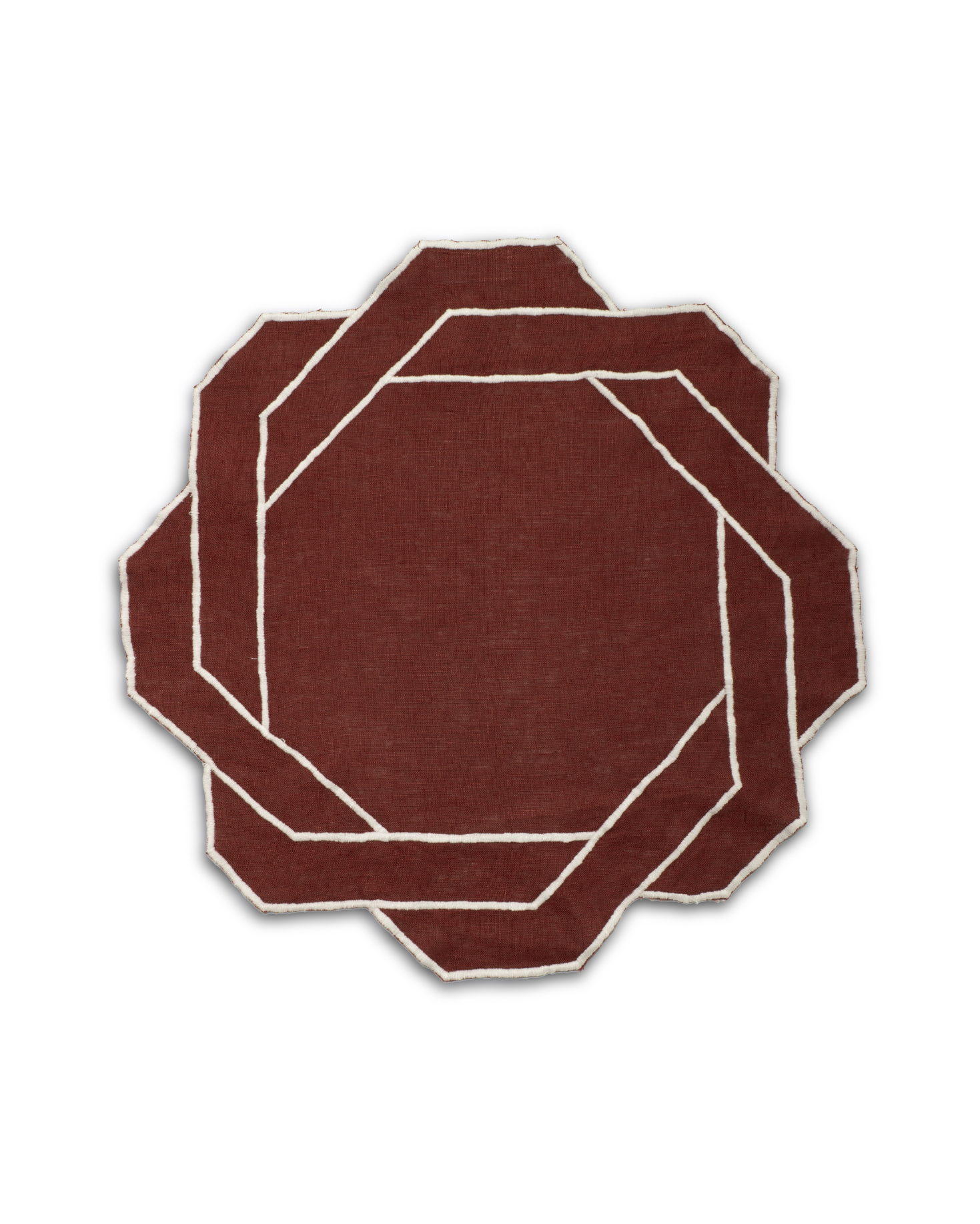 Placemat, napkin, and coaster set with a brown geometric design and white embroidery. Made of 100% linen. Also available in blue.