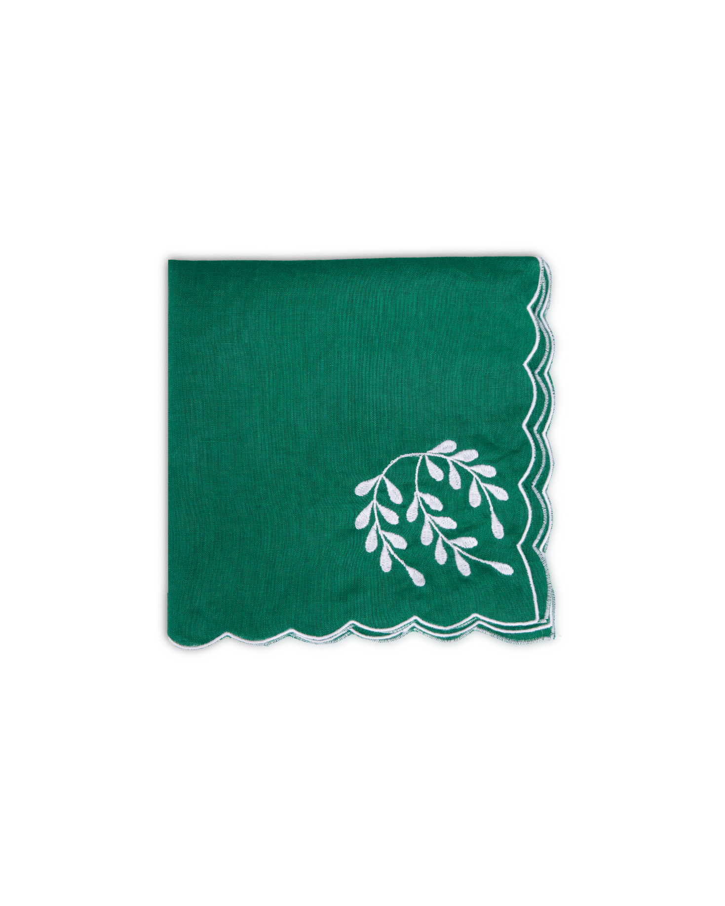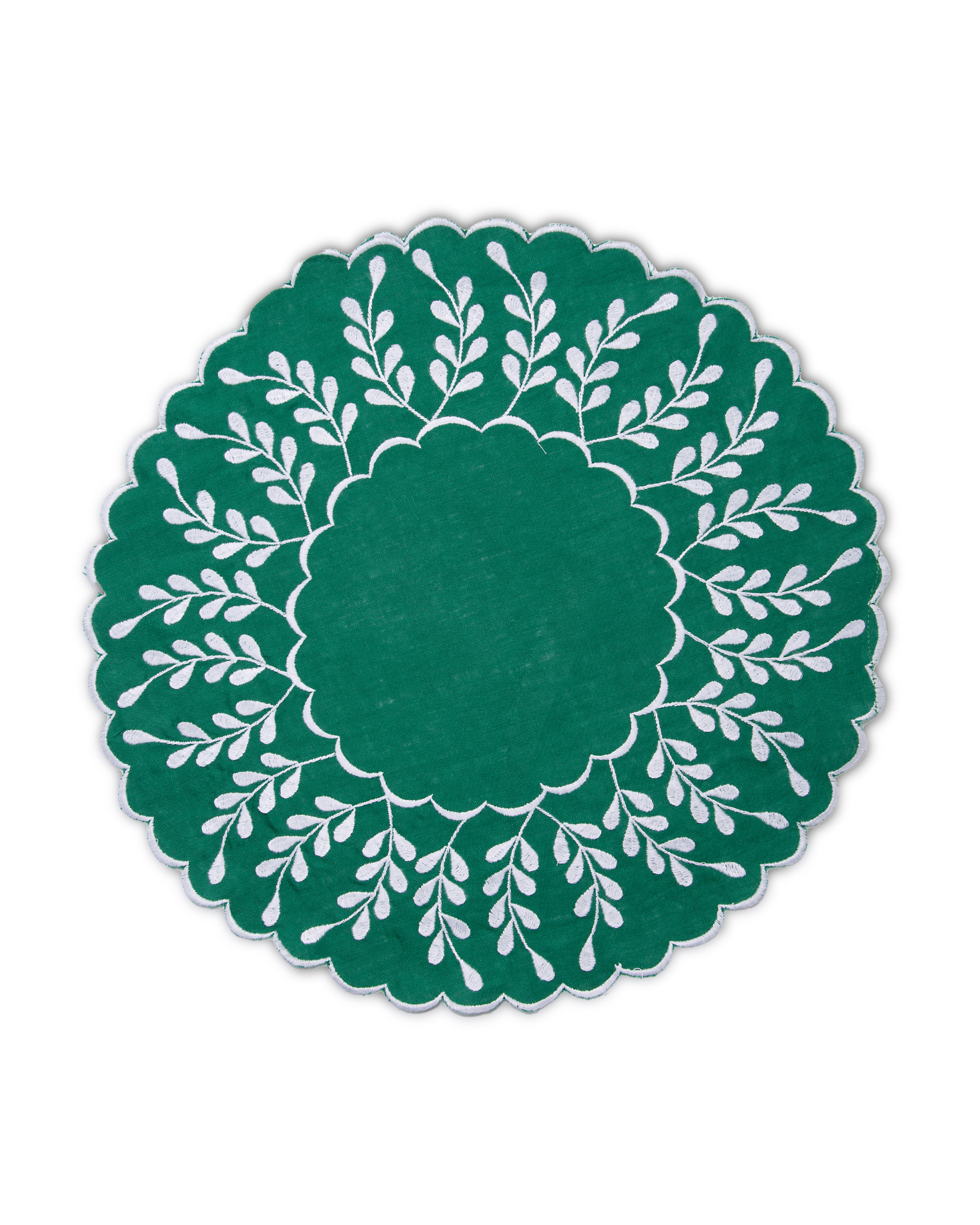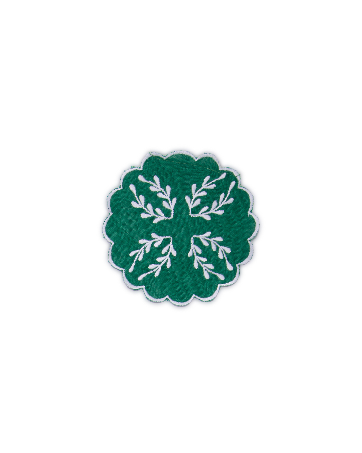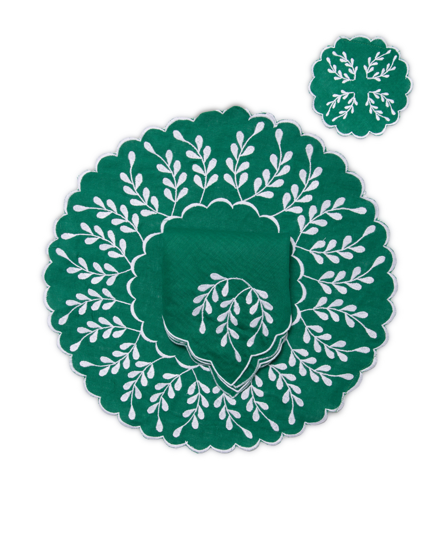 Individual napkin and coaster set with a round design and branch embroidery. In green with white embroidery. Made of 100% linen.