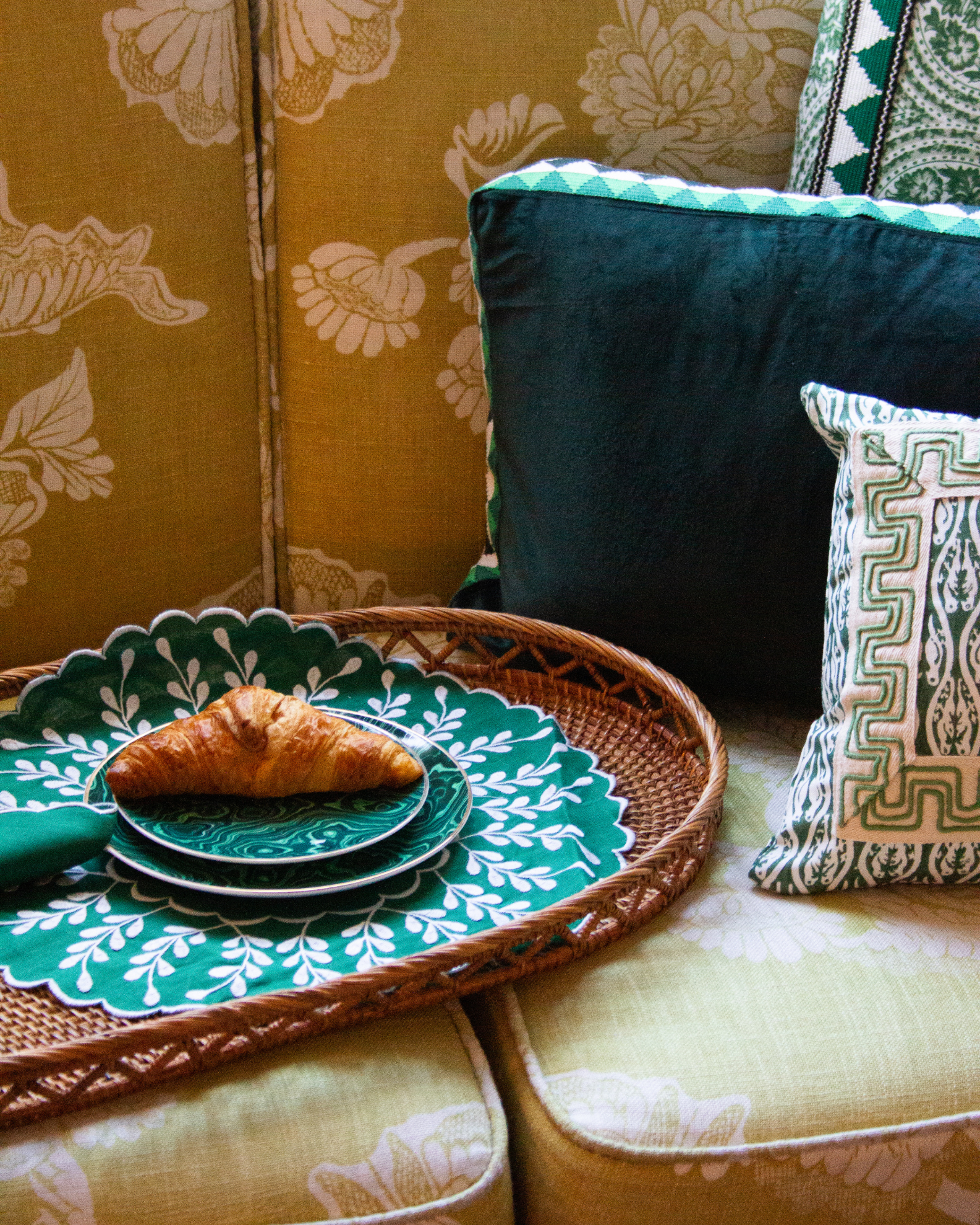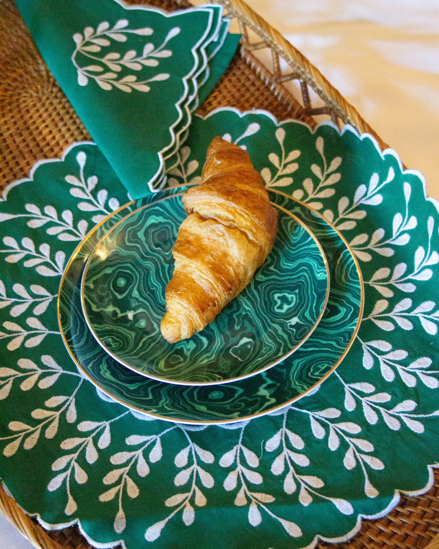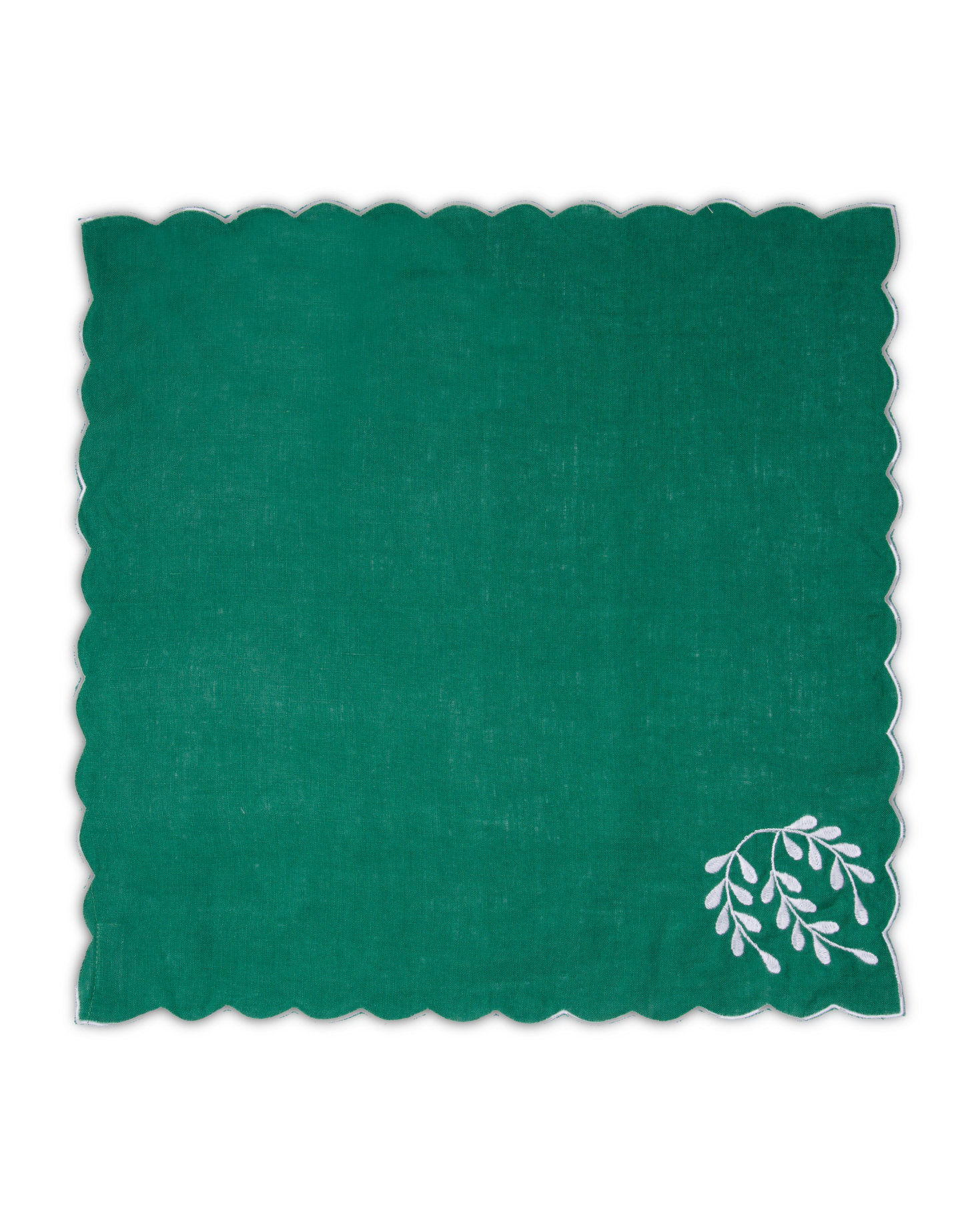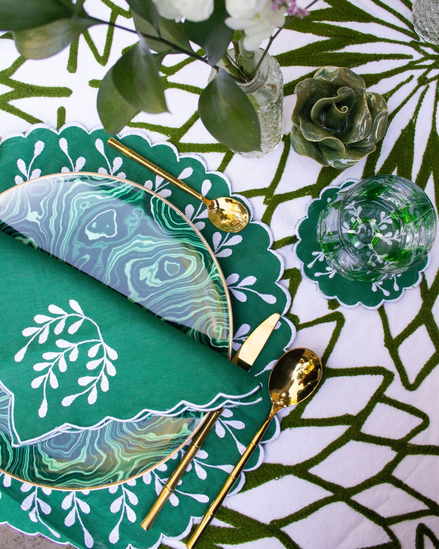 Individual napkin and coaster set with a round design and branch embroidery. In green with white embroidery. Made of 100% linen.