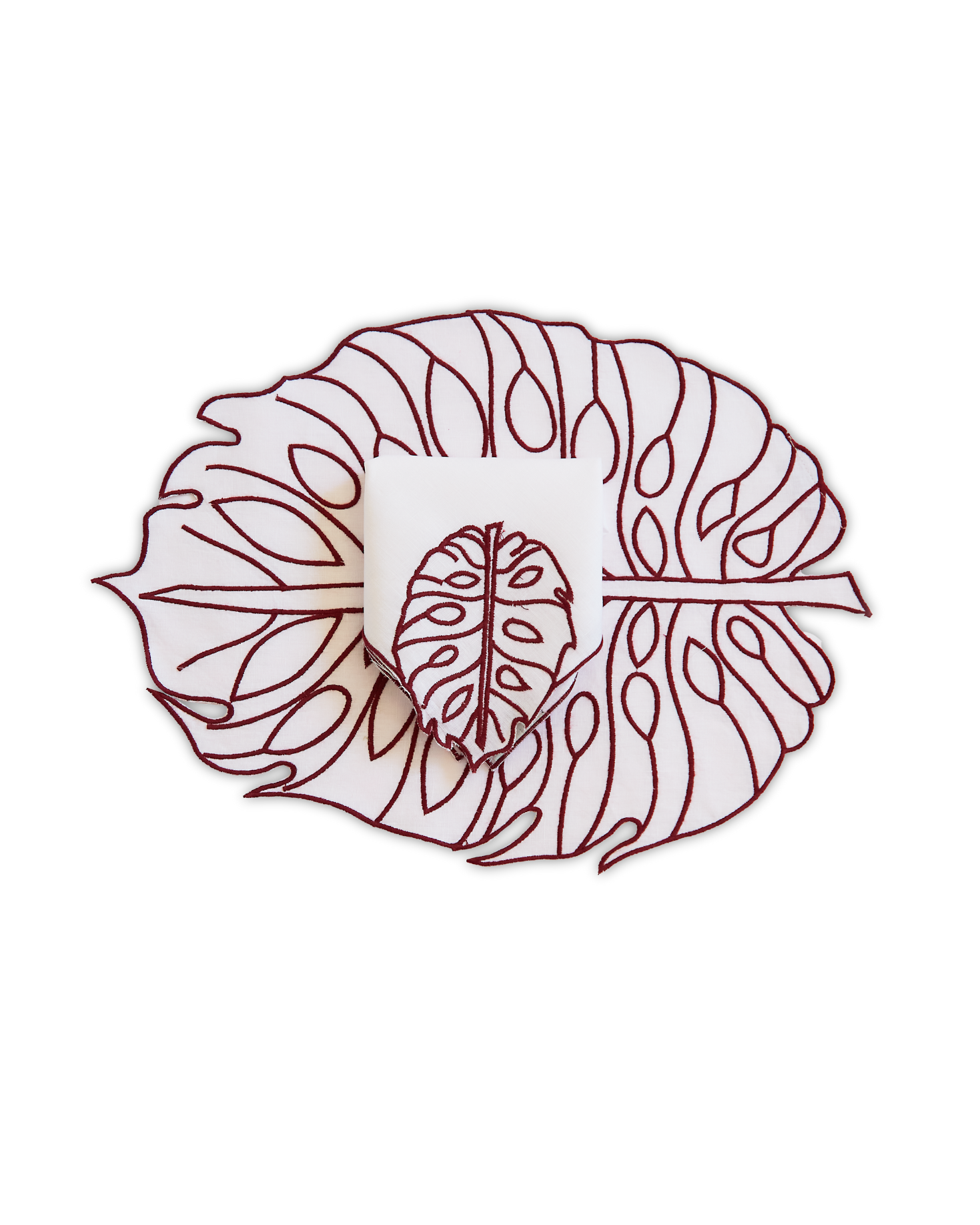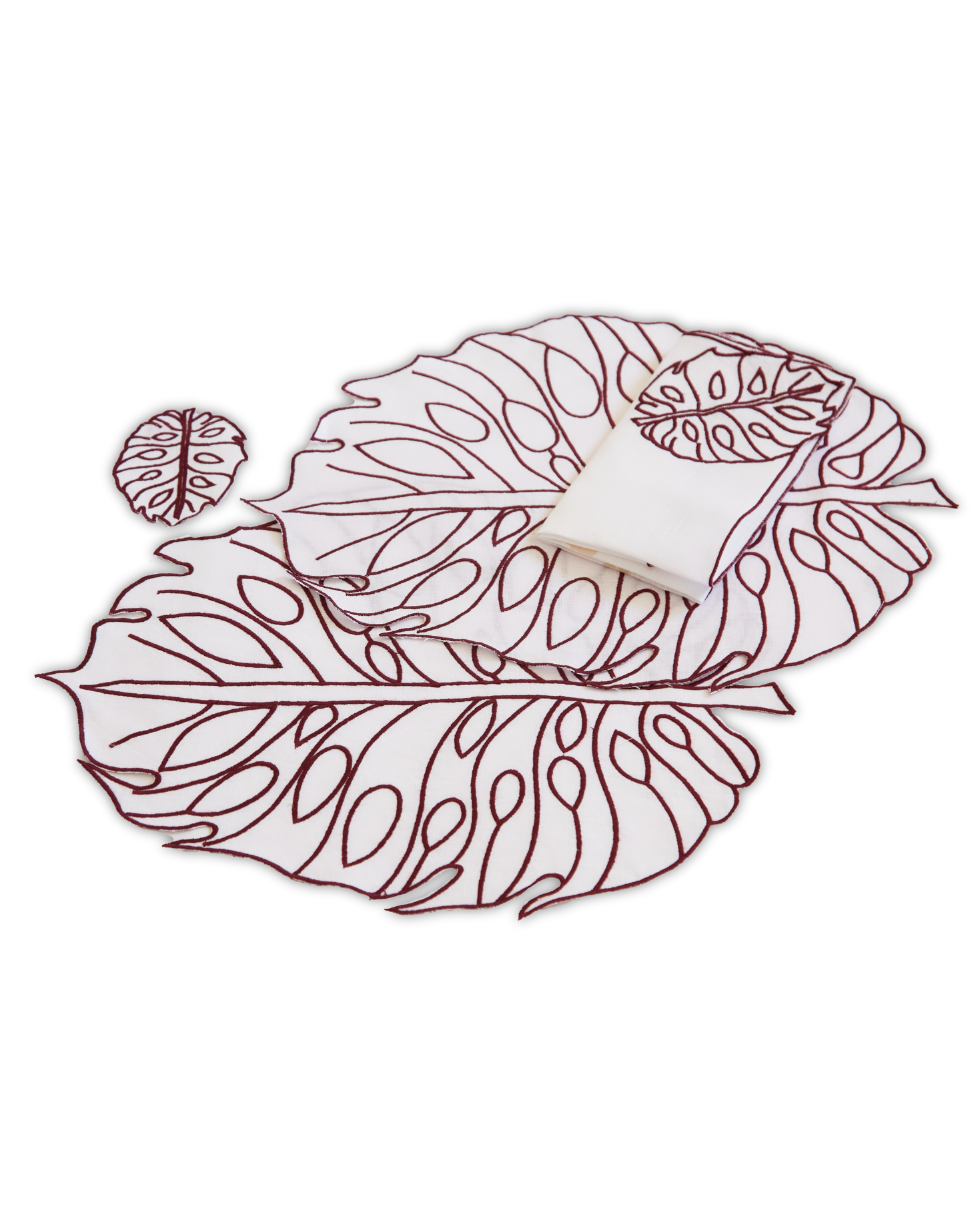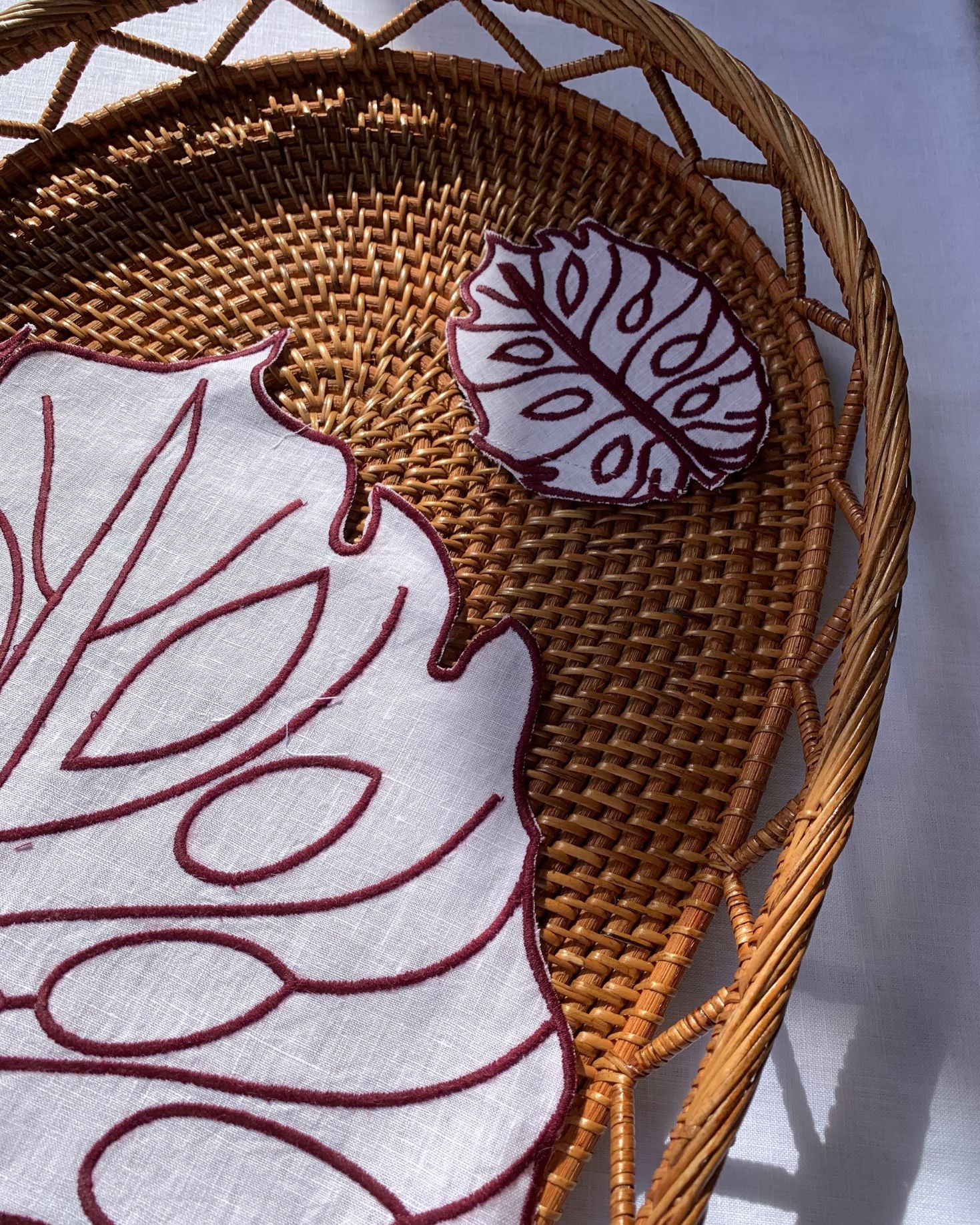 Individual set, napkin and coaster with leaf design. Made of 100% linen, embroidered in burgundy color.