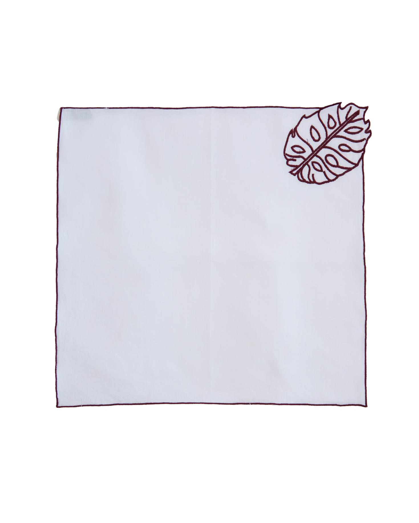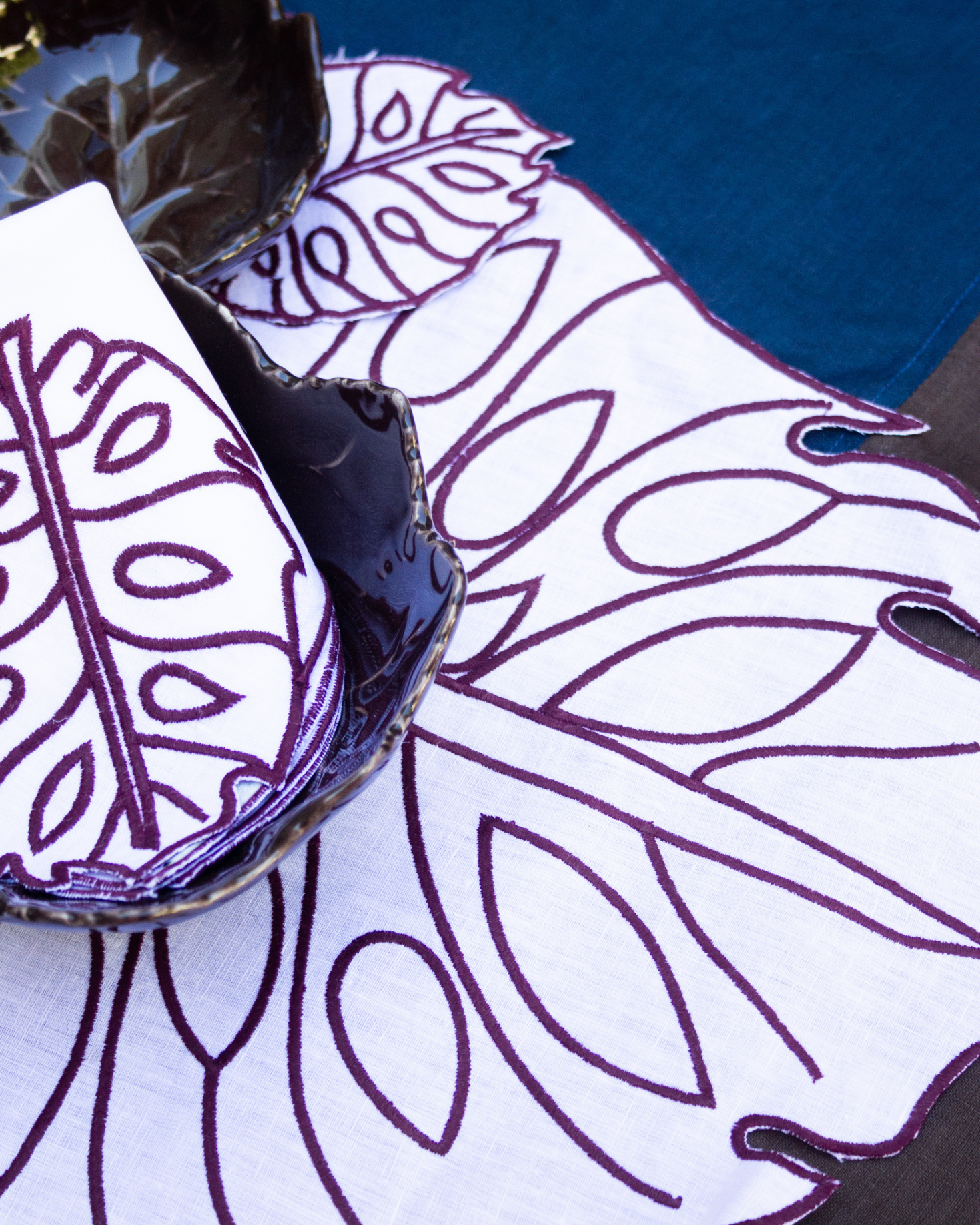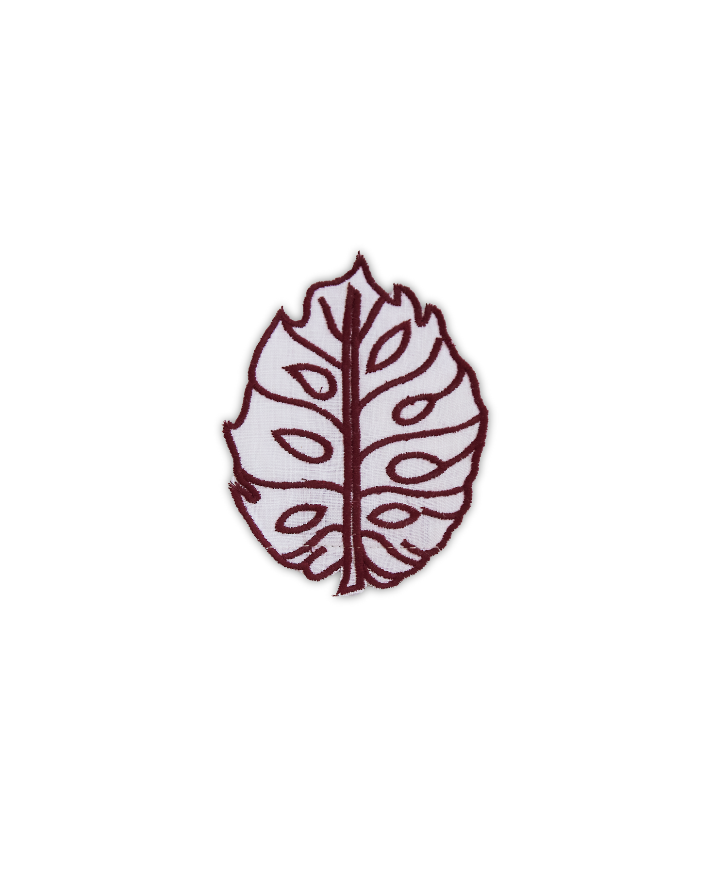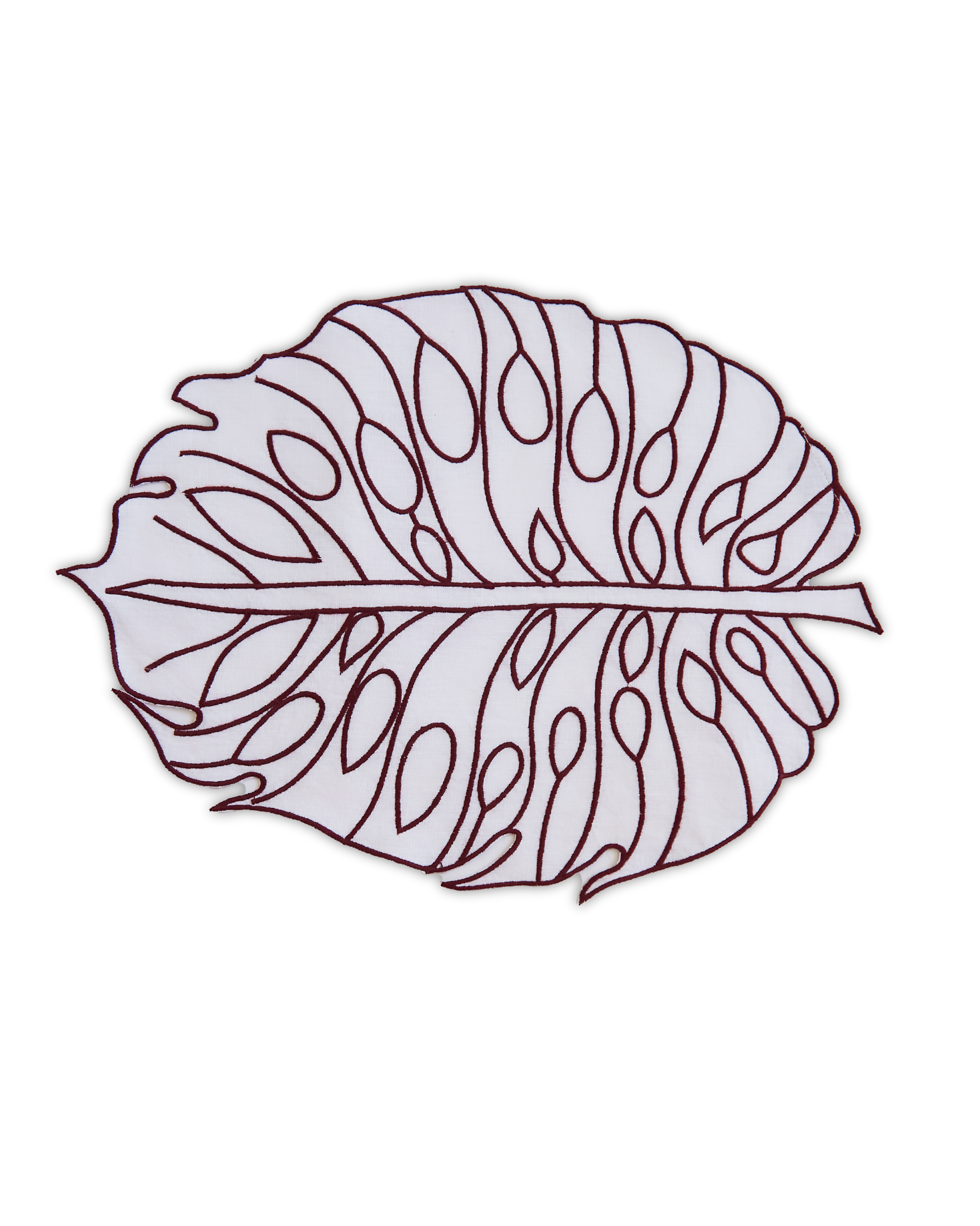 Individual set, napkin and coaster with leaf design. Made of 100% linen, embroidered in burgundy color.