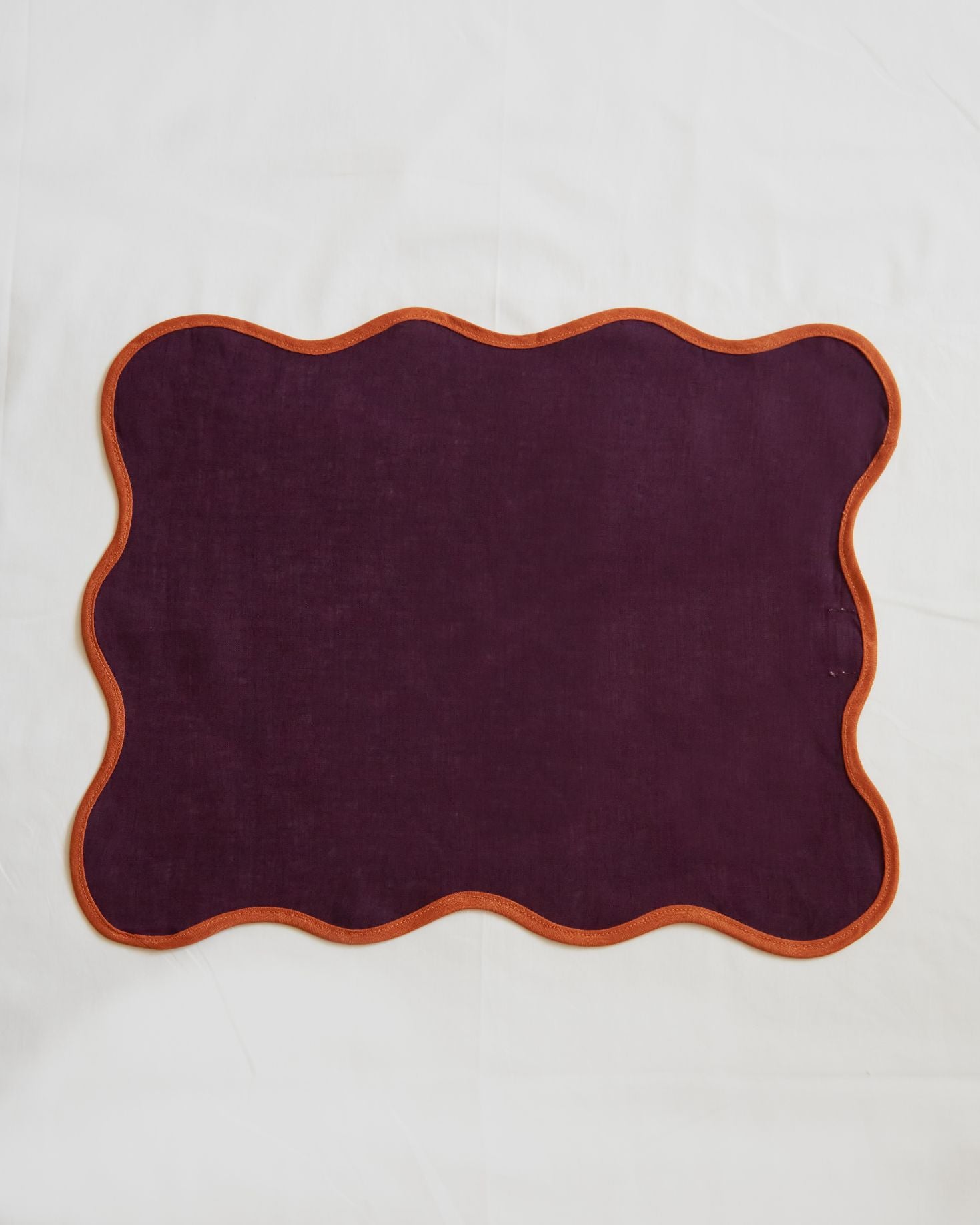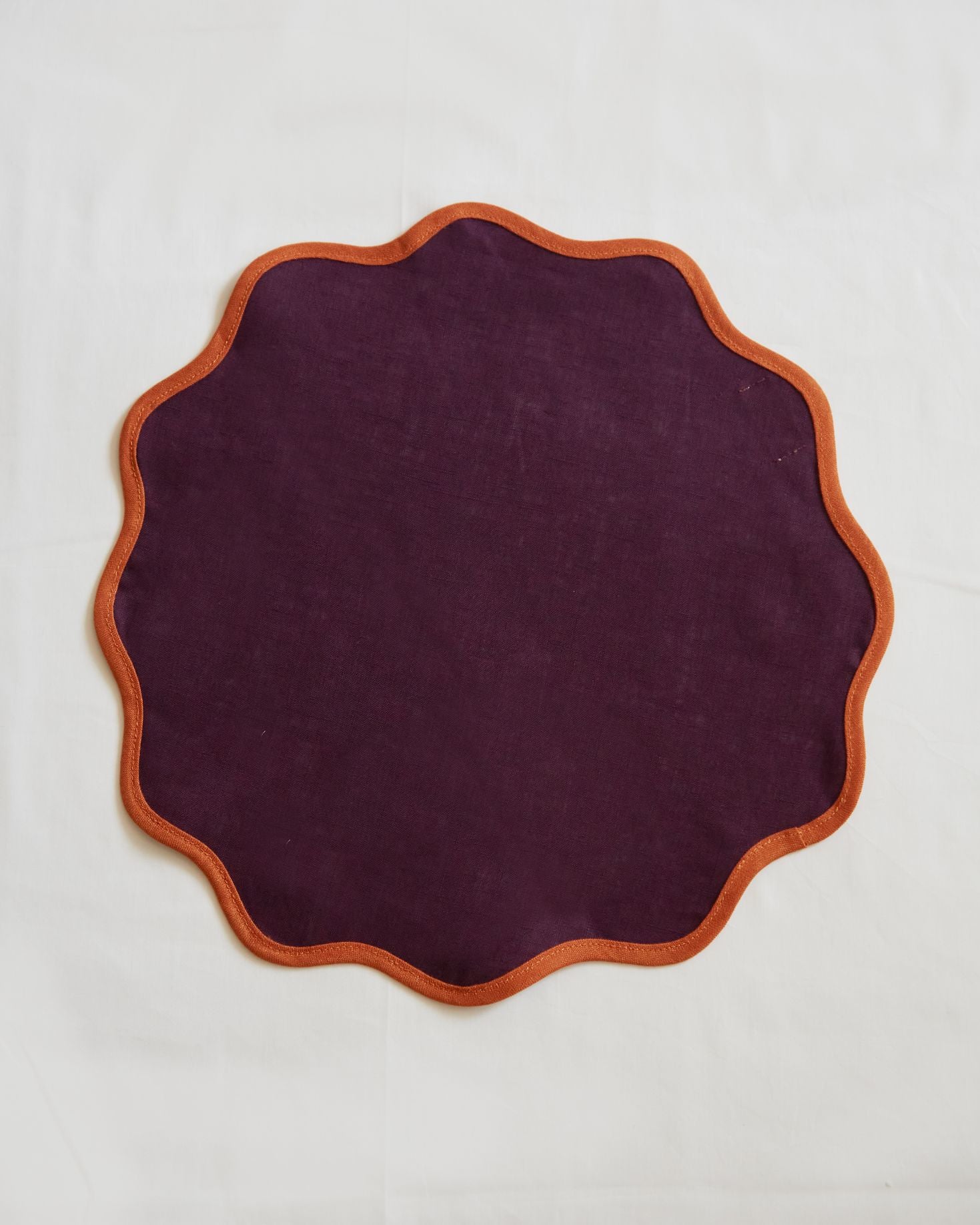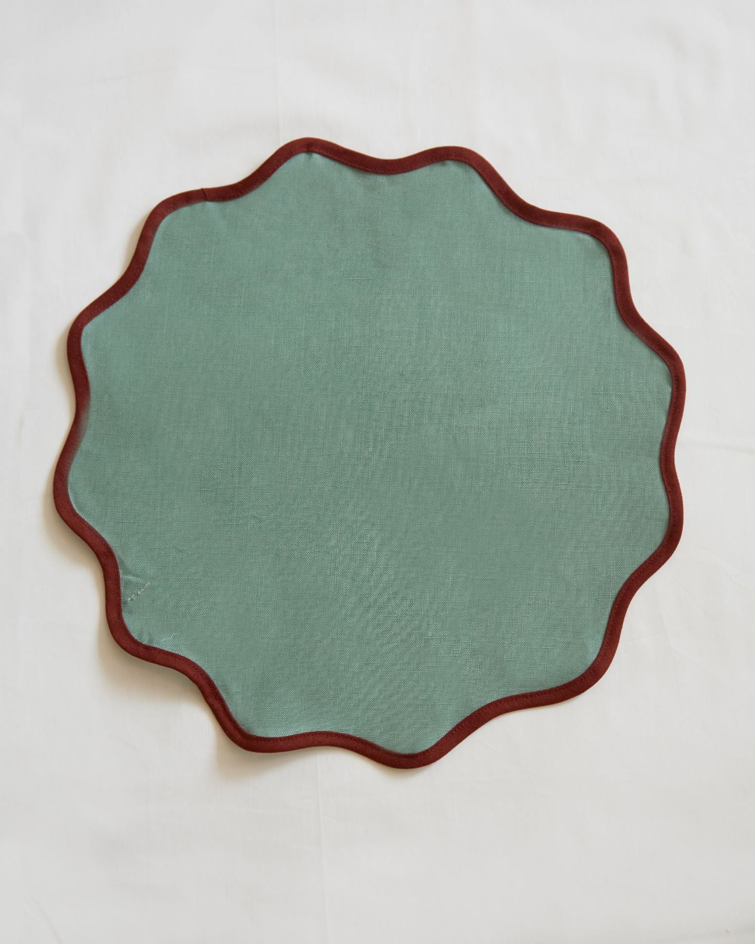 Individual rectangular set and round wavy napkin with scalloped edge, available in a wide variety of colors.