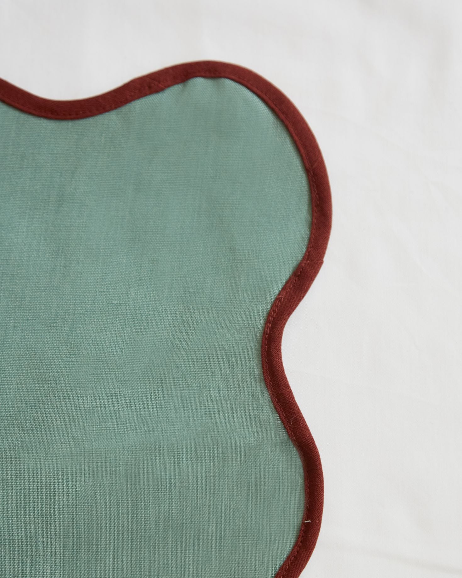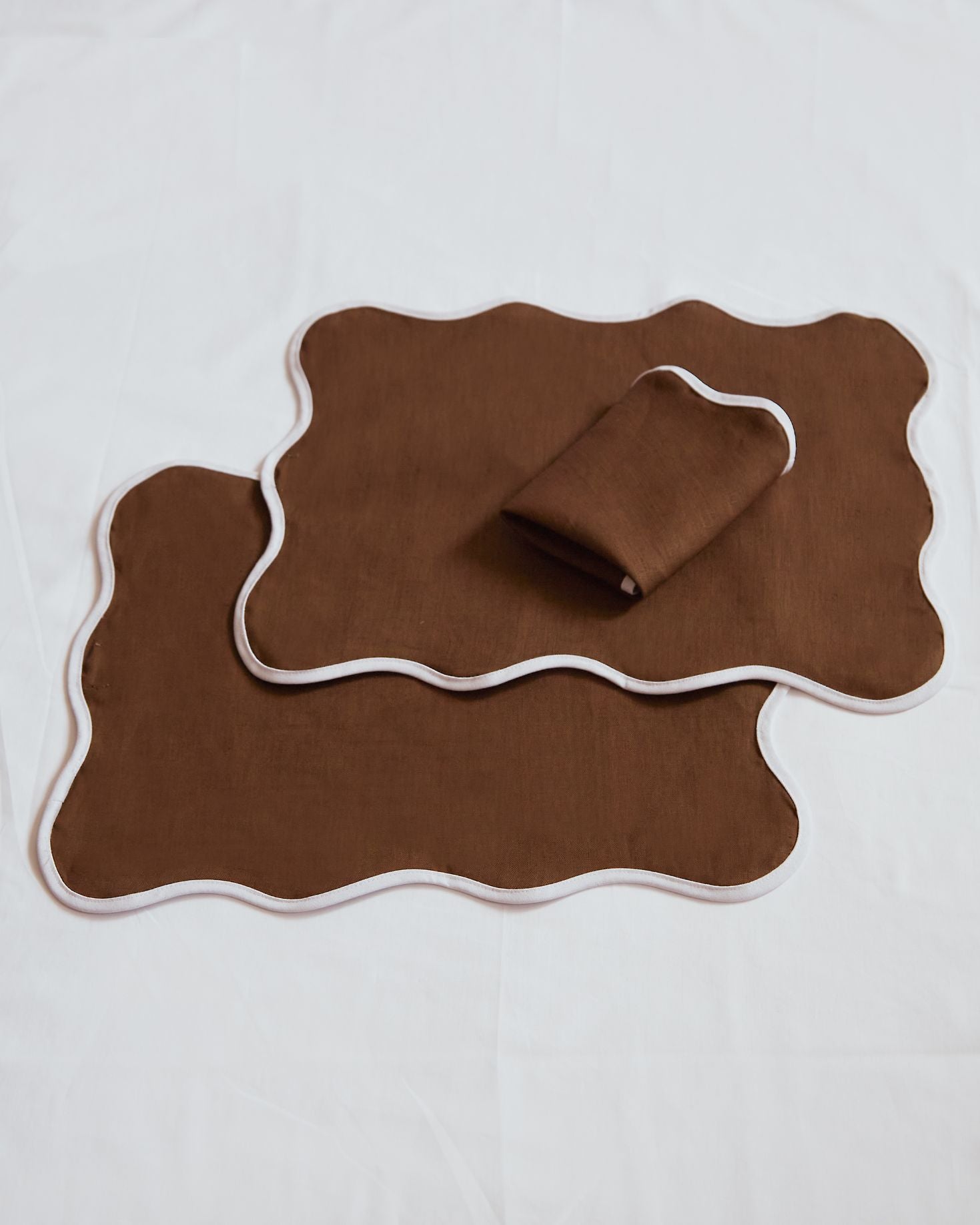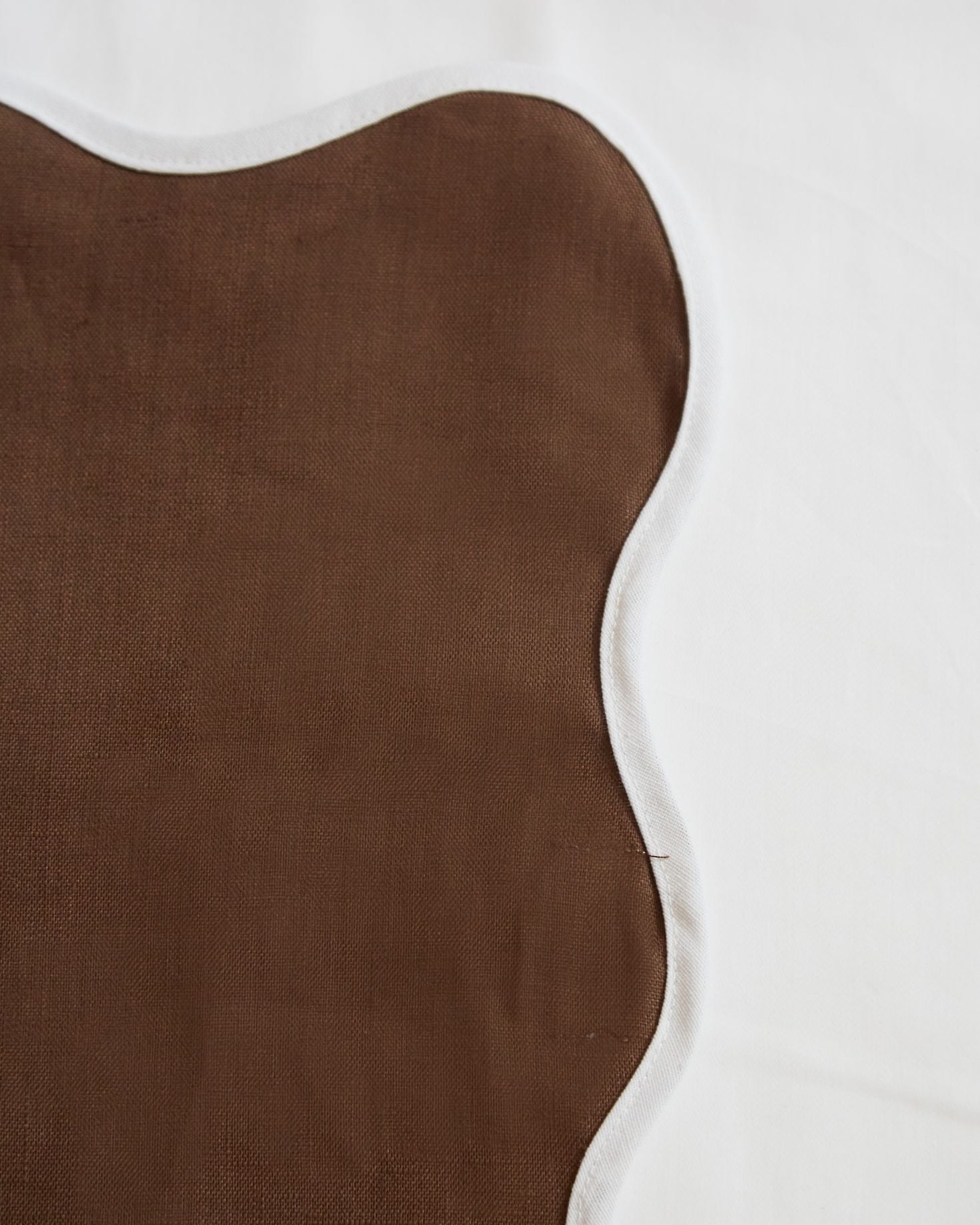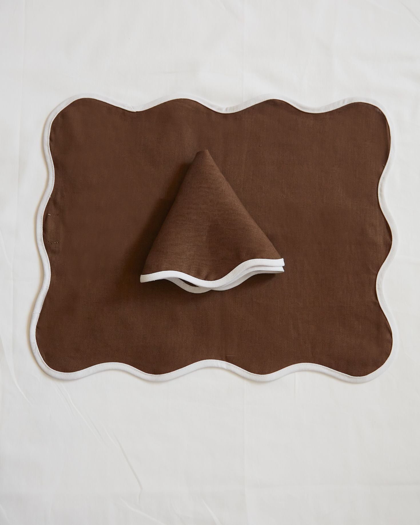 Individual rectangular set and round wavy napkin with scalloped edge, available in a wide variety of colors.