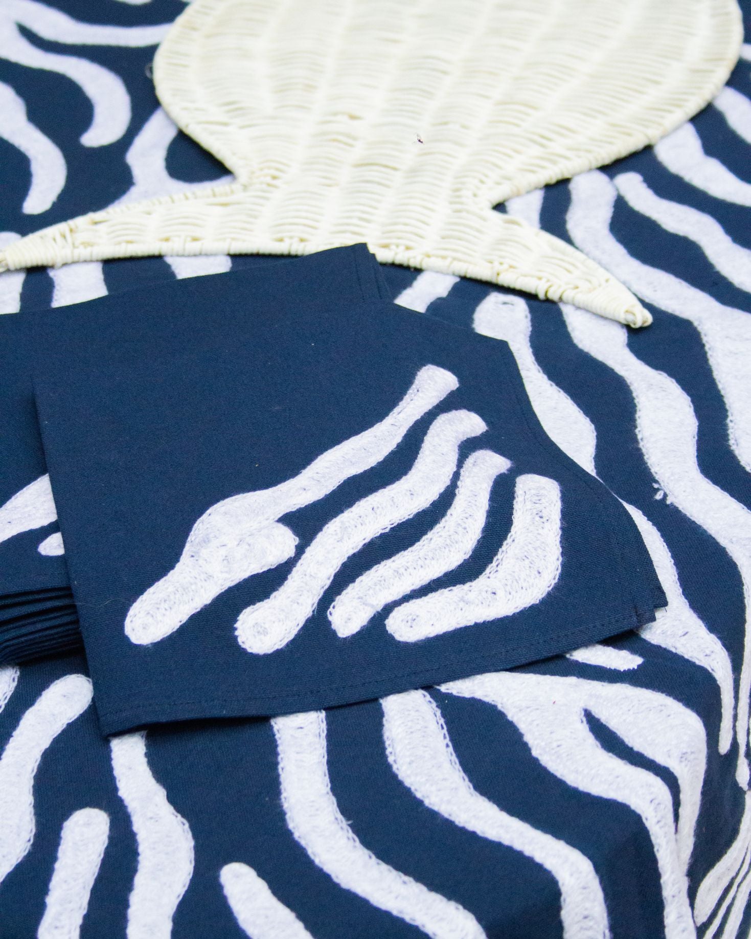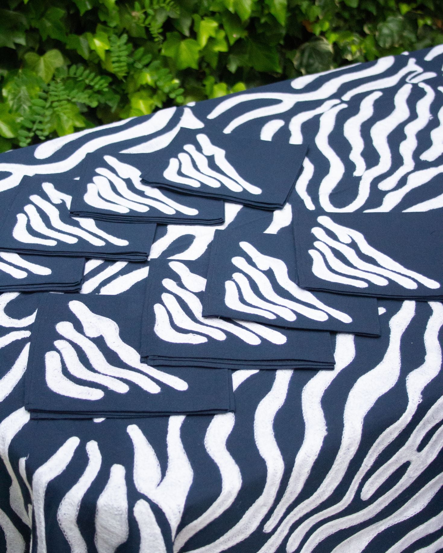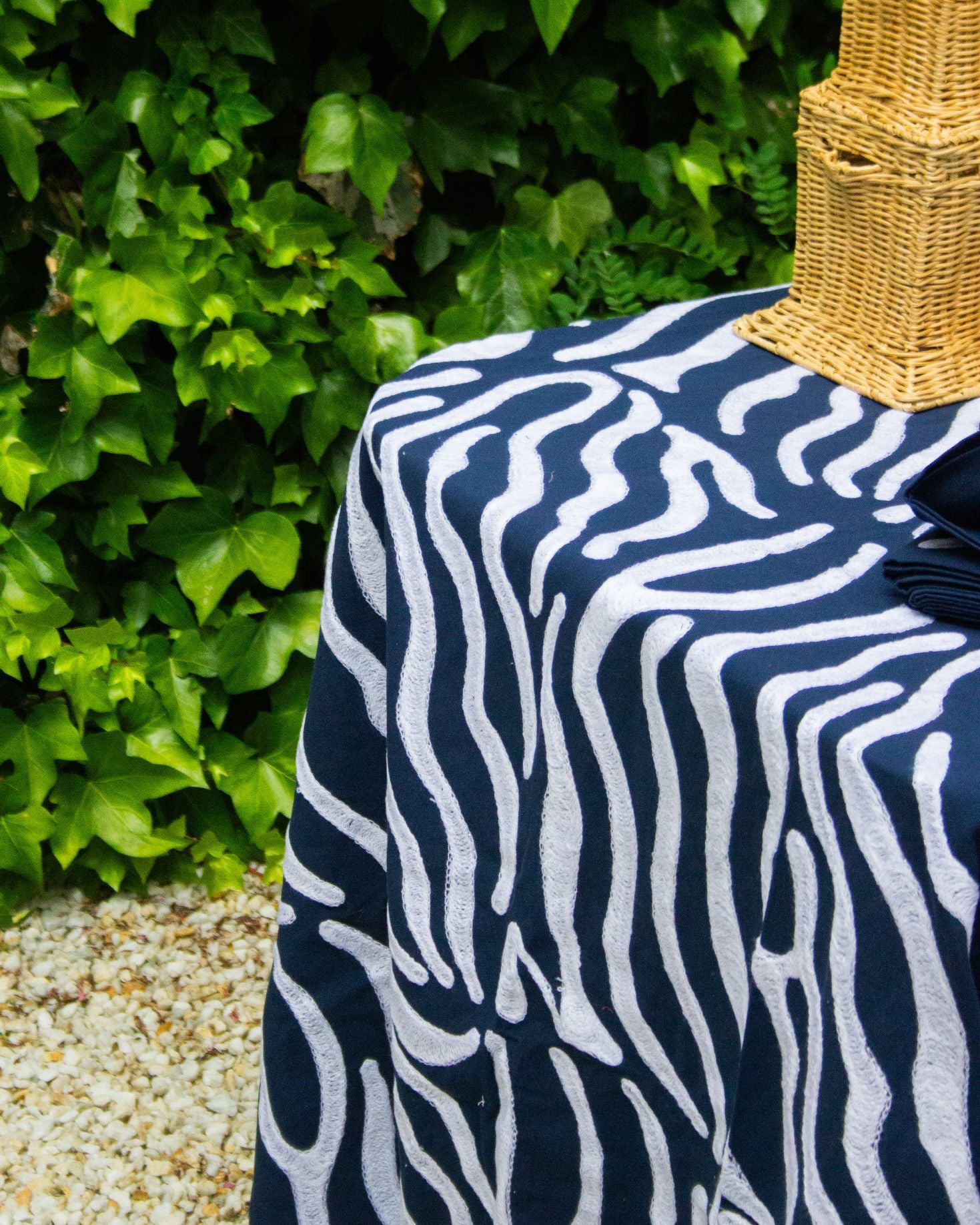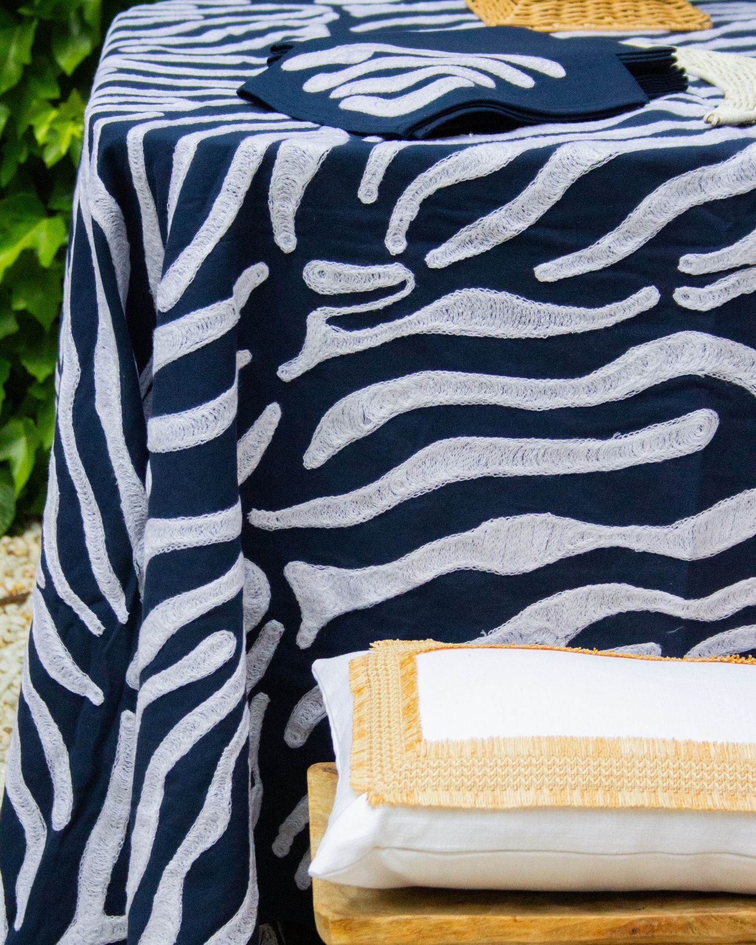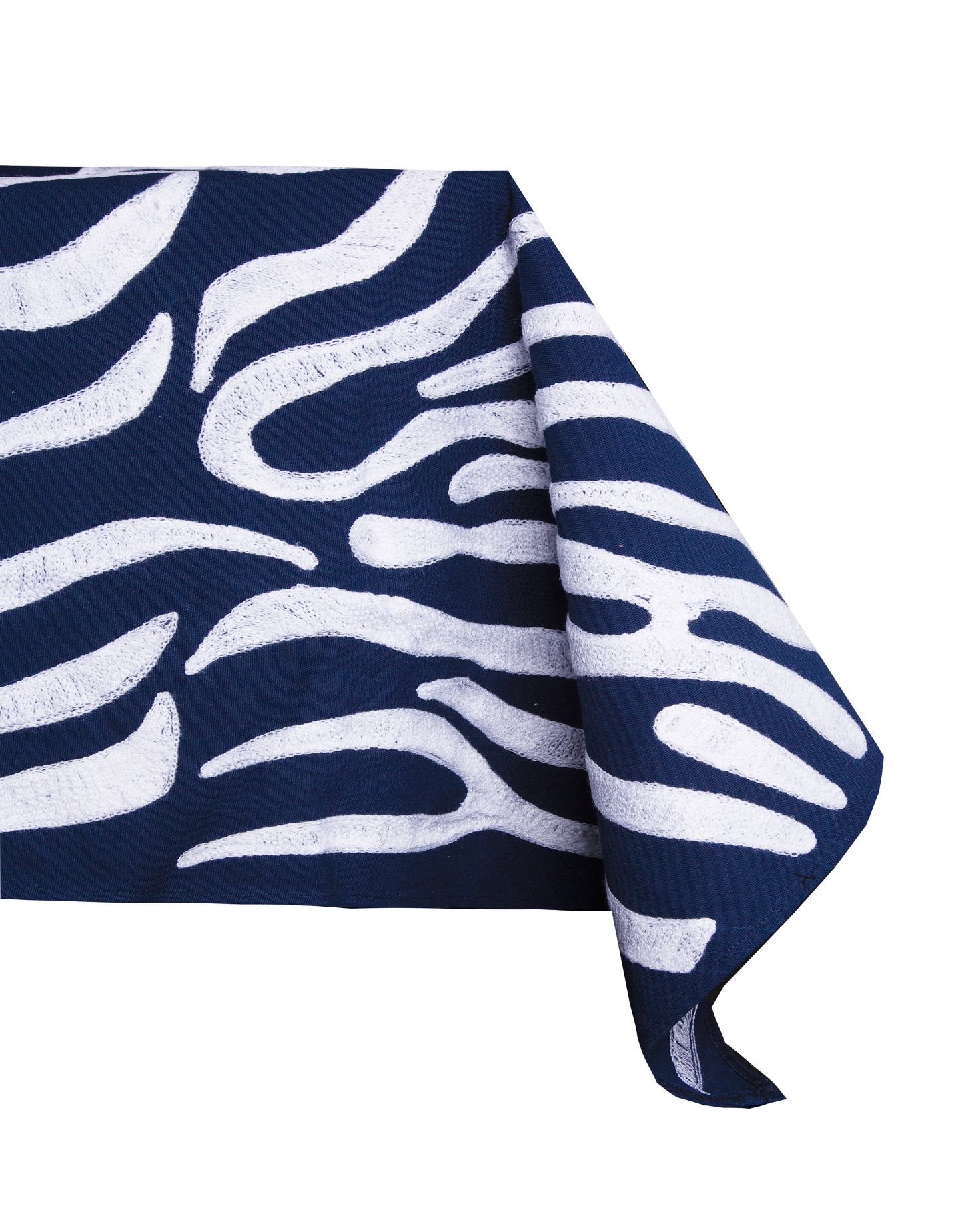 Rectangular cotton tablecloth with a red and beige striped print. Printed ruffle detail. Also available in blue and black.