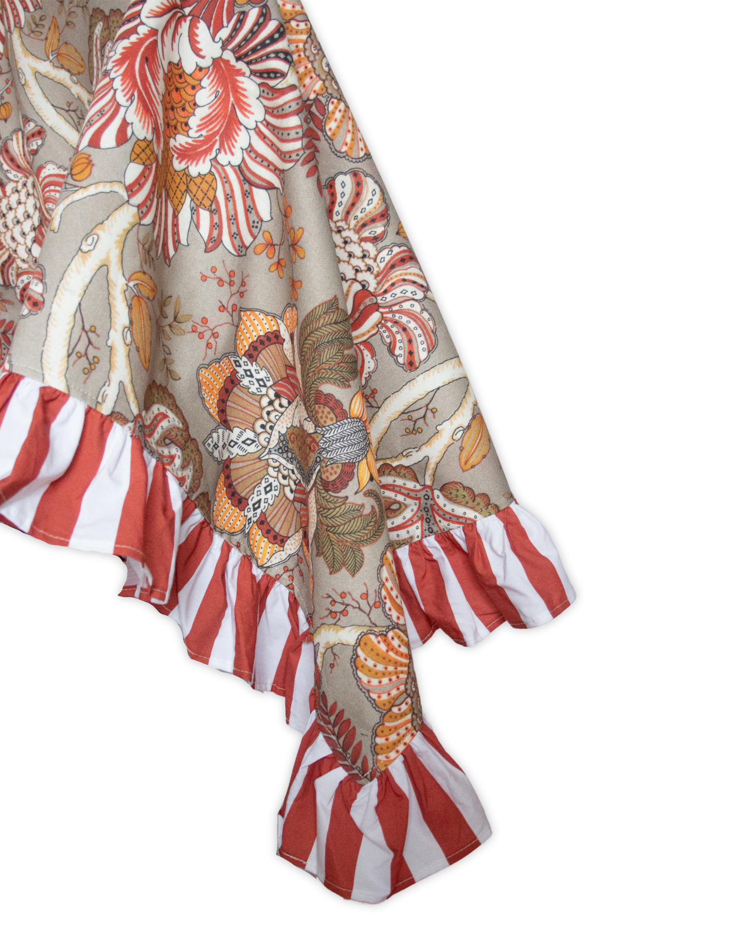 Gray and teal square tablecloth made from 100% cotton with a floral print. Ruffle detail with a white and teal stripe print. Also available in green stripes.